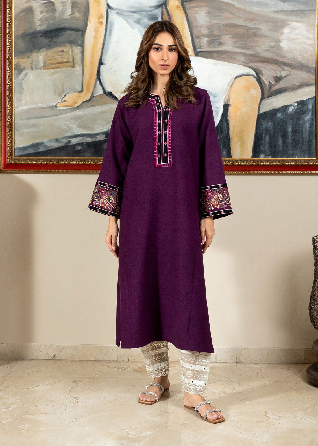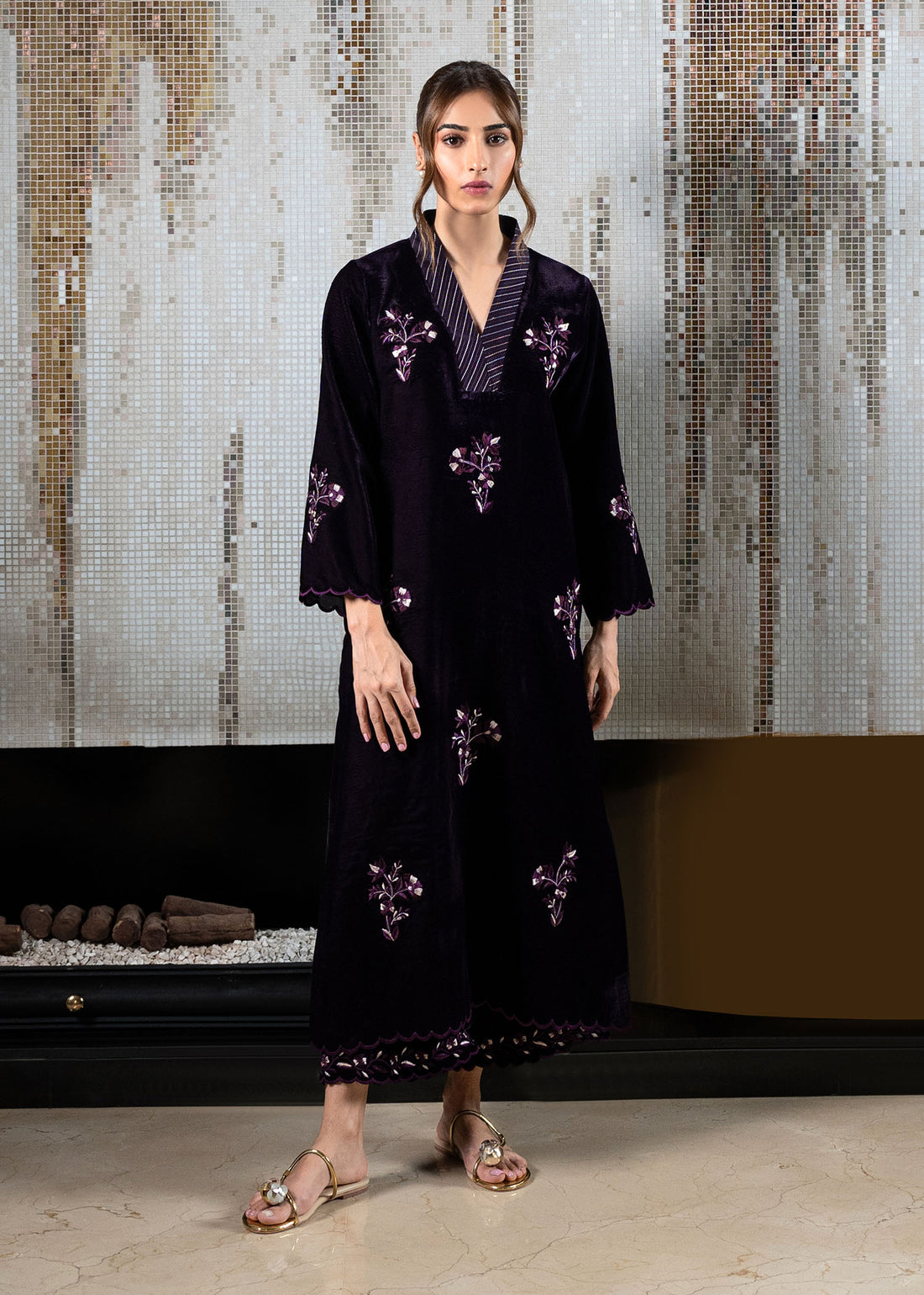 Indulge in timeless sophistication with our exquisite dark purple velvet kurta, elegantly embroidered with tonal...