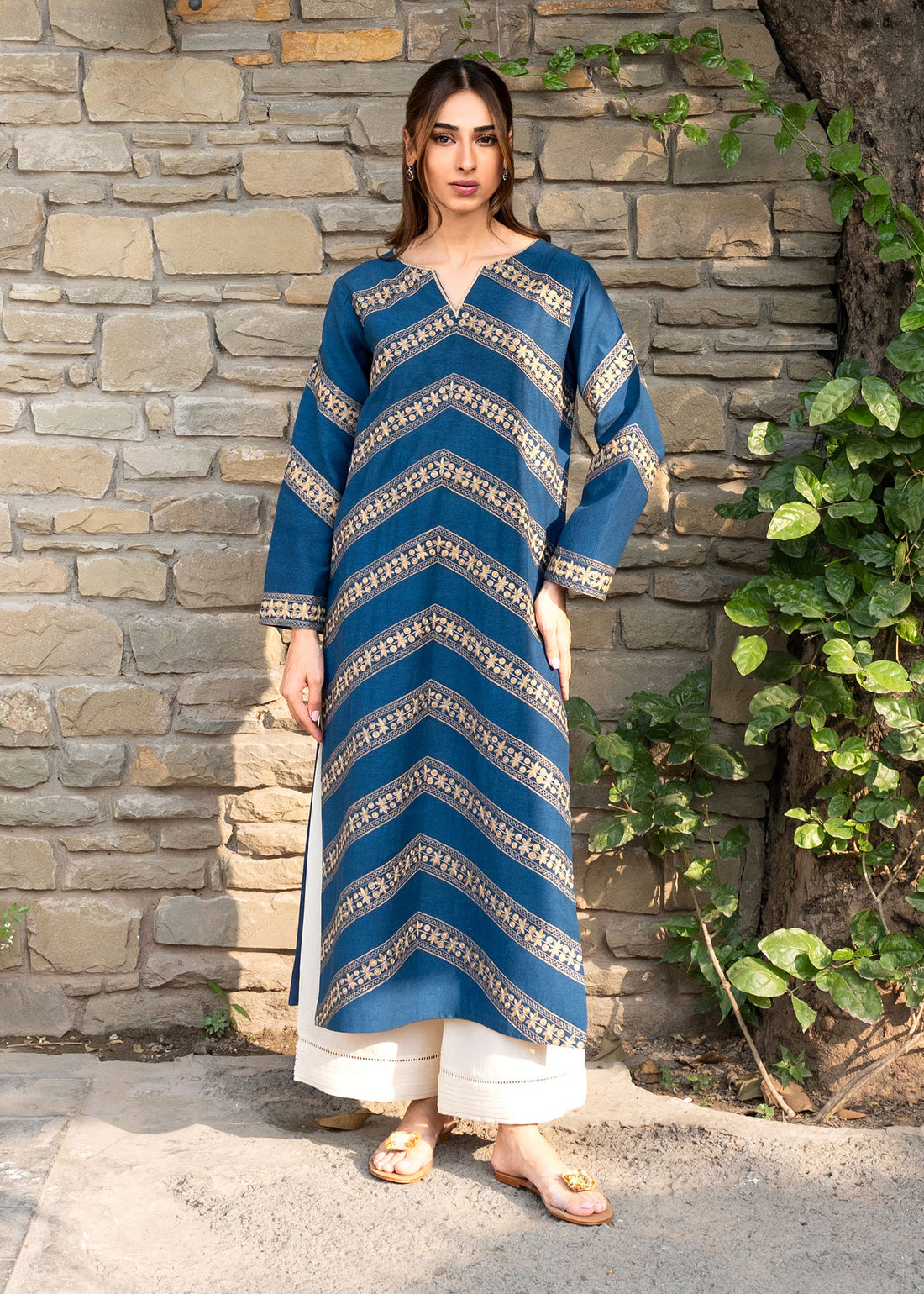 Pure Karandi meets artisanal charm in our Rooz kurta. Geometric patterns dance in colorful tones,...