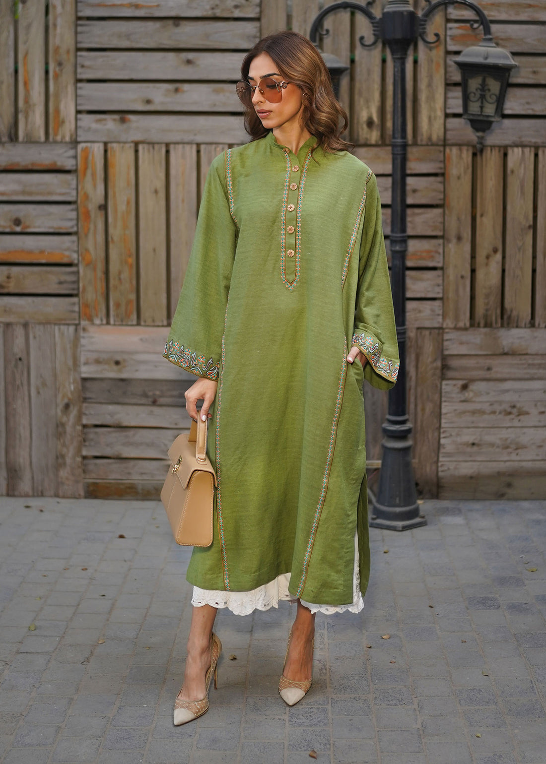 Pure Karandi fabric, timeless olive hue, and delicate embroidery come together in perfect harmony. Our...