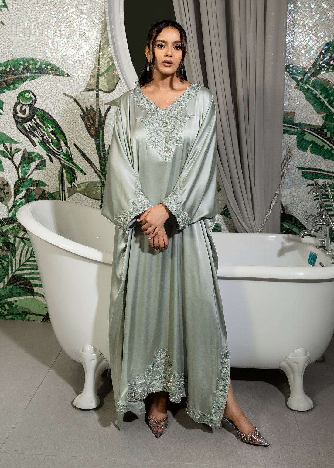 This kaftan brings understated luxury to your wardrobe with its rich steel grey hue and...