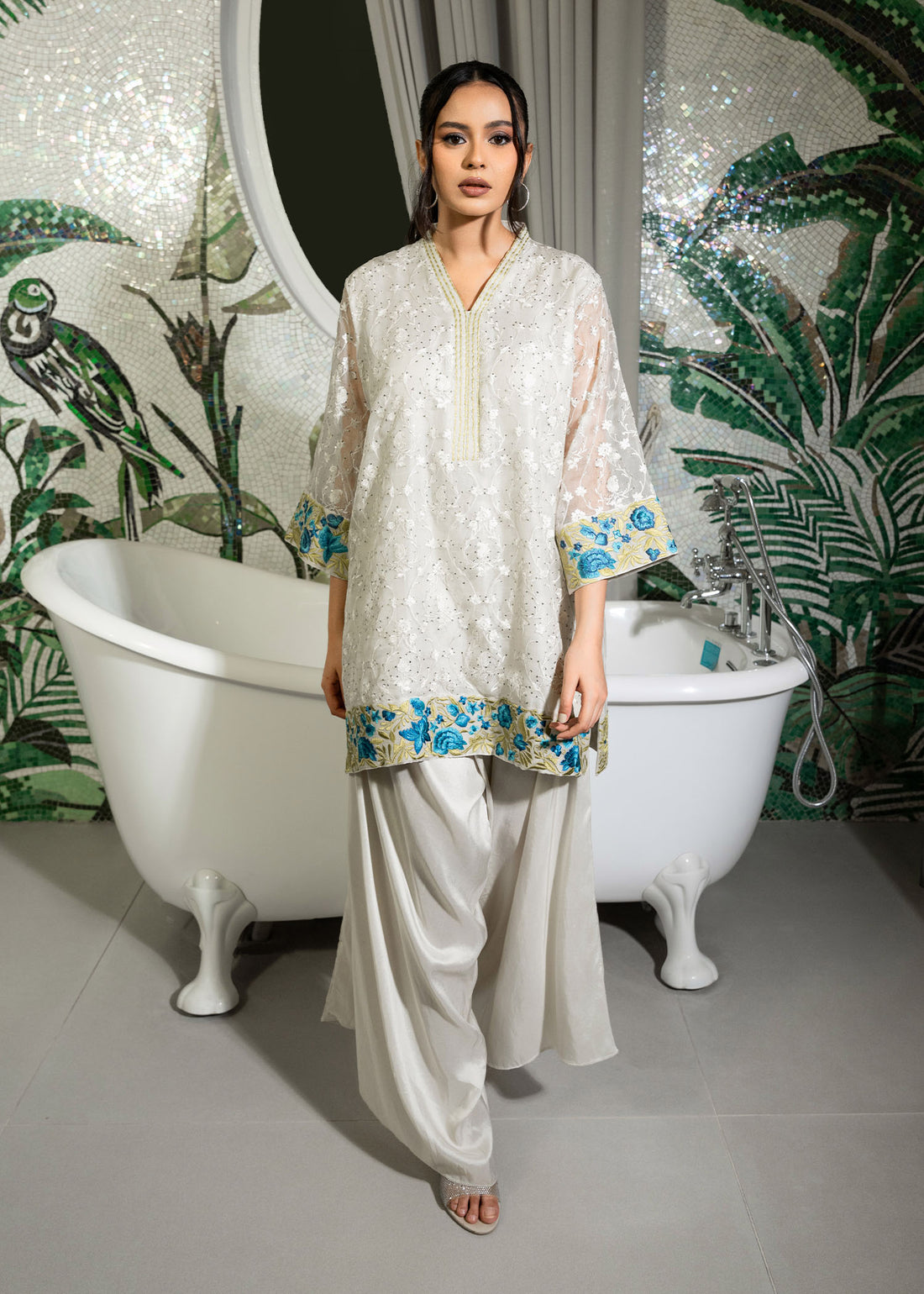 Unveil the enchantress within with our ethereal ivory organza kurta, graced with mystical floral embroidery....