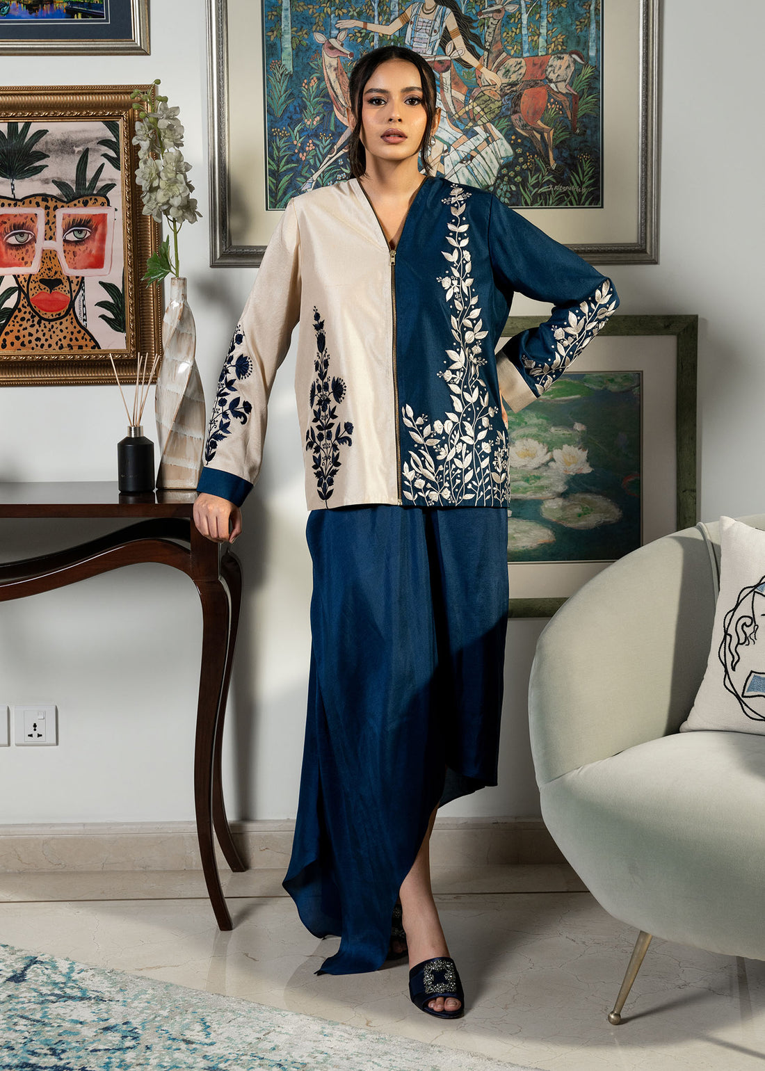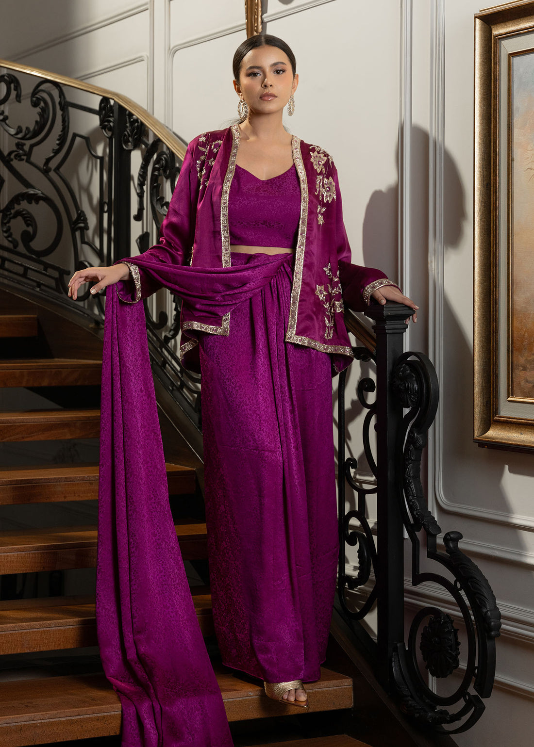 Step into luxury with the Mahrou ensemble, crafted from lustrous pure silk charmeuse. This striking...
