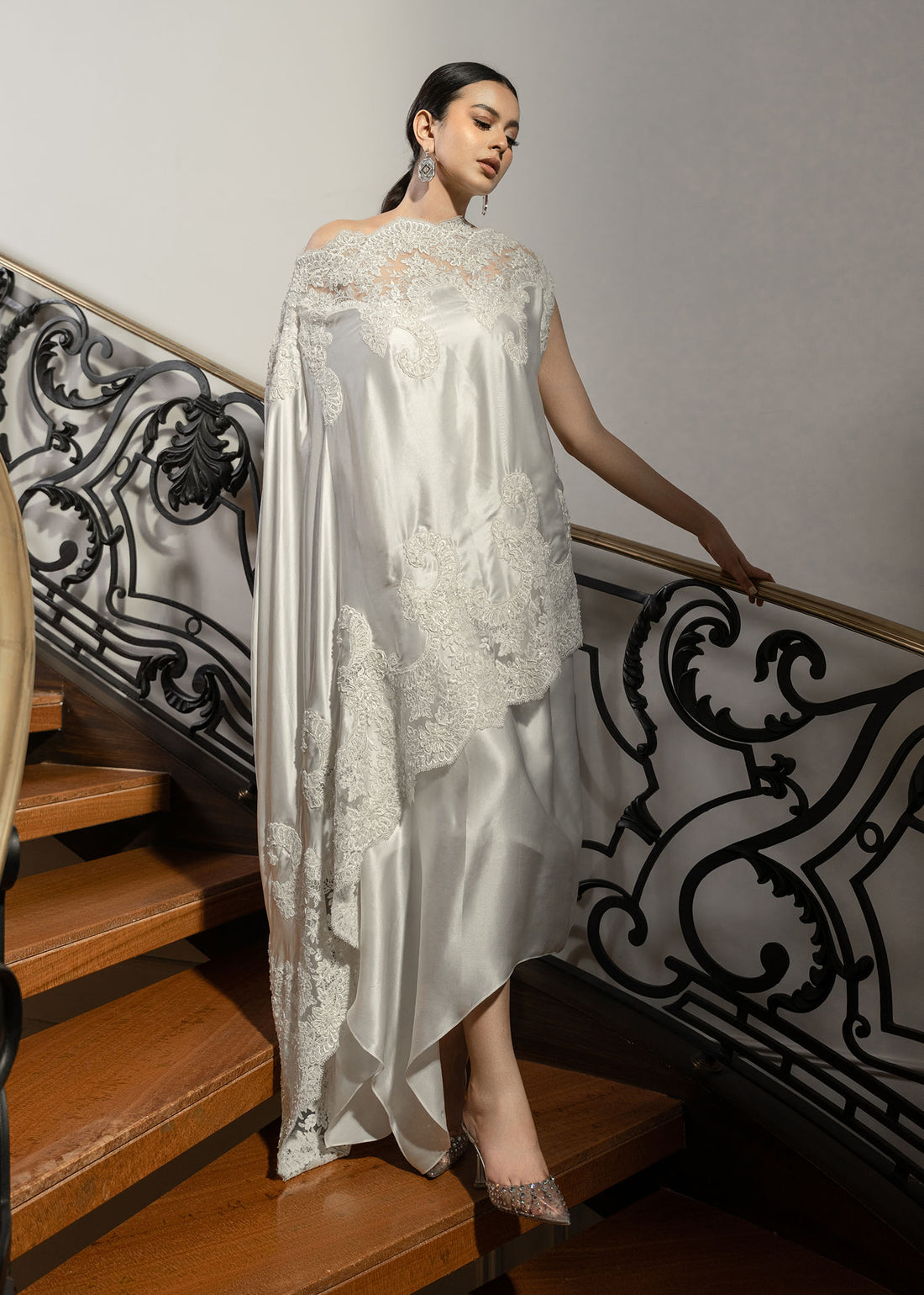 Discover the beauty of silk in this exquisite set: Off-shoulder tunic in ivory hue featuring...