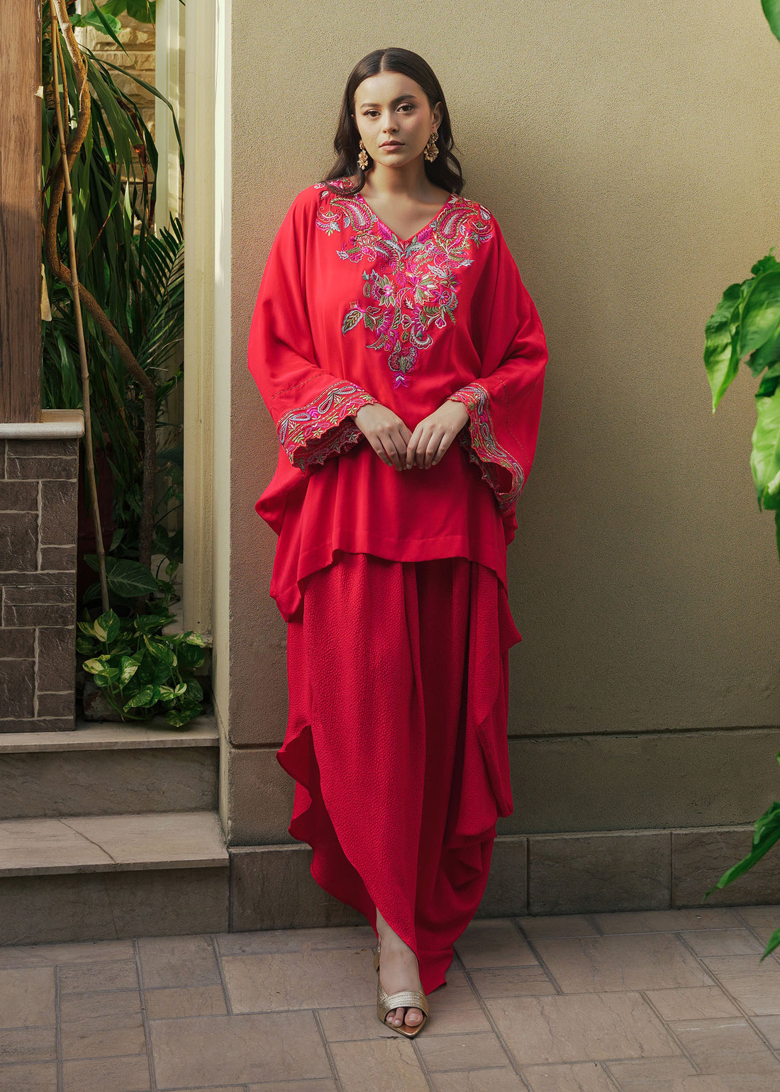 Turn heads with our bold red pleated skirt set. Anti-fit crepe top with vibrant multicoloured...