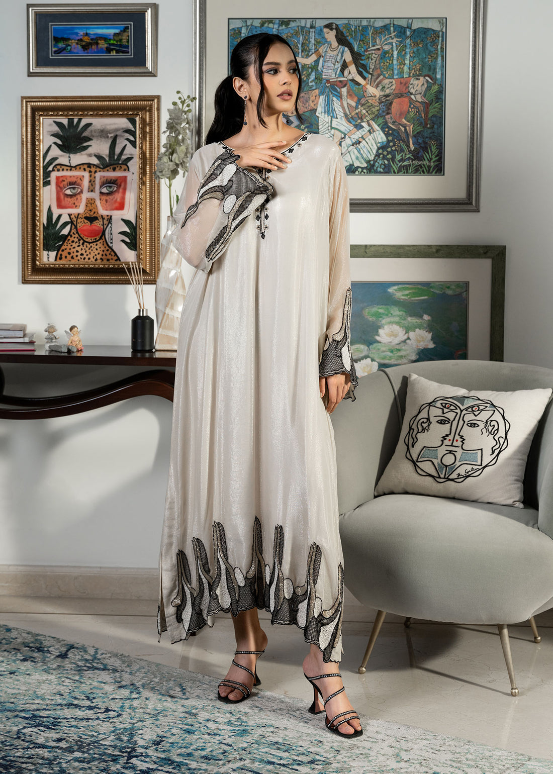 Simple yet stunning, this shimmery chiffon kaftan features timeless hand work in jewel tones. Ivory...