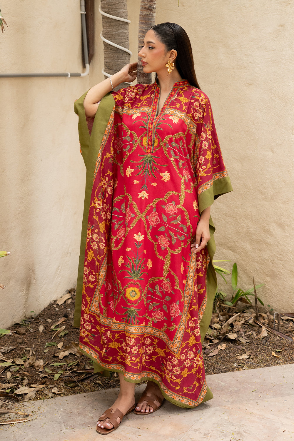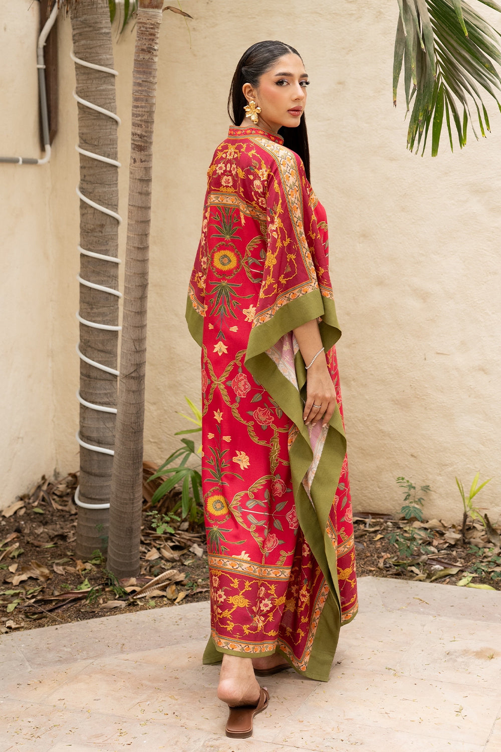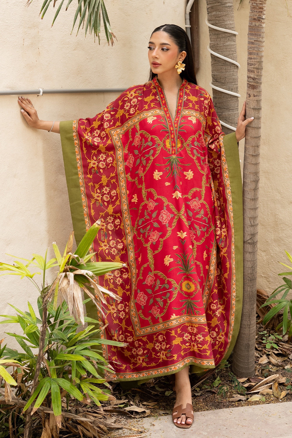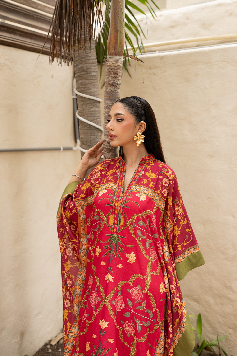 Find your coastal retreat in the Amila Kaftan. This vibrant red kaftan boasts eastern floral motifs, artful patterns, and a relaxed silhouette, crafted from airy khaddi silk.