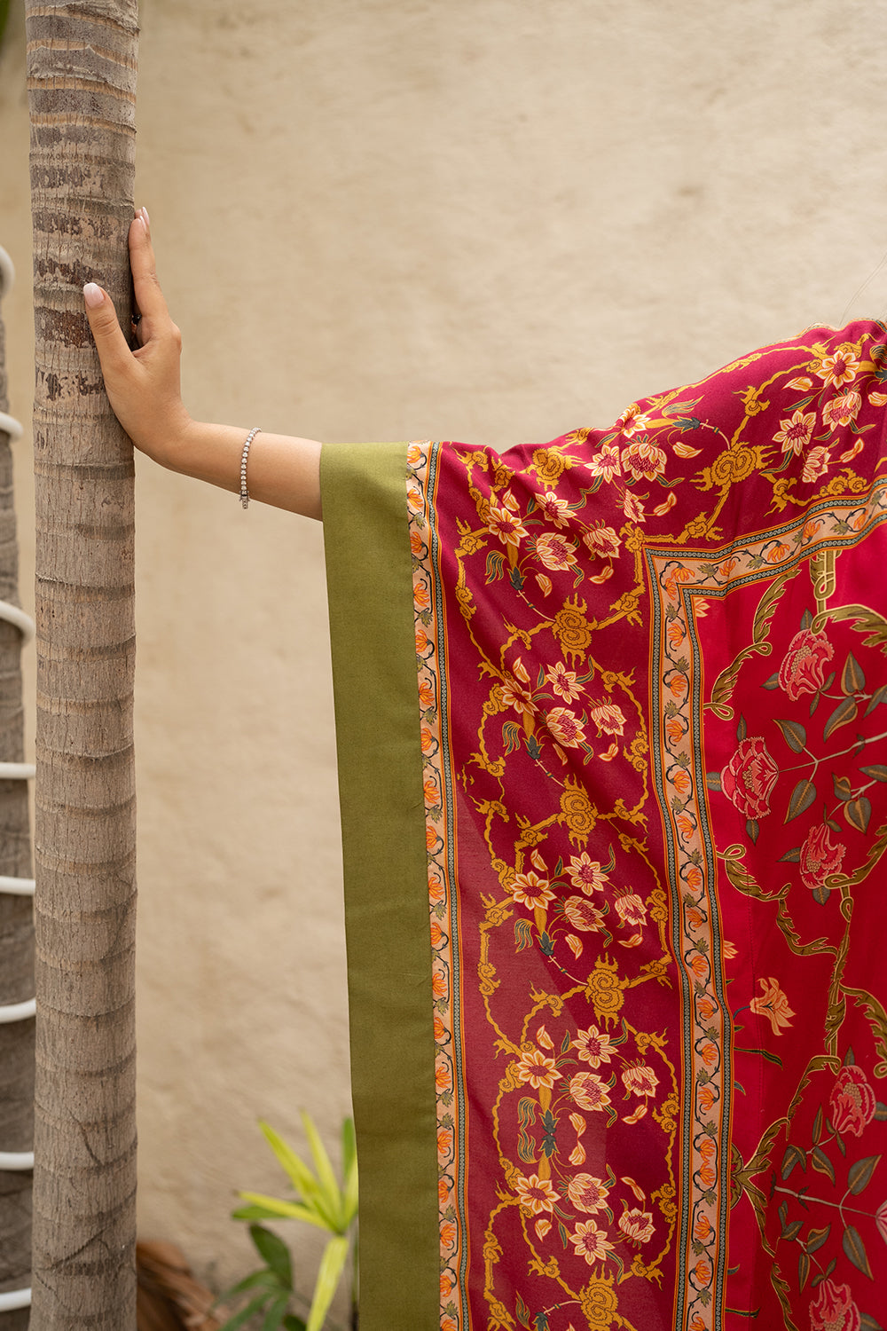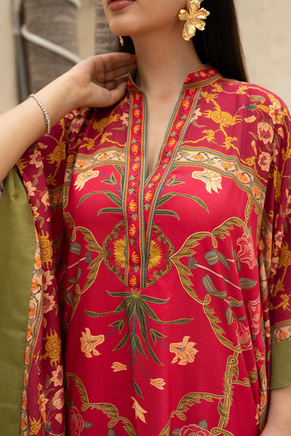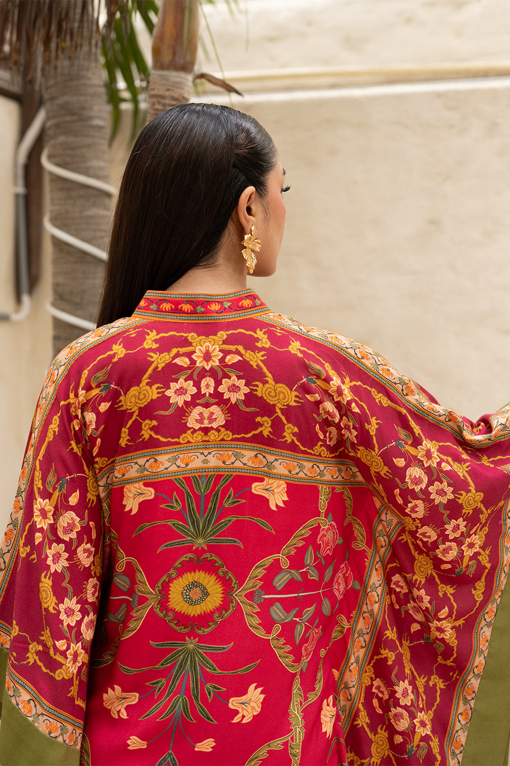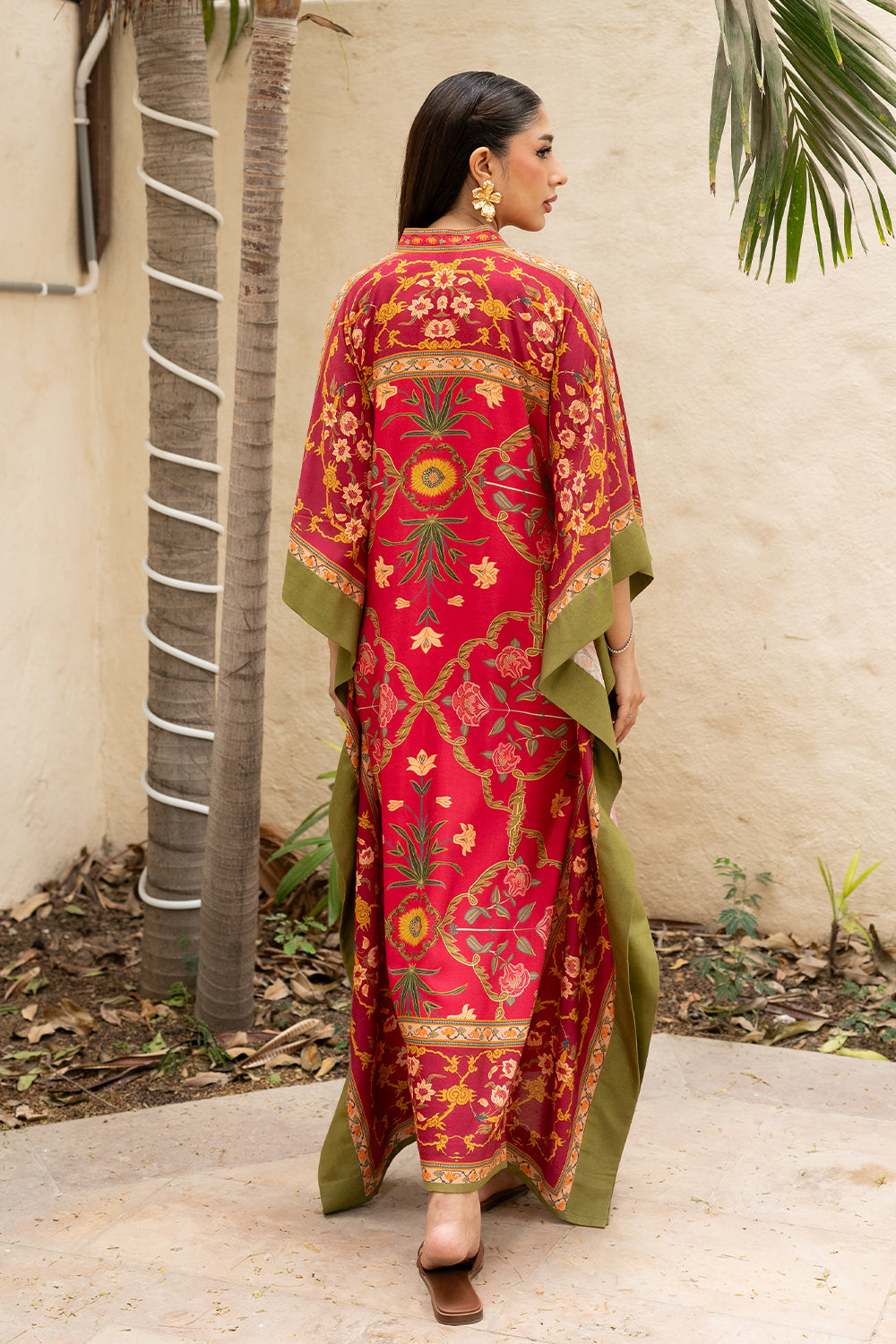Find your coastal retreat in the Amila Kaftan. This vibrant red kaftan boasts eastern floral motifs, artful patterns, and a relaxed silhouette, crafted from airy khaddi silk.