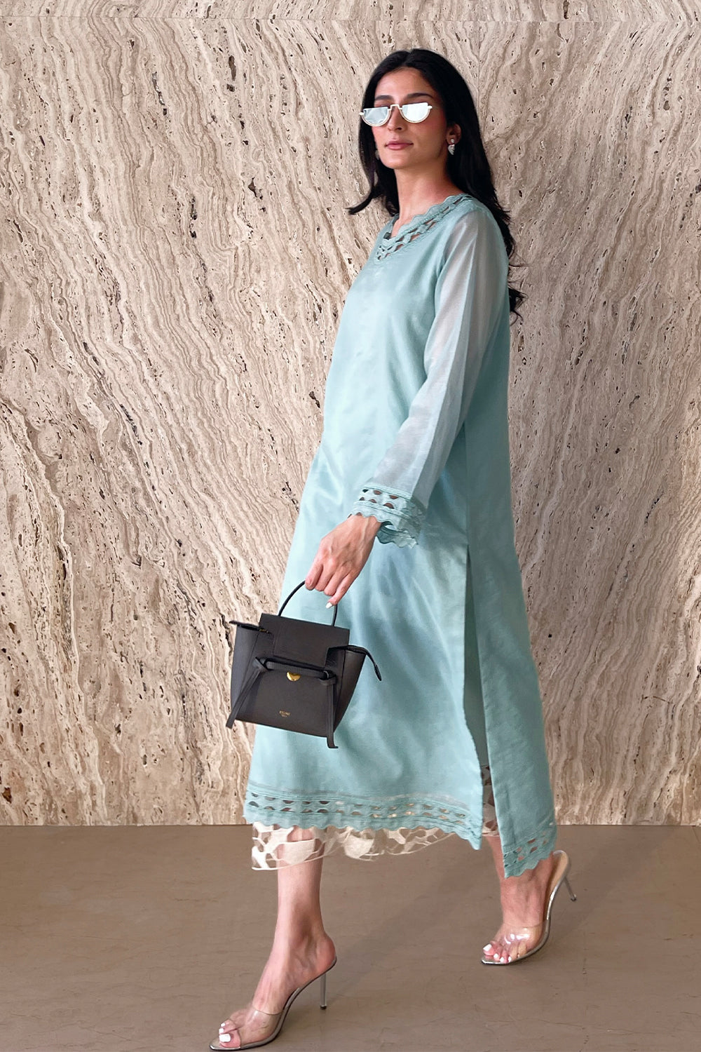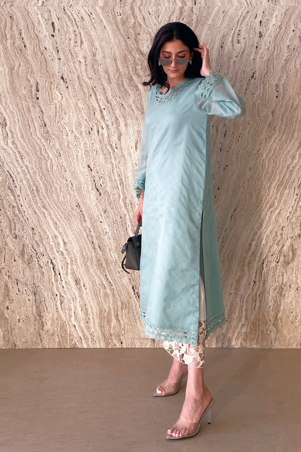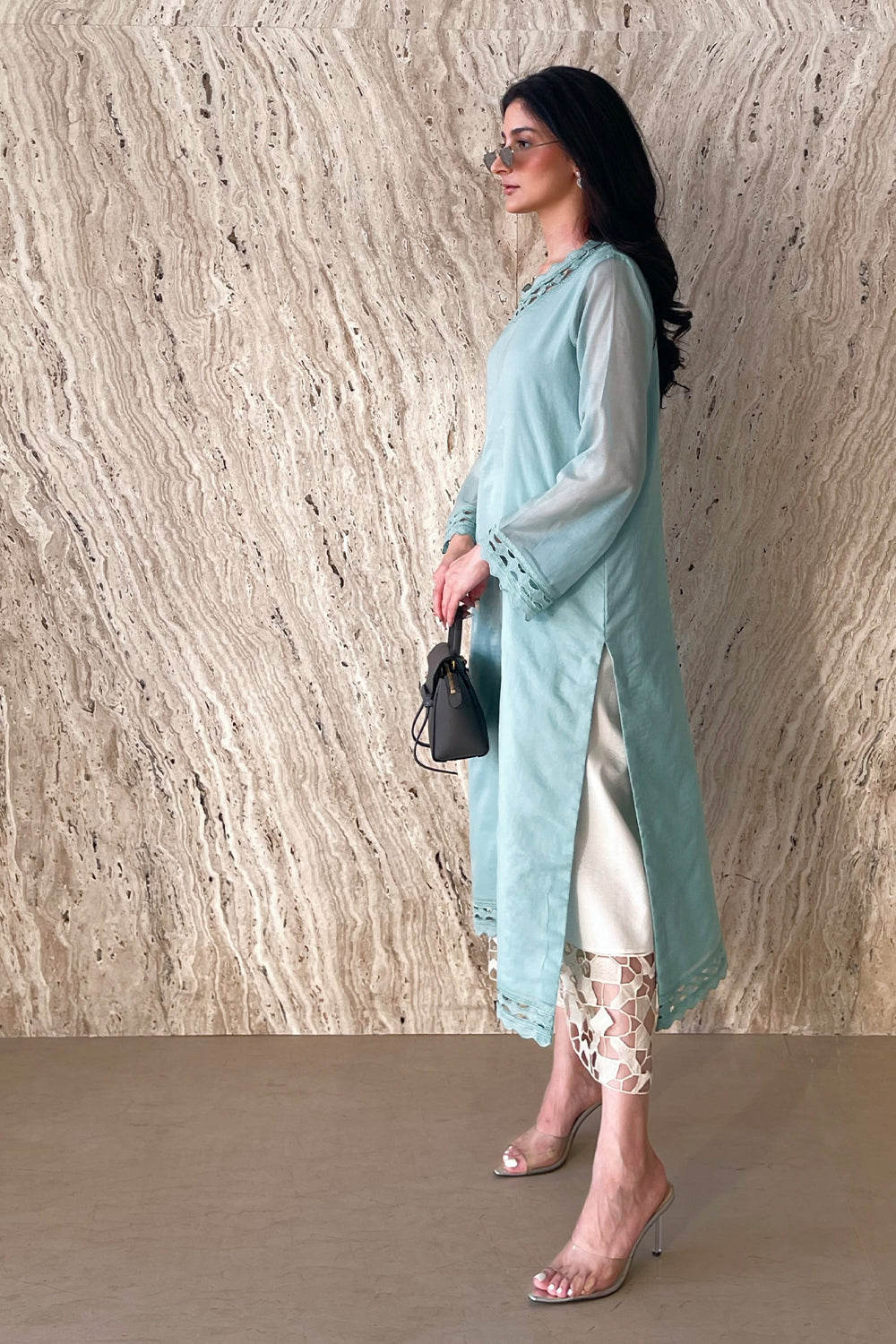 Elevate your daytime style with our Ferozi Aryana Kurta in kora cotton, featuring exquisite intricate cutwork. Ideal for lunch or tea time, pair it with our Ivory Izaar for a sophisticated look that's perfect for any time of day.