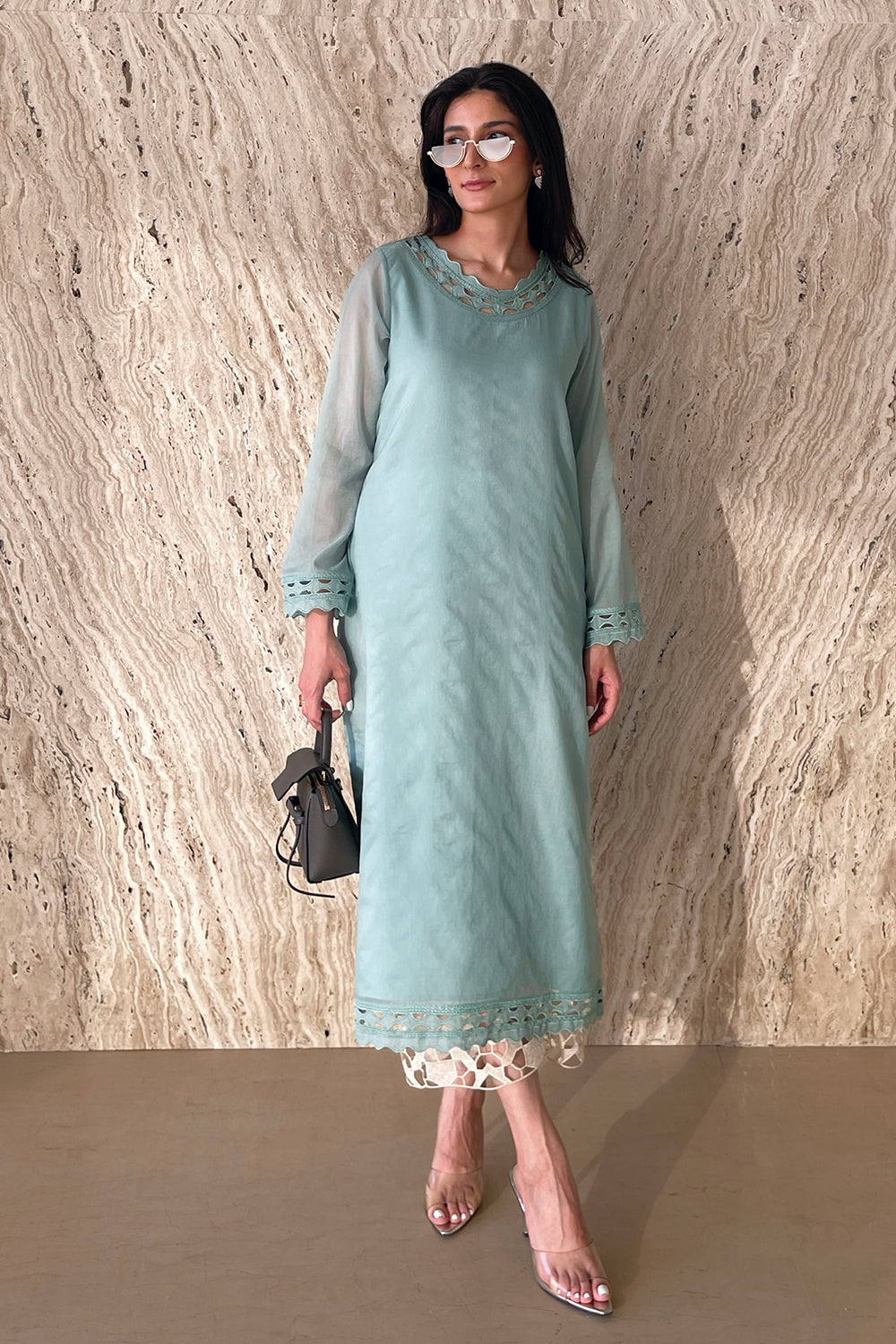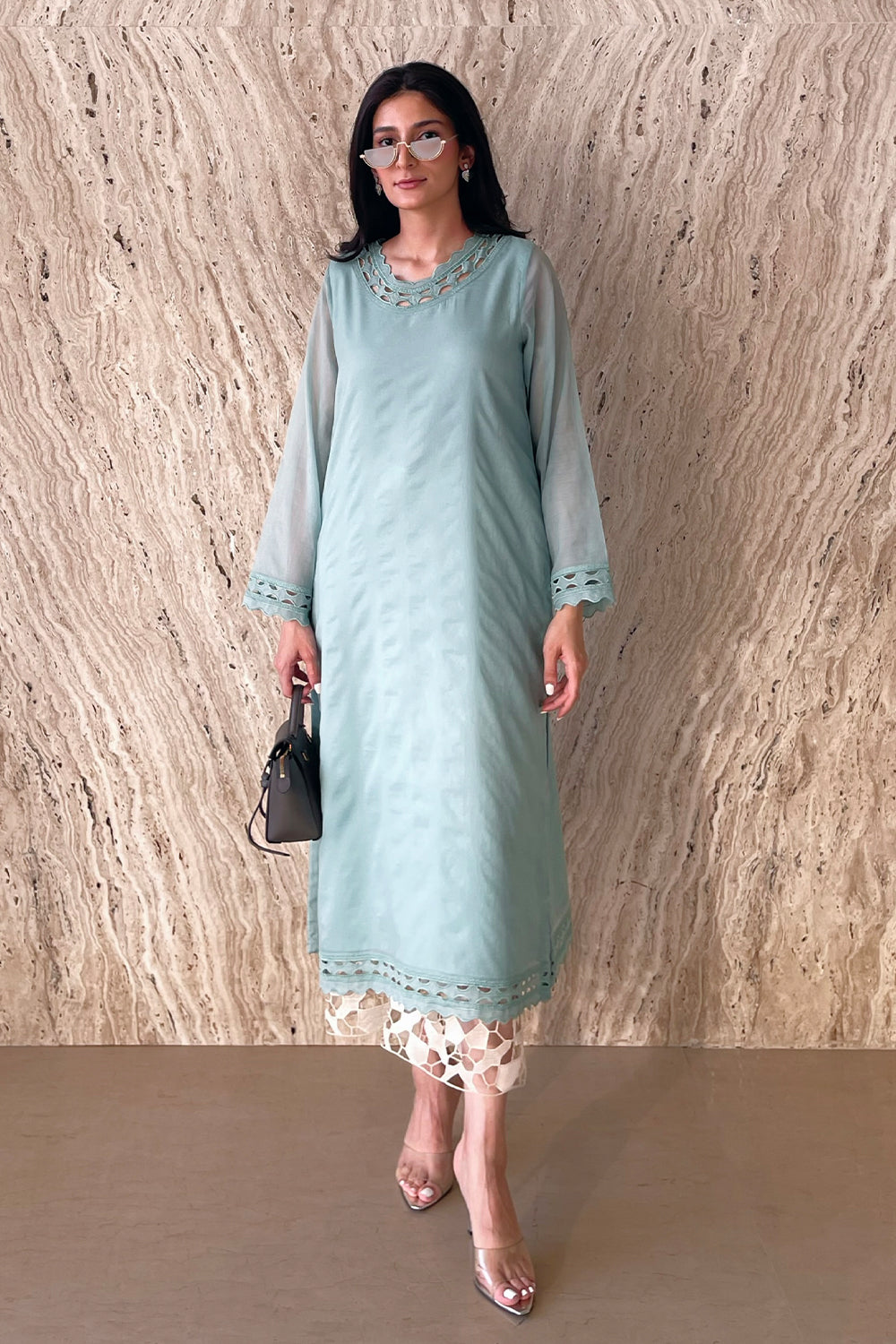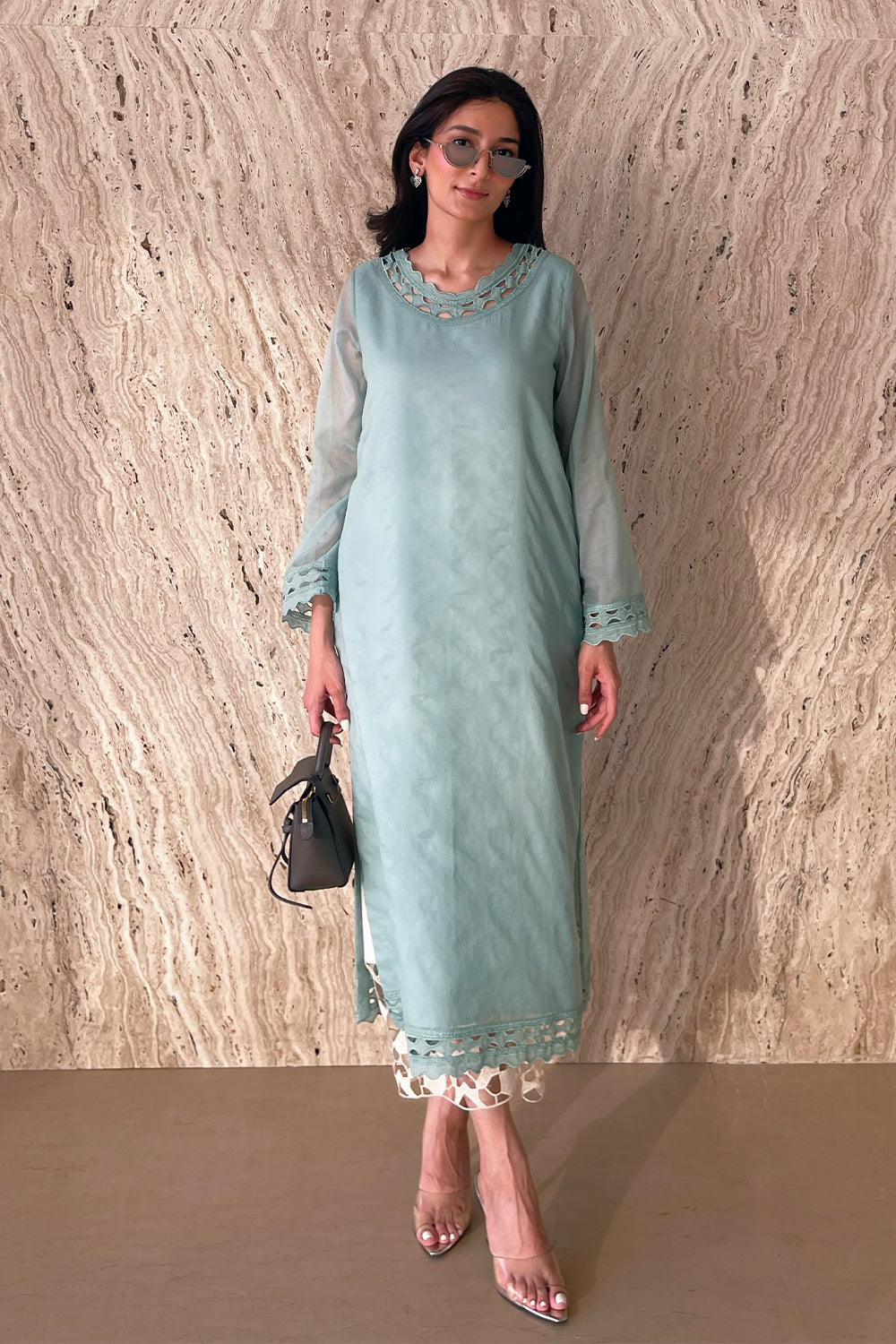 Elevate your daytime style with our Ferozi Aryana Kurta in kora cotton, featuring exquisite intricate cutwork. Ideal for lunch or tea time, pair it with our Ivory Izaar for a sophisticated look that's perfect for any time of day.