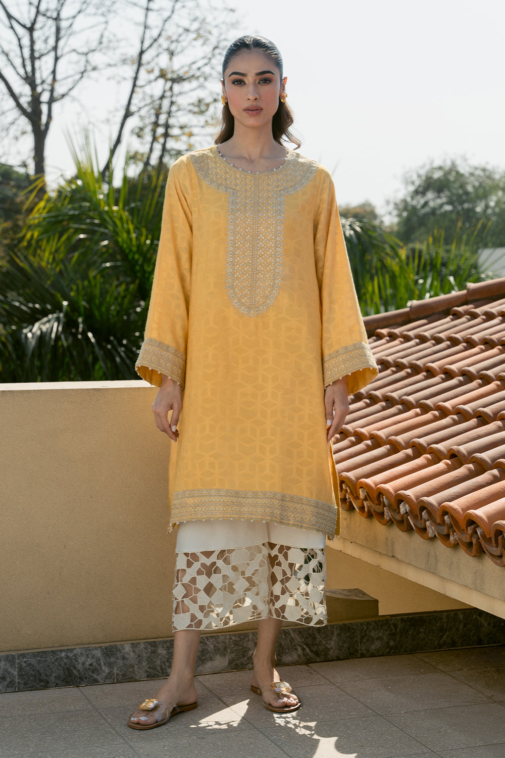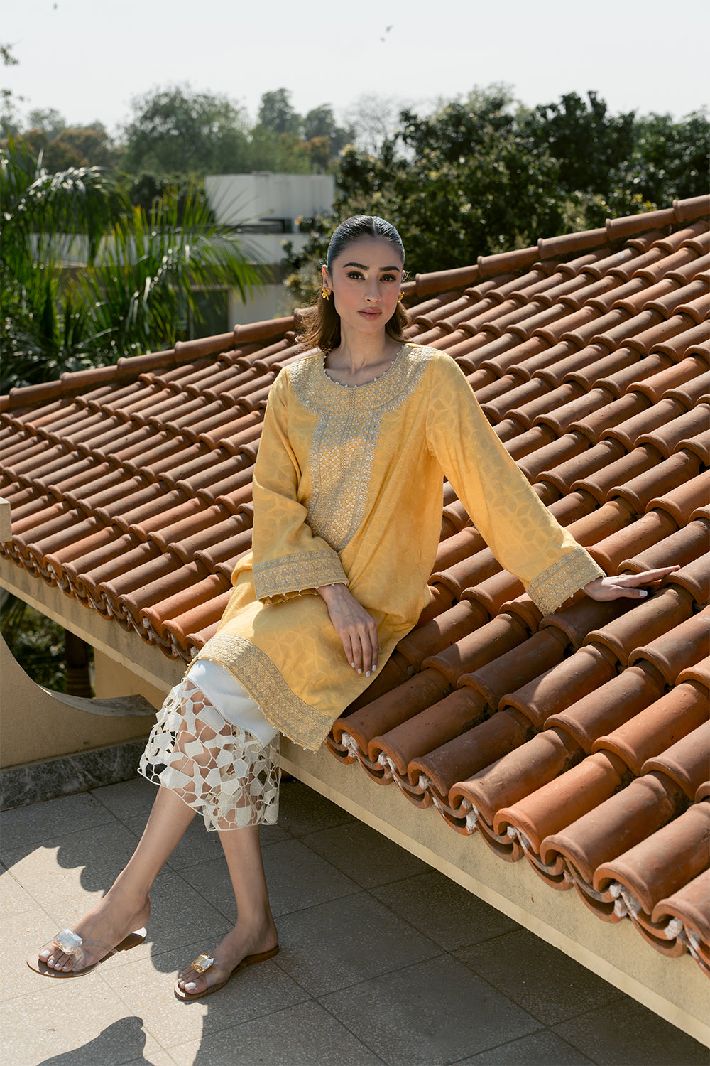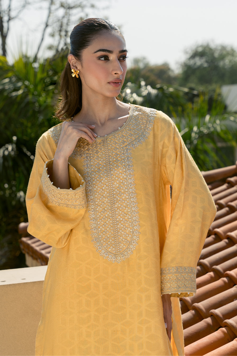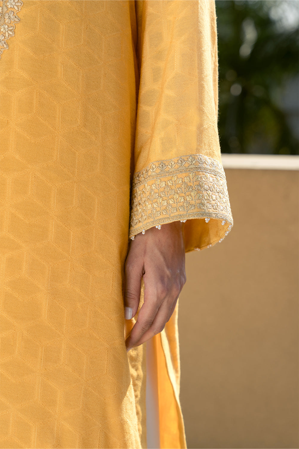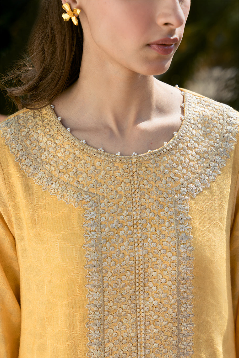 Embody festive charm in our yellow self kurta, crafted from delicate cotton net and intricately adorned with fine embroidery in complementary accents. Elevate your look by pairing it with our crafted izaar for a stunning, dressed-up ensemble.