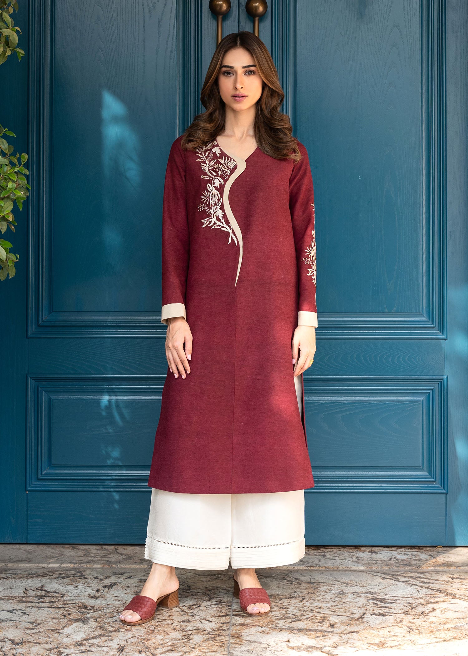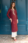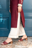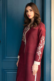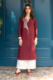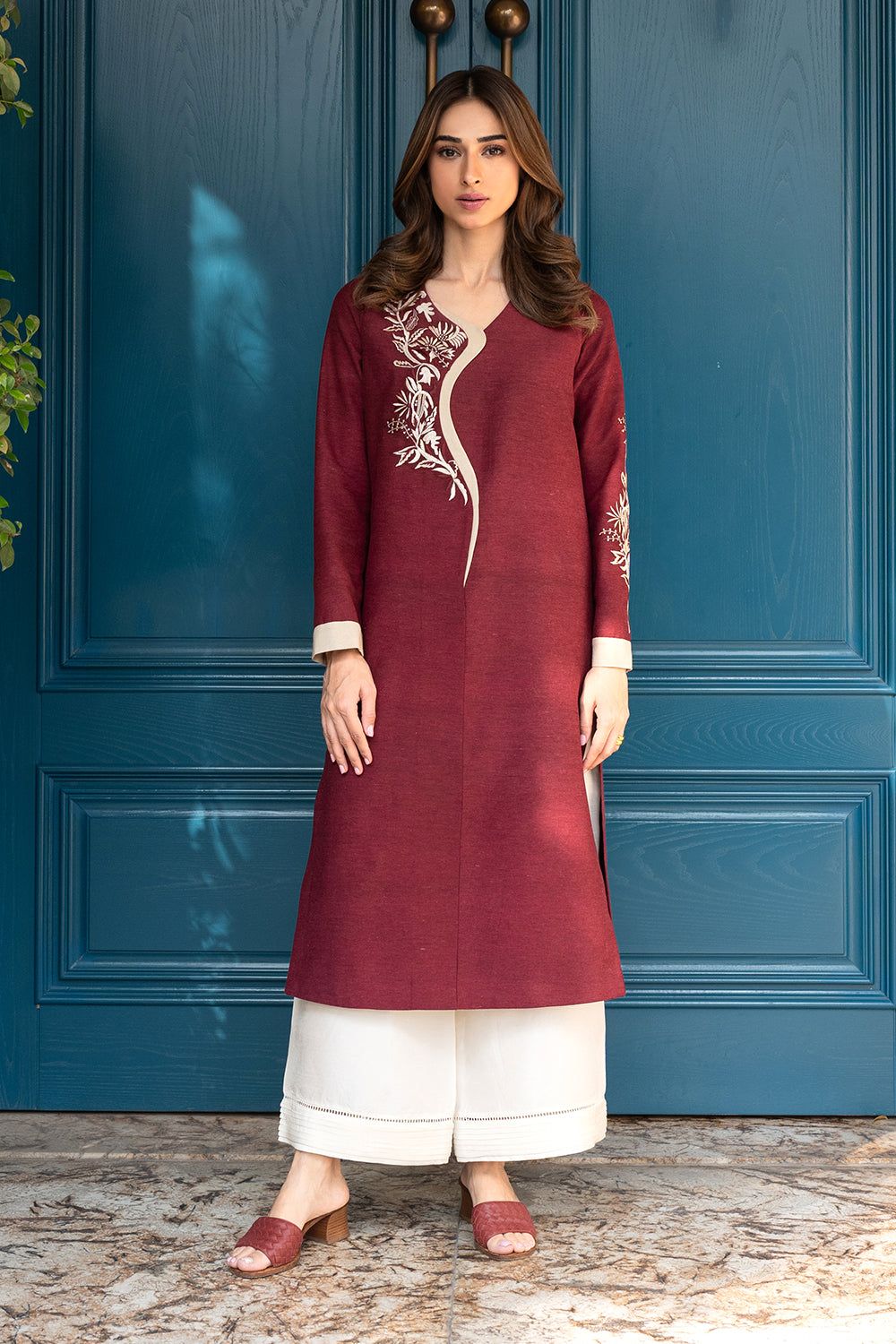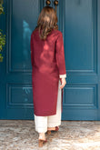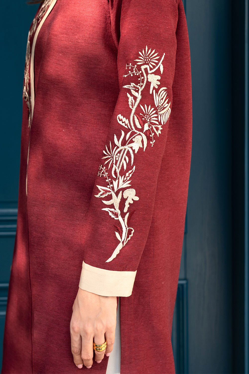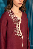 Our Dina kurta in maroon is a must-have for this winter season. Crafted from pure karandi, it features fine floral embroidery in complimenting earthy hues. Pair it with our pleated izaar for a complete look.