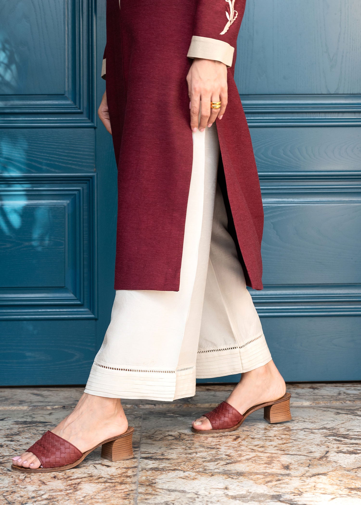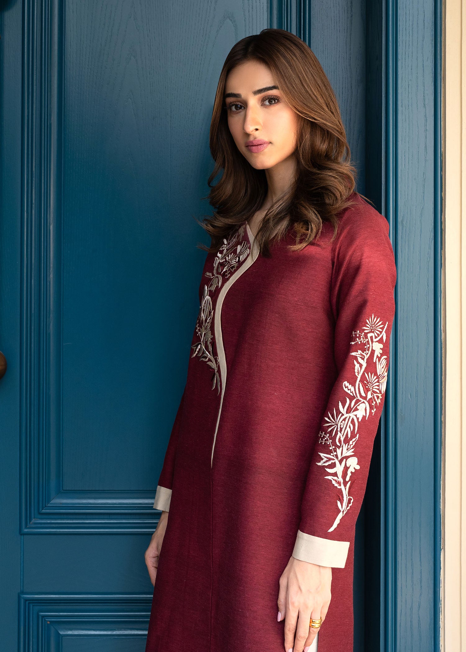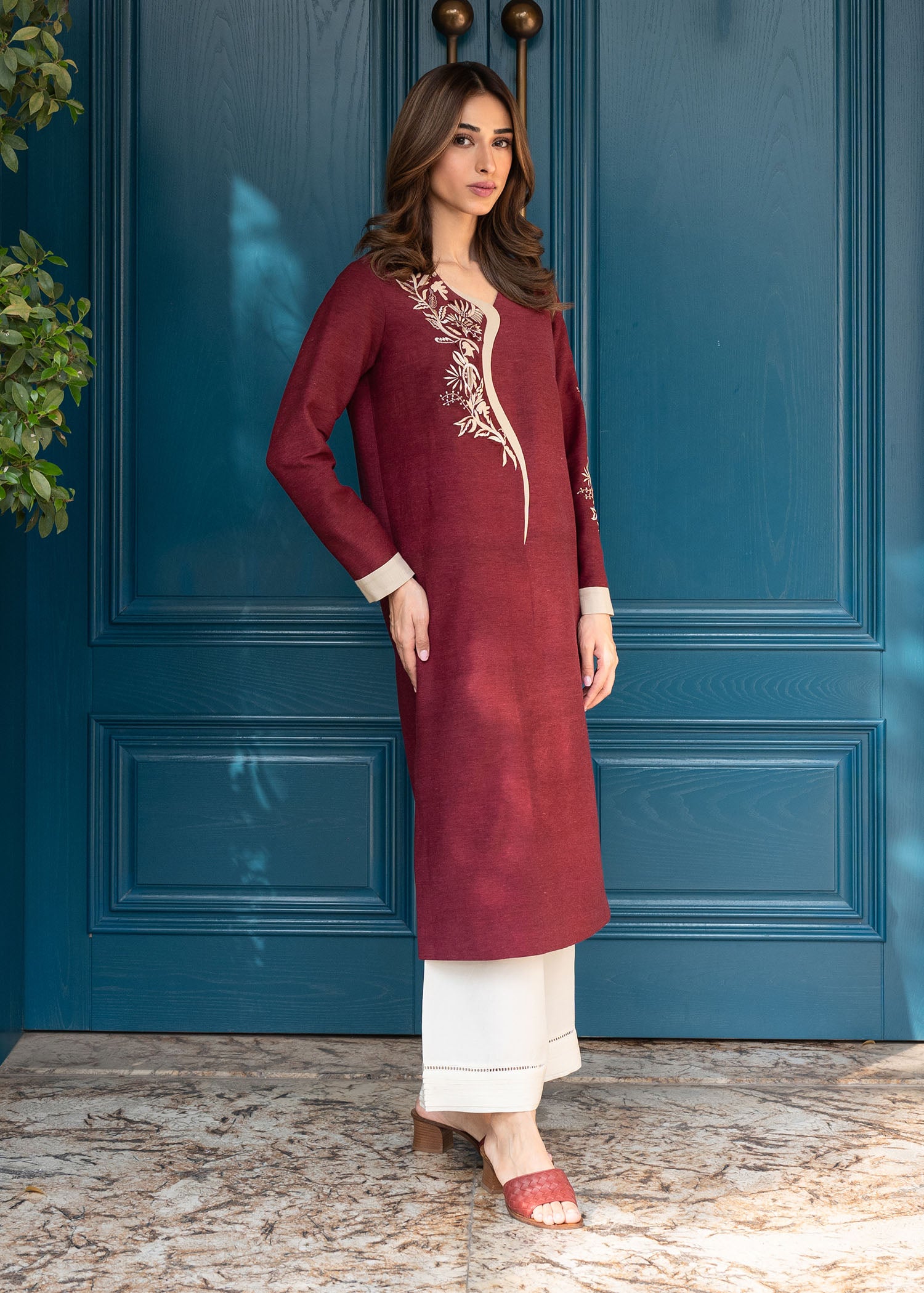 Our Dina kurta in maroon is a must-have for this winter season. Crafted from pure karandi, it features fine floral embroidery in complimenting earthy hues. Pair it with our pleated izaar for a complete look.