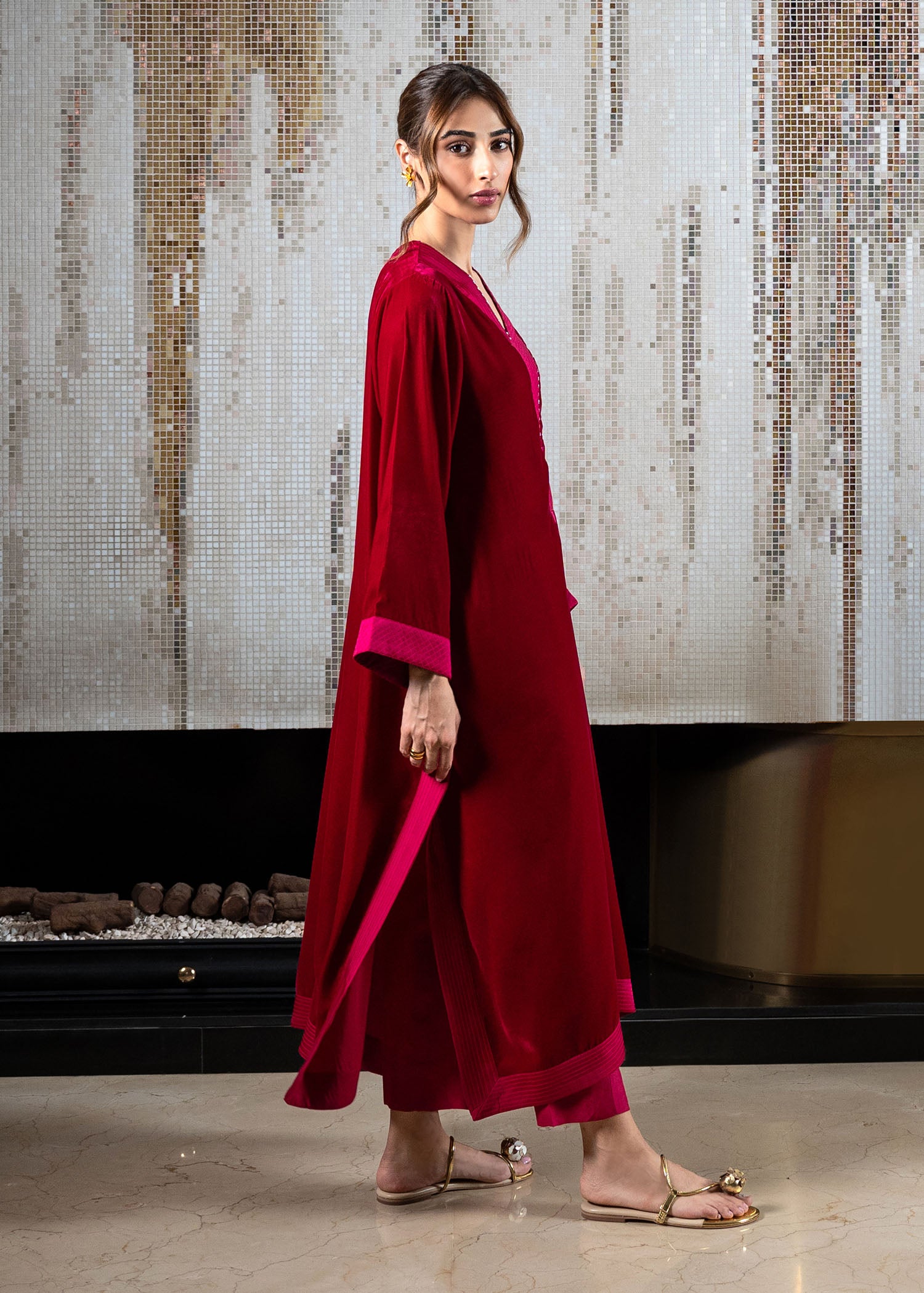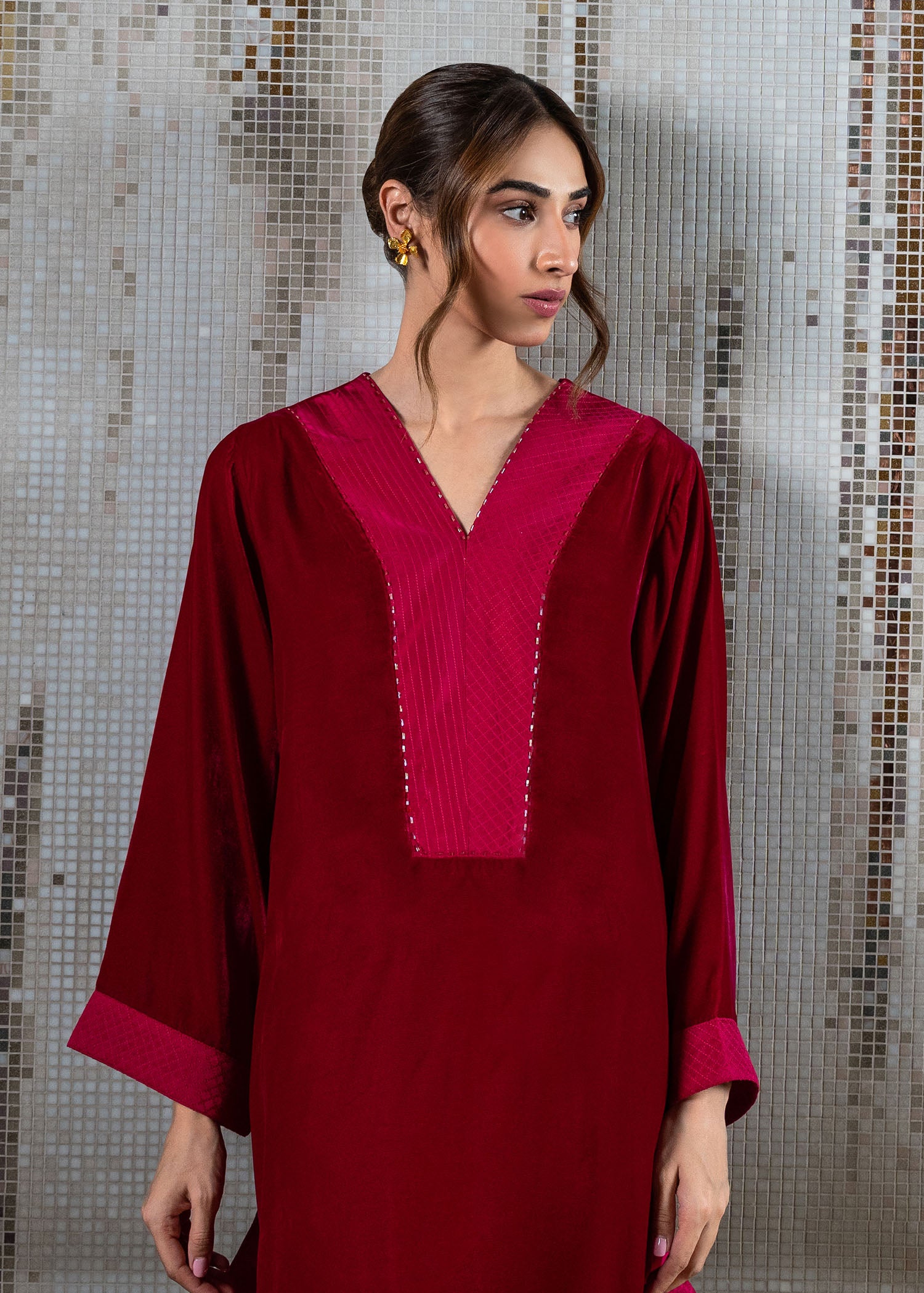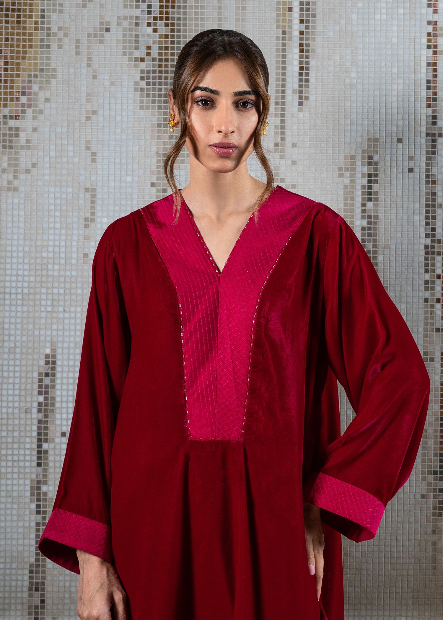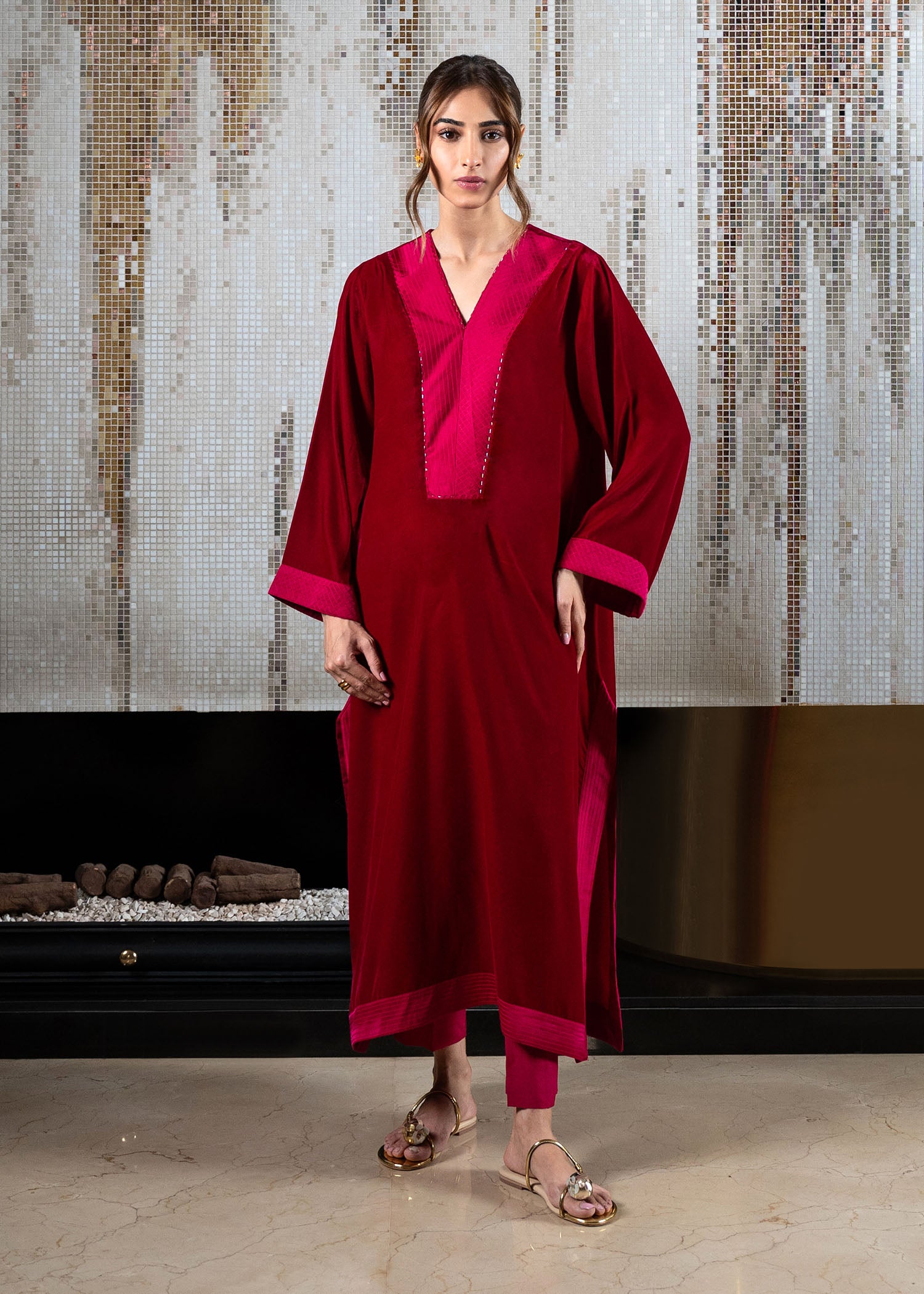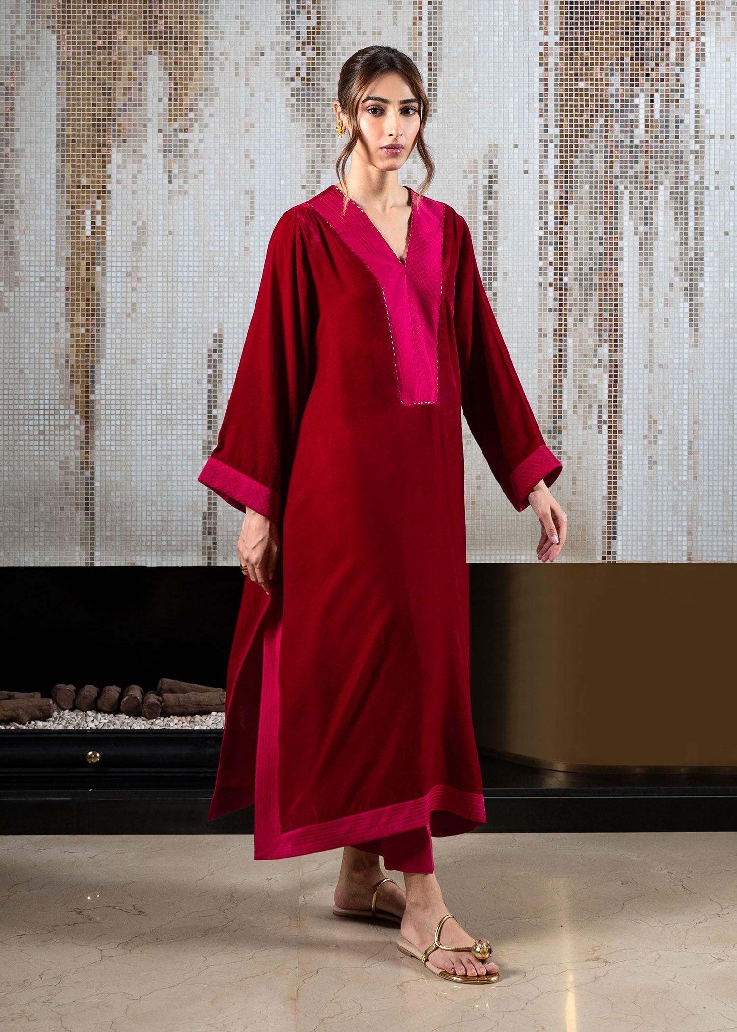 Fuse cultural elegance with our luxurious velvet tunic and tapered trouser set. The drop-down shirt features intricate crafted stitches along the neckline and sleeves, creating a timeless masterpiece.