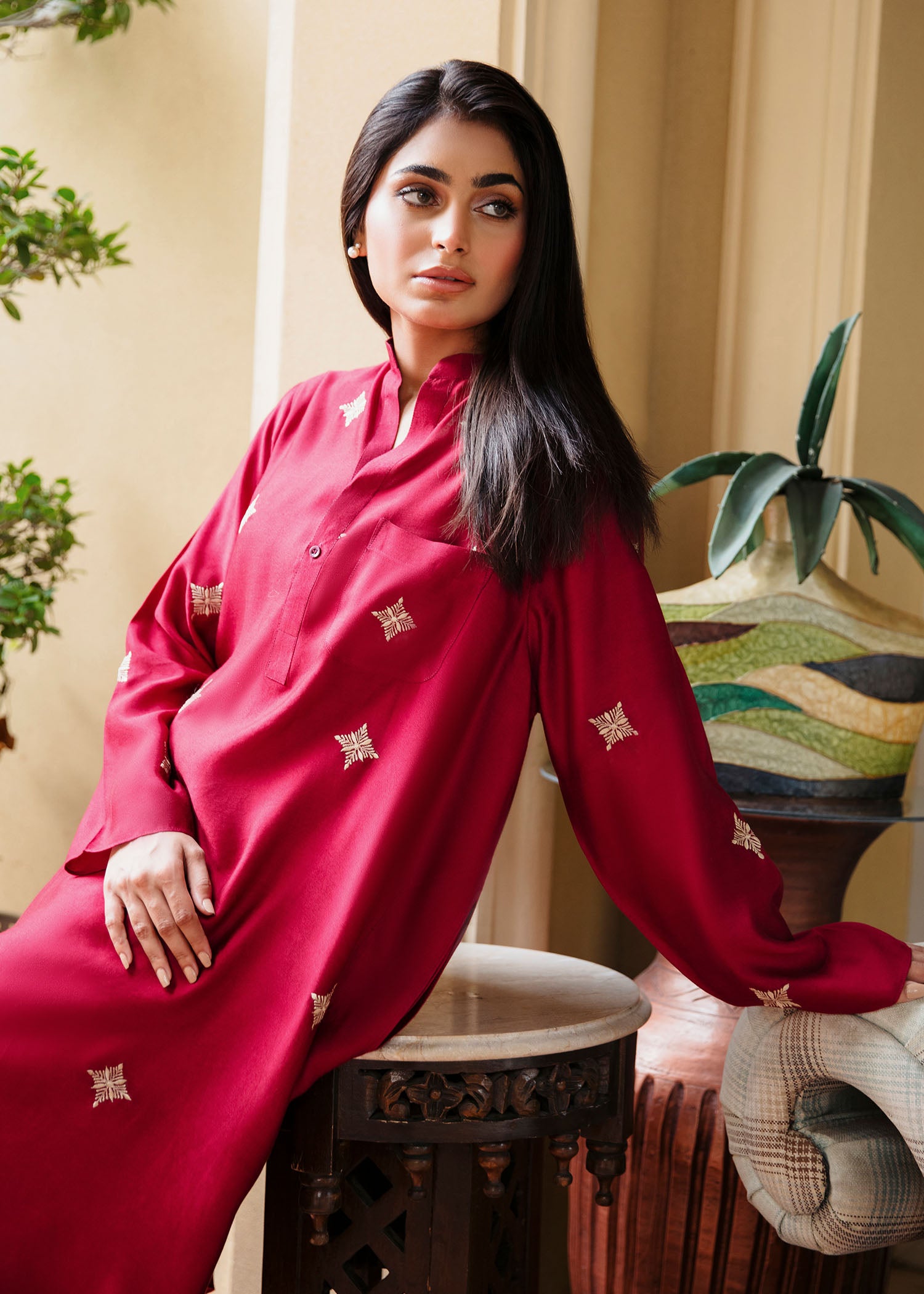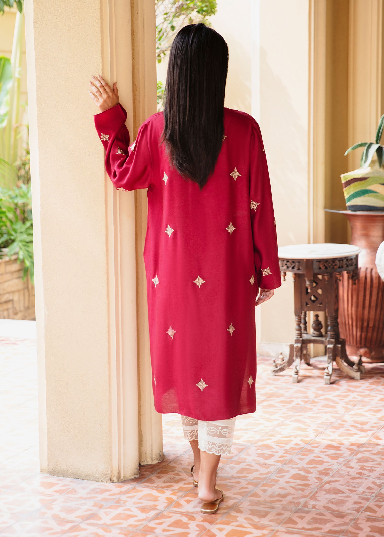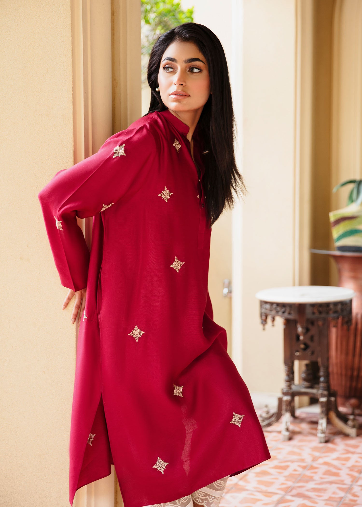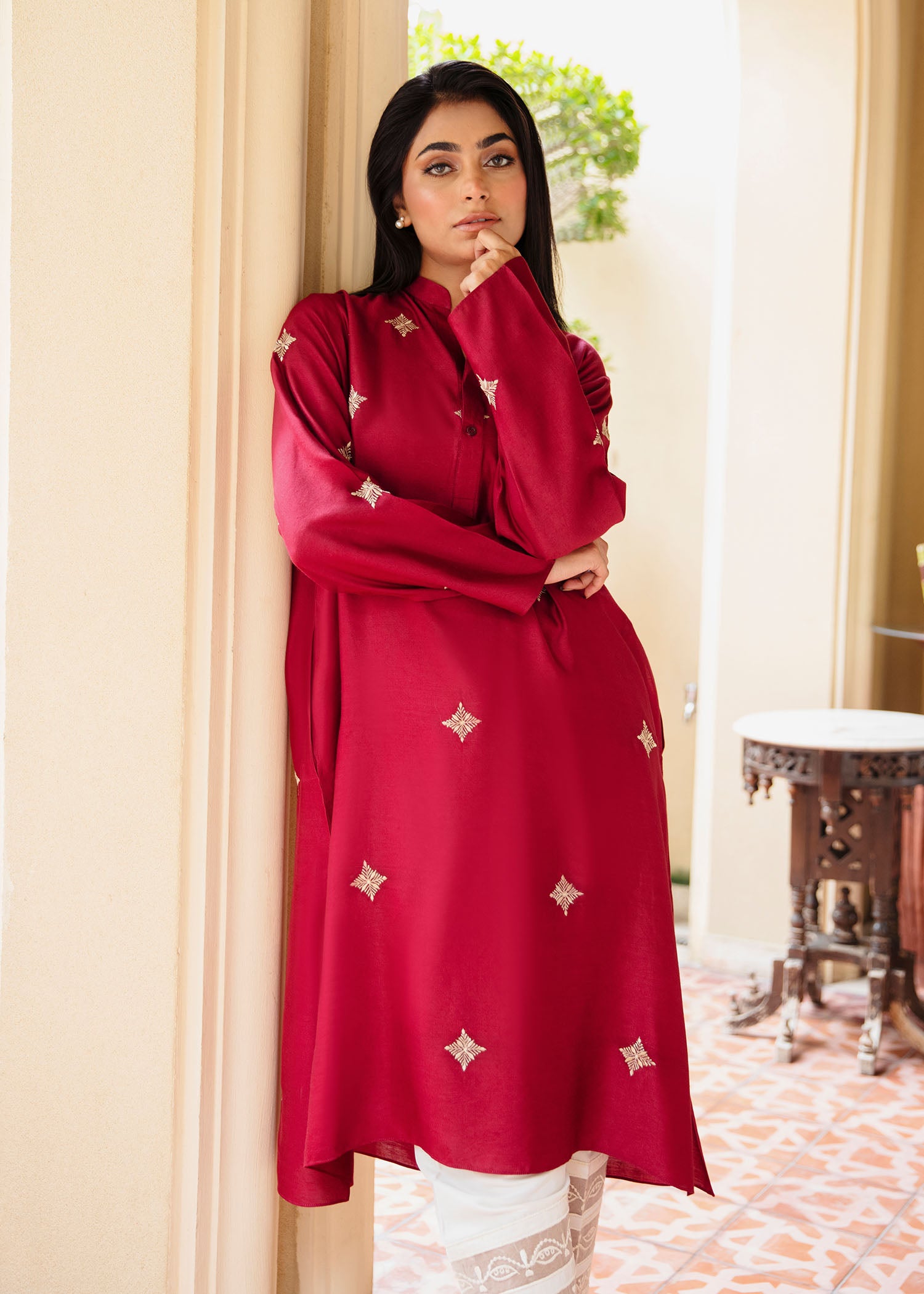 Crafted from pure Khaddi Silk, This rich maroon kurta is adorned with intricate, subtle embroidery , making it a perfect choice for elegant occasions. The soft, breathable fabric ensures both comfort and sophistication, ideal for all-day wear. Pair it with our timeless skinny shalwar as seen here.