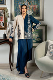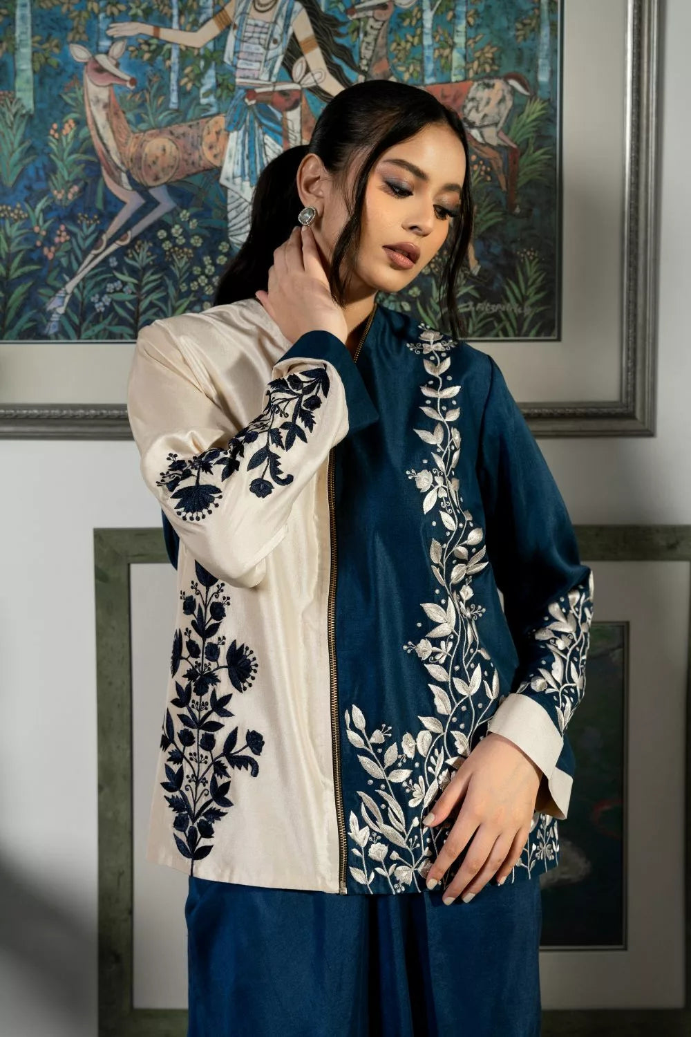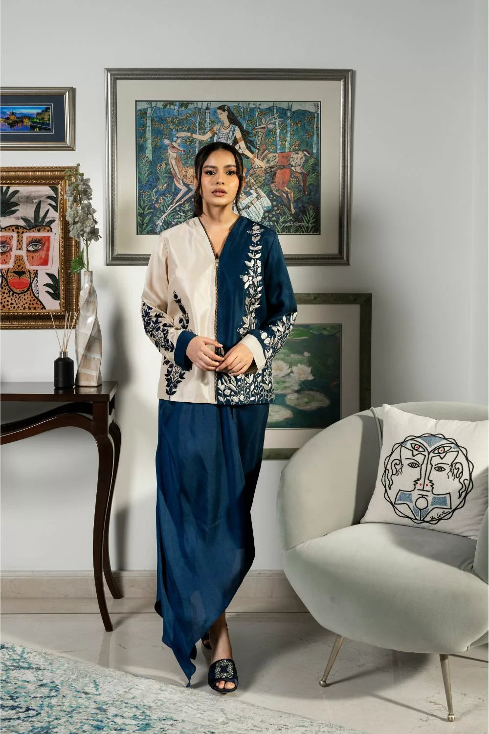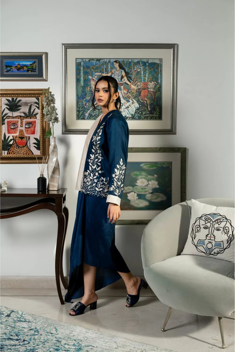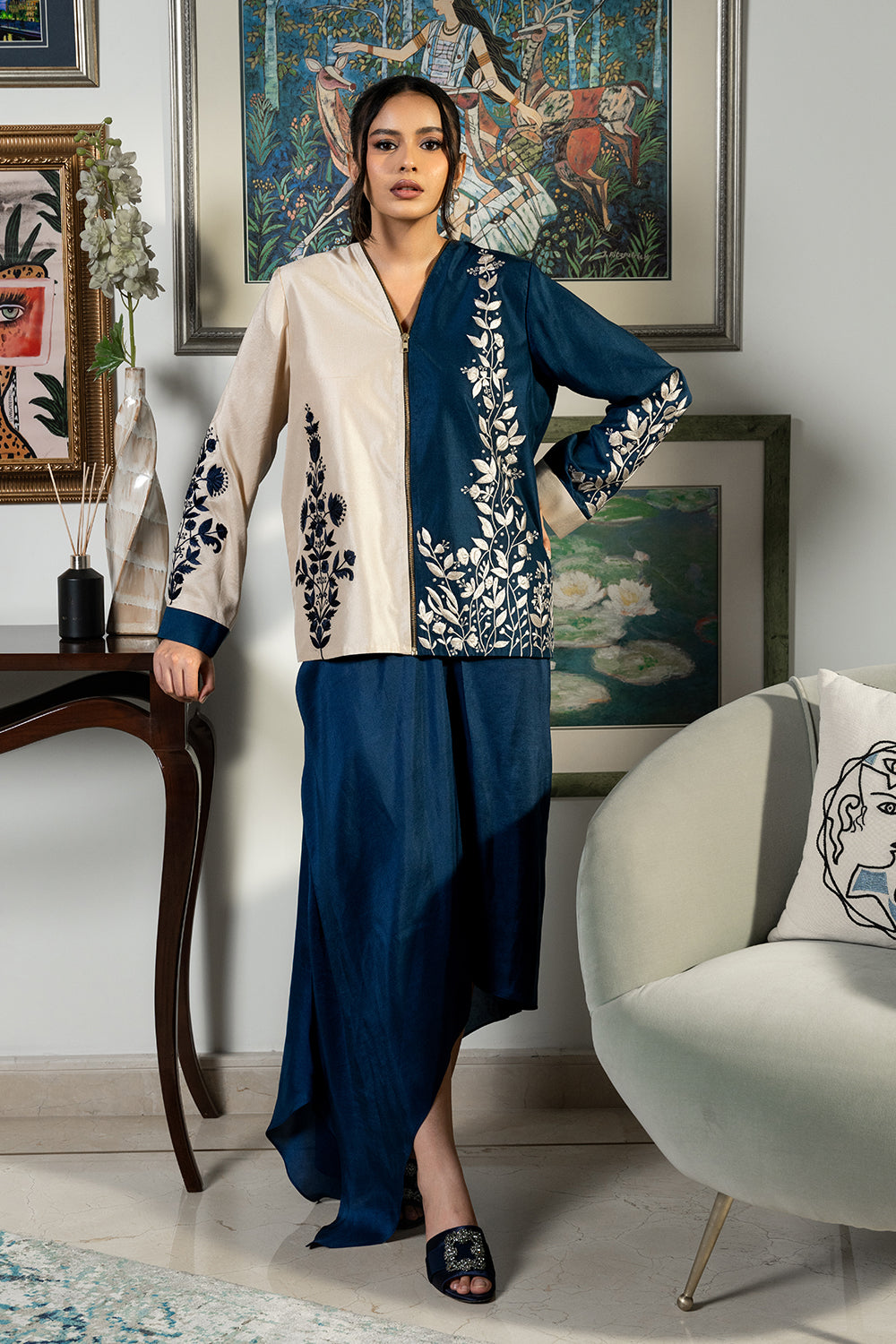 Make a stunning entrance at your next soirée with this exquisite ensemble. Two toned raw silk jacket featuring intricate resham embroidery, paired with a matching raw silk pick-up skirt for a chic look.
