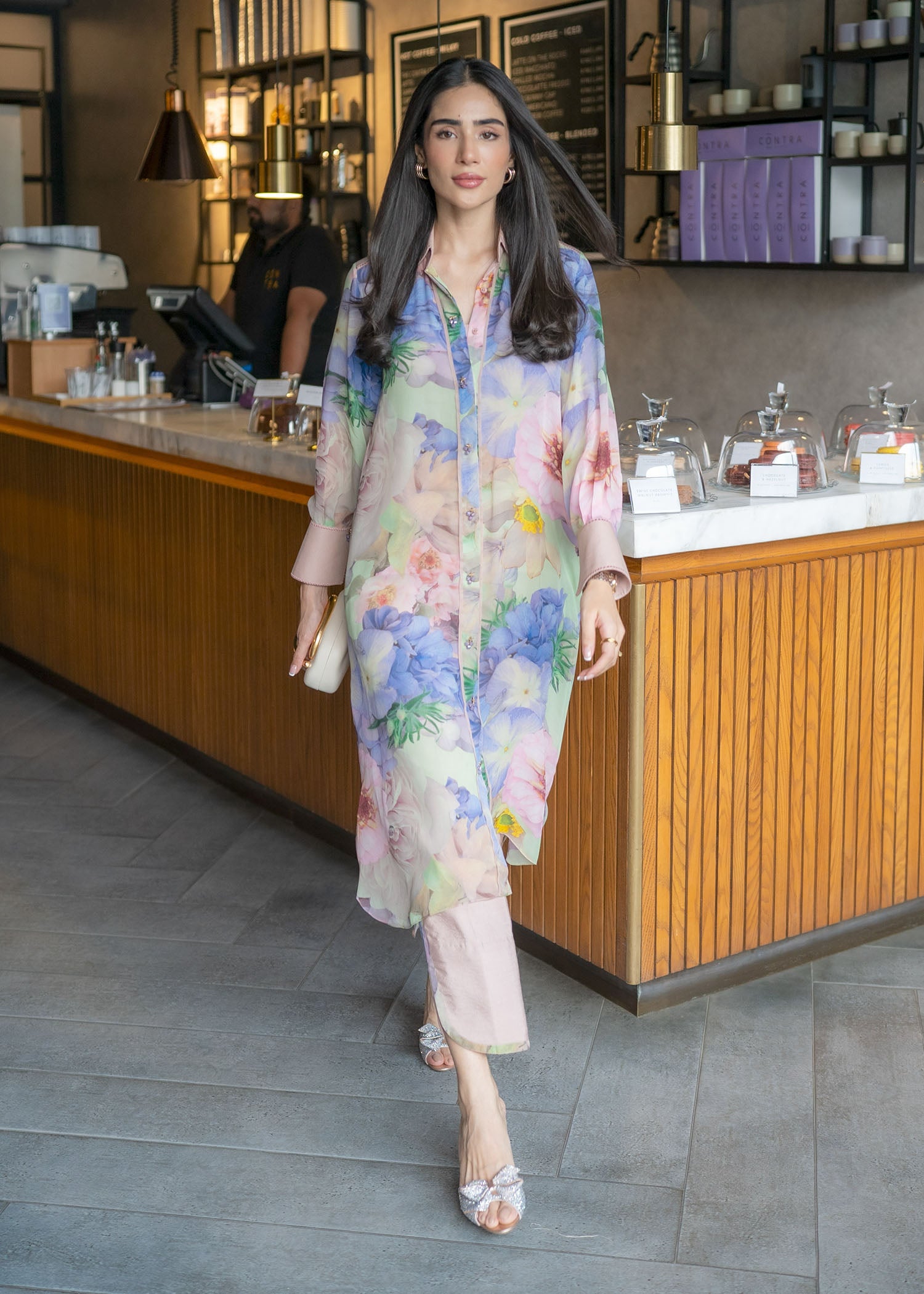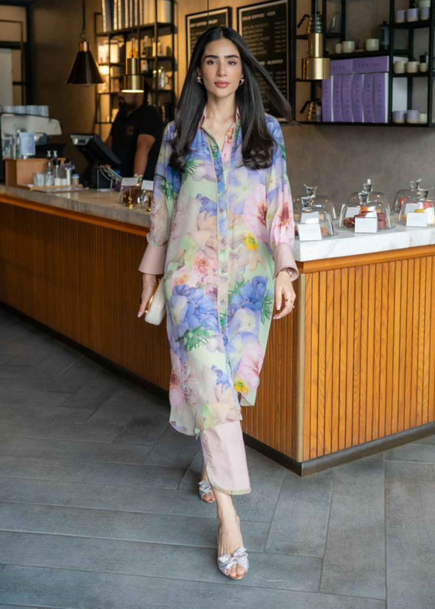 Our malai chiffon floral set exudes elegance with its soft pastel hues and all-over floral print. Paired with matching trousers, it's a stylish ensemble for any occasion.