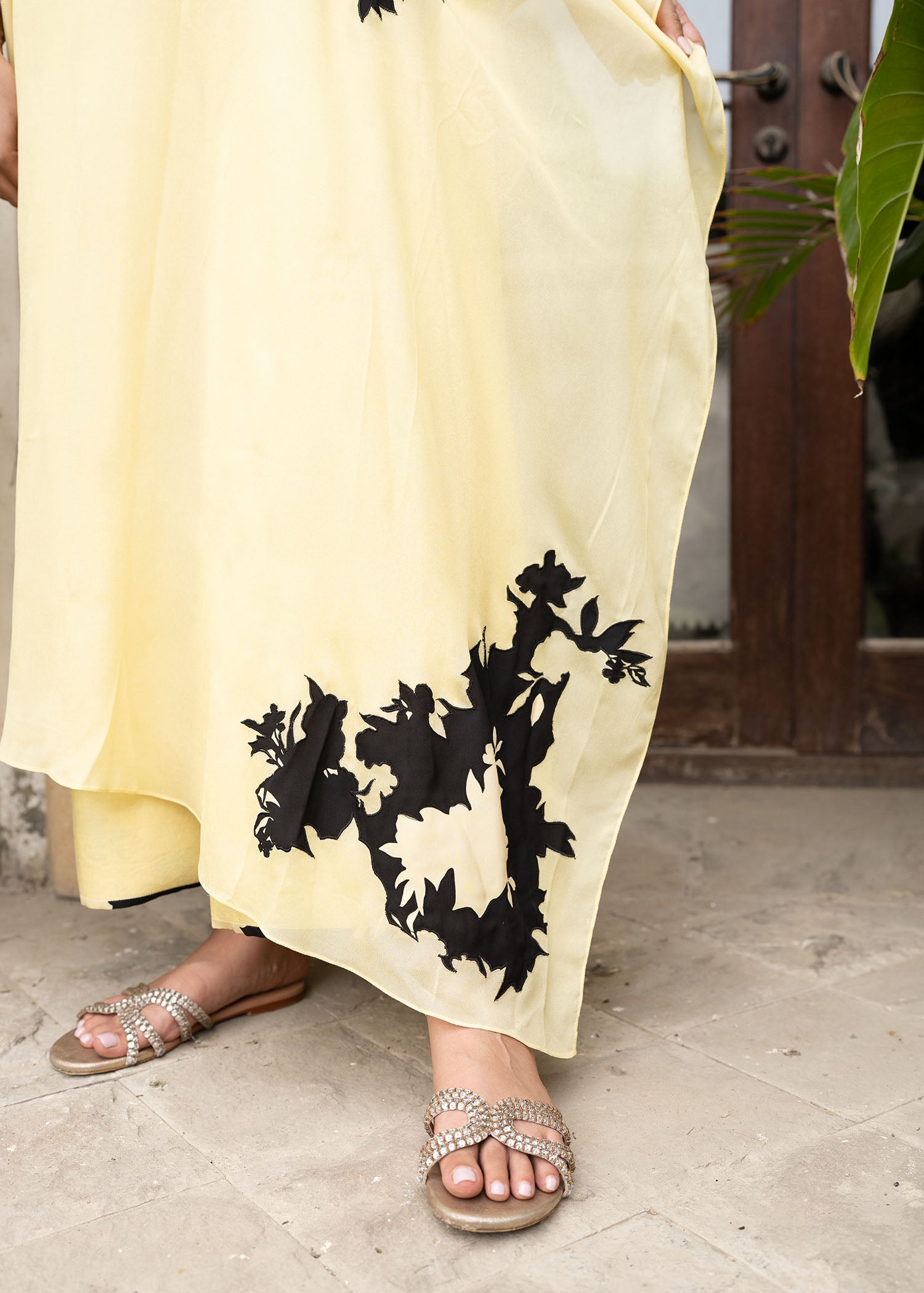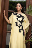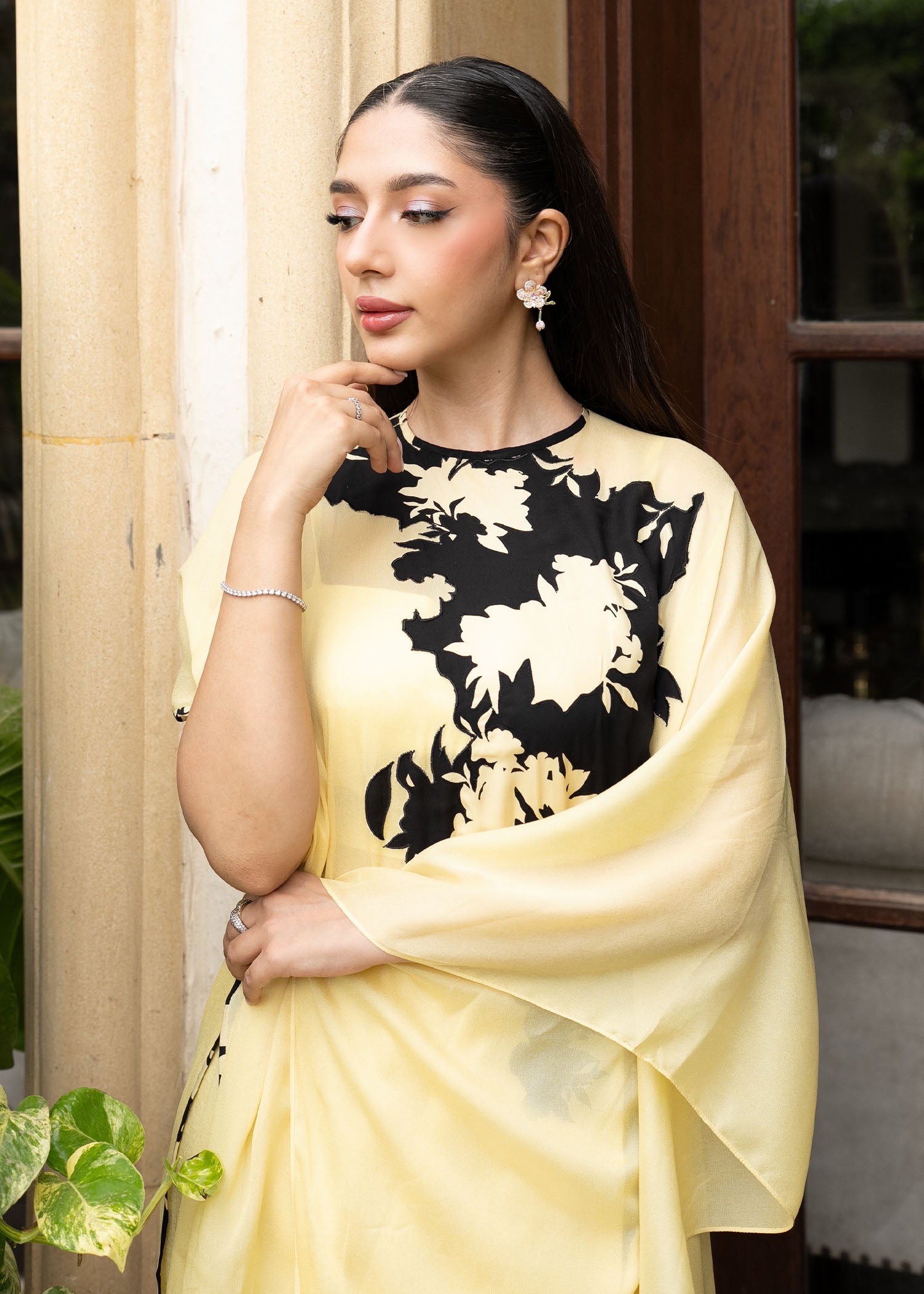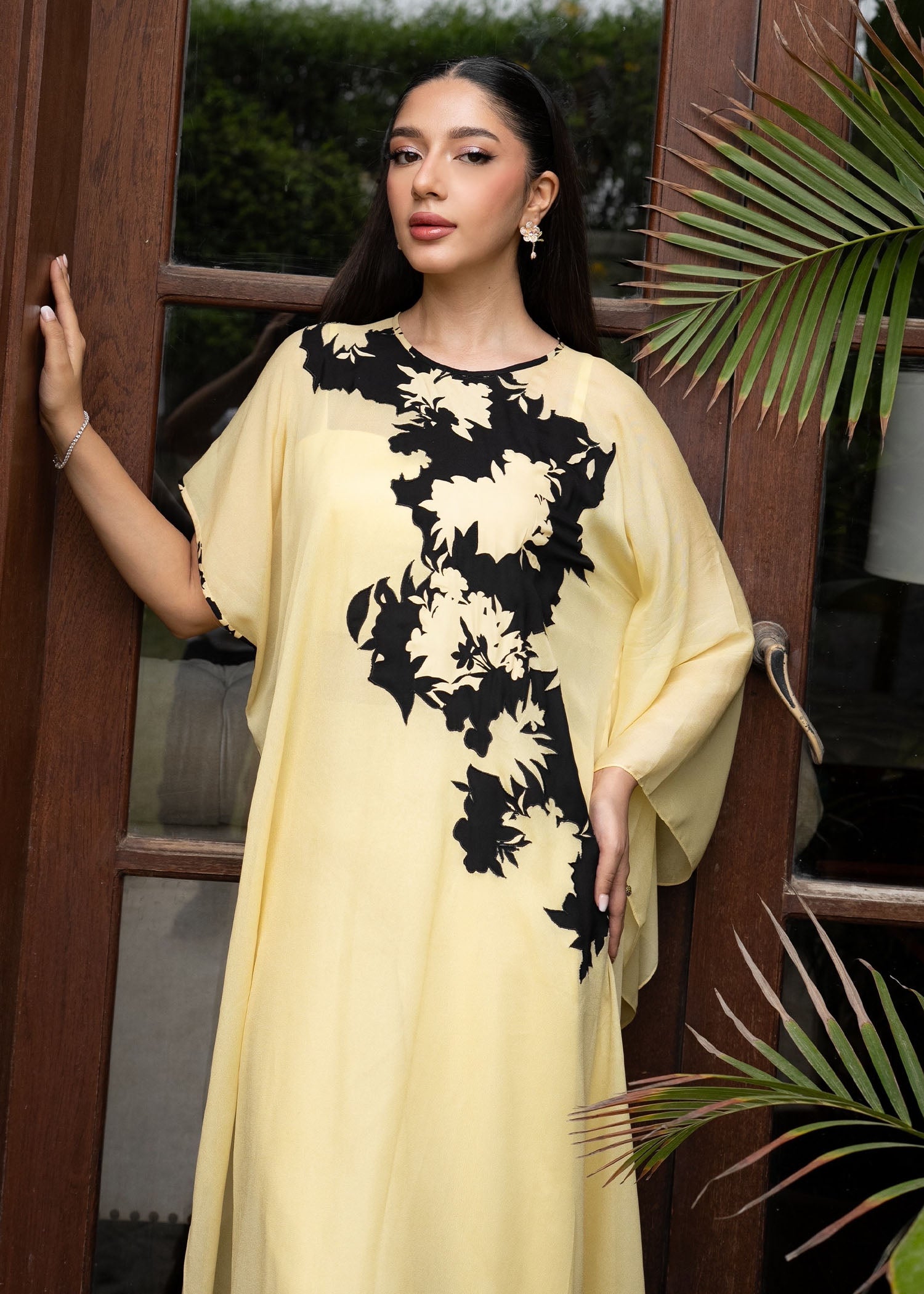 Leya is a masterful blend of style and comfort. Featuring a kaftan silhouette crafted from lightweight lemon yellow chiffon, this piece is adorned with exclusive floral prints and paired with culottes and bandeau. It captures the carefree magic of endless summer days.