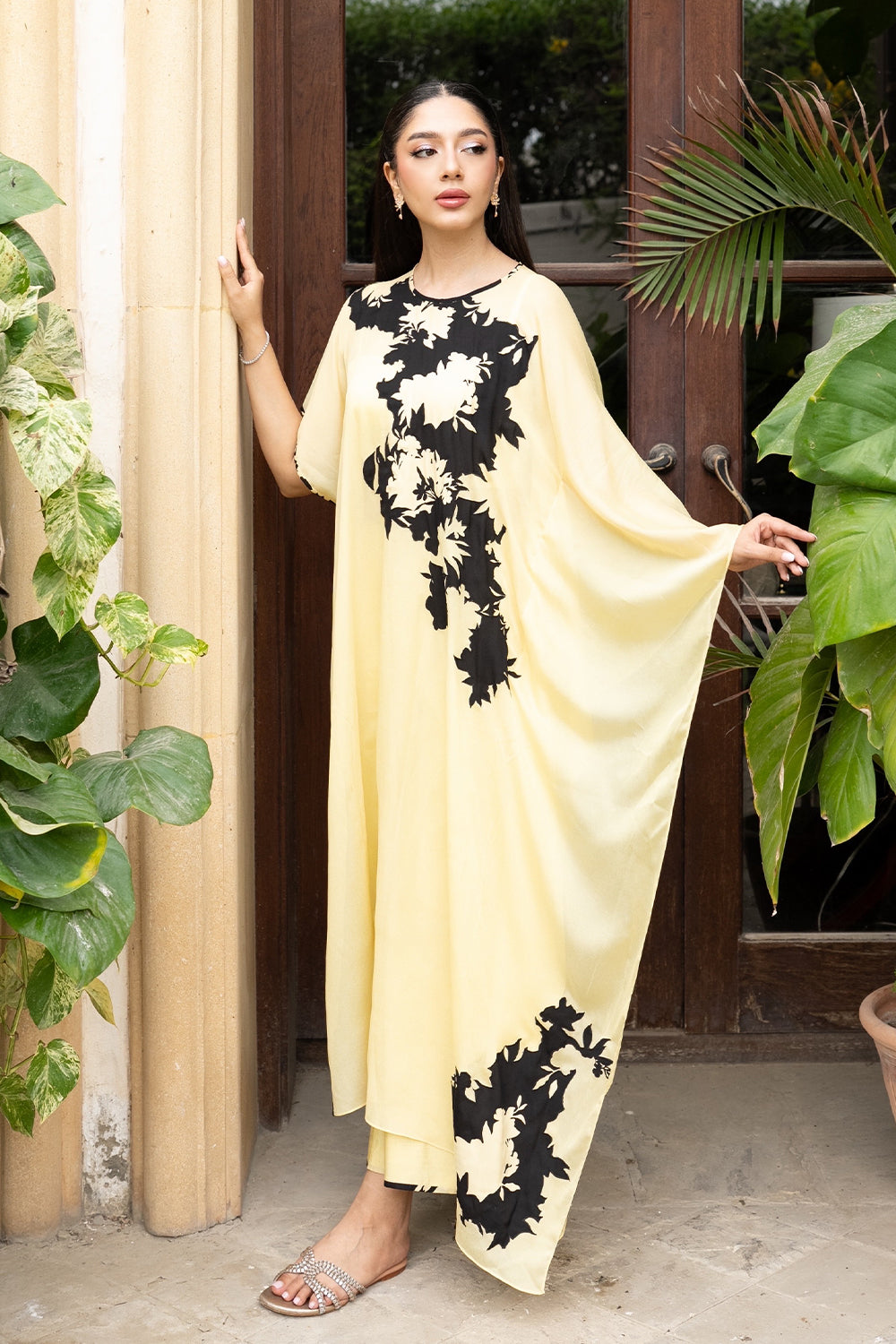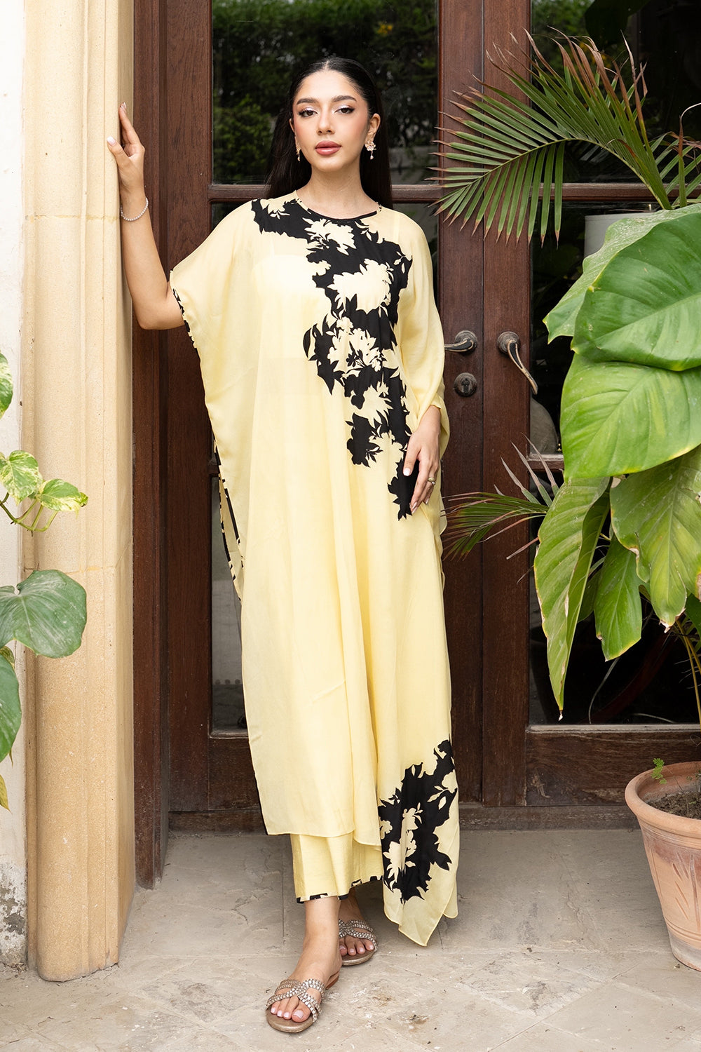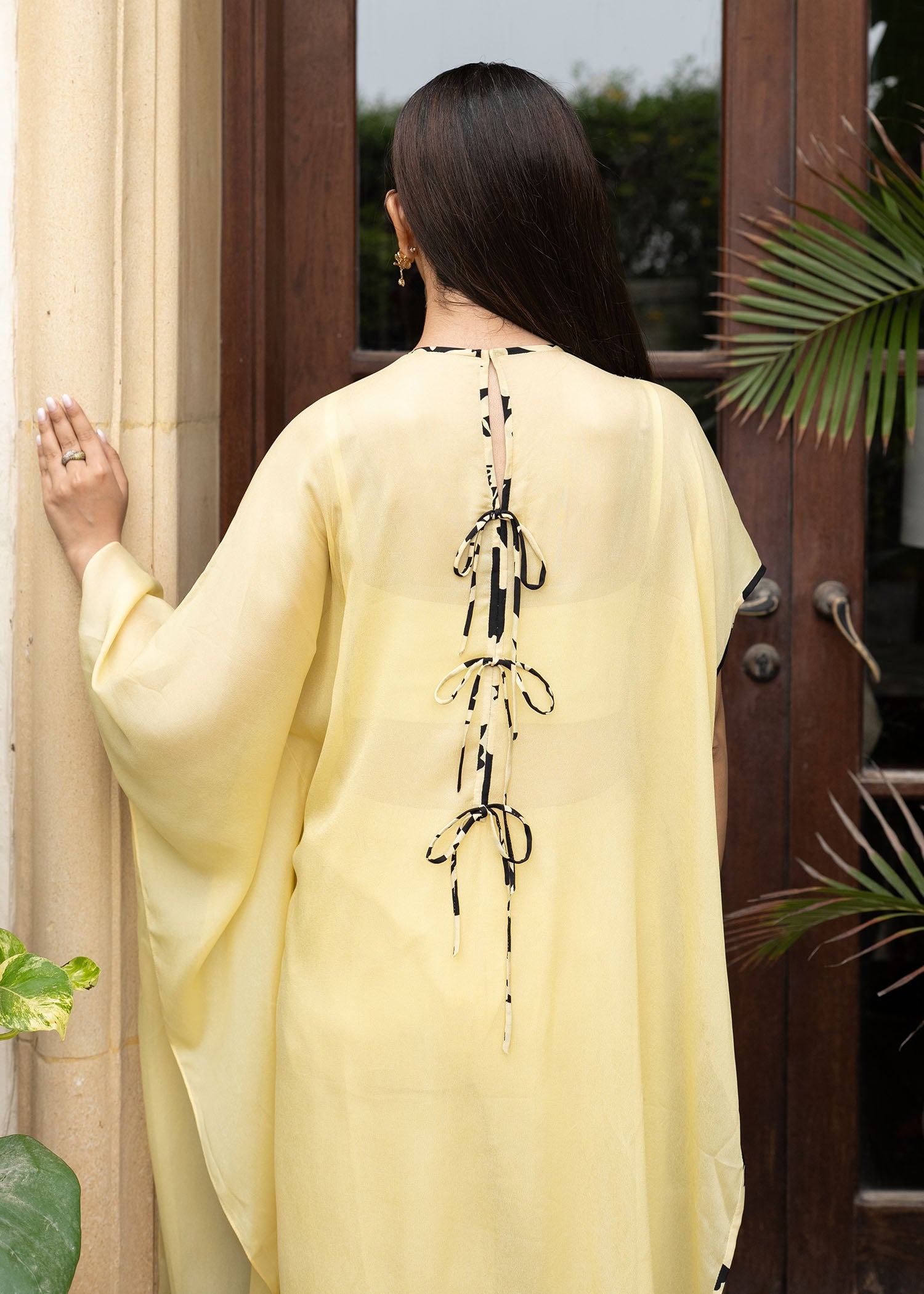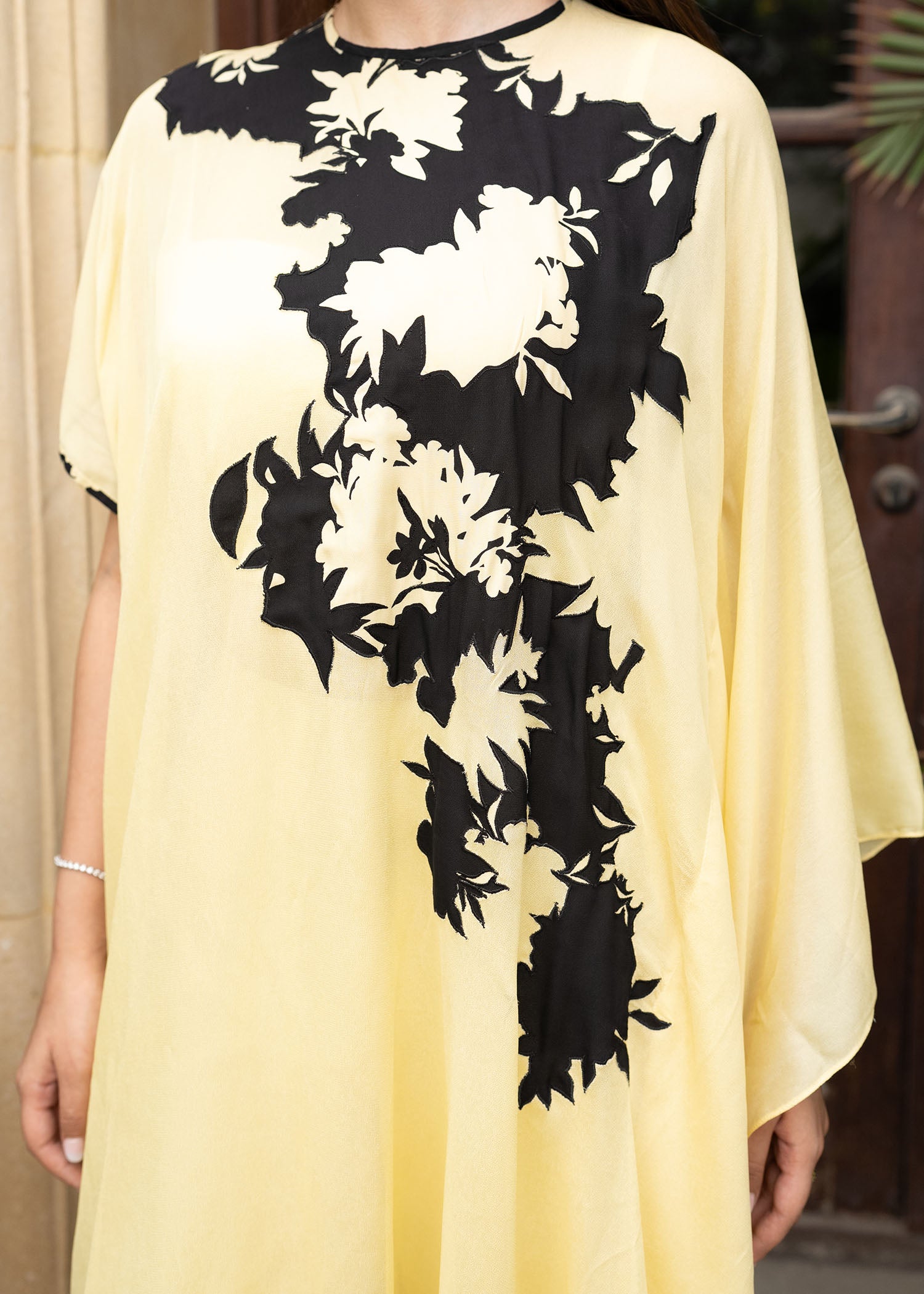 Leya is a masterful blend of style and comfort. Featuring a kaftan silhouette crafted from lightweight lemon yellow chiffon, this piece is adorned with exclusive floral prints and paired with culottes and bandeau. It captures the carefree magic of endless summer days.