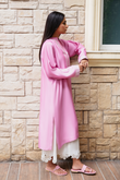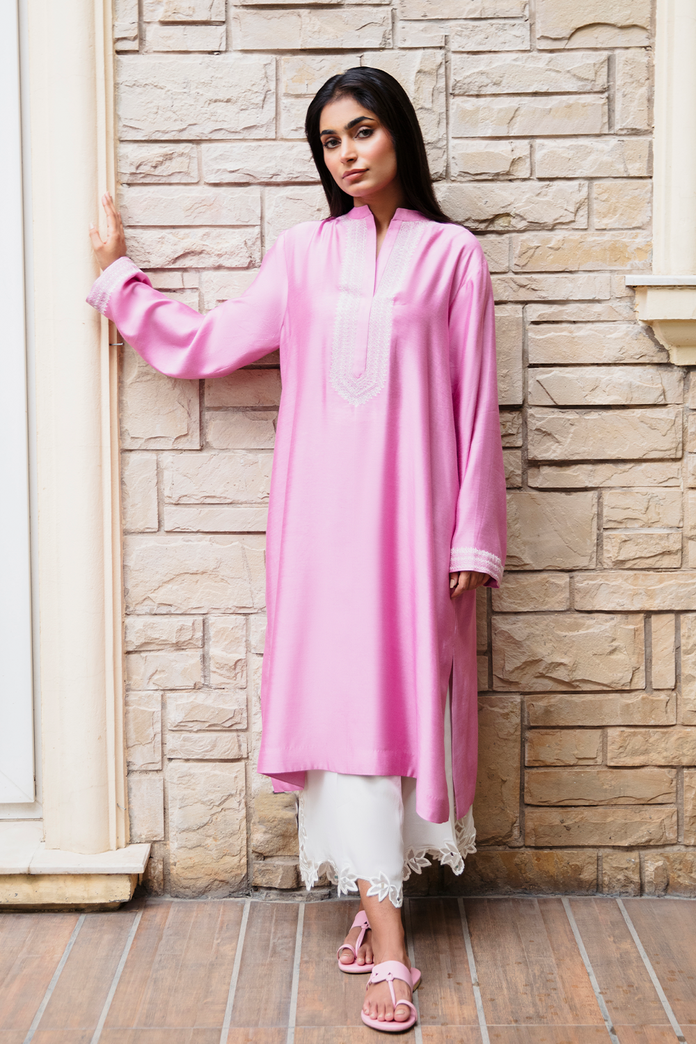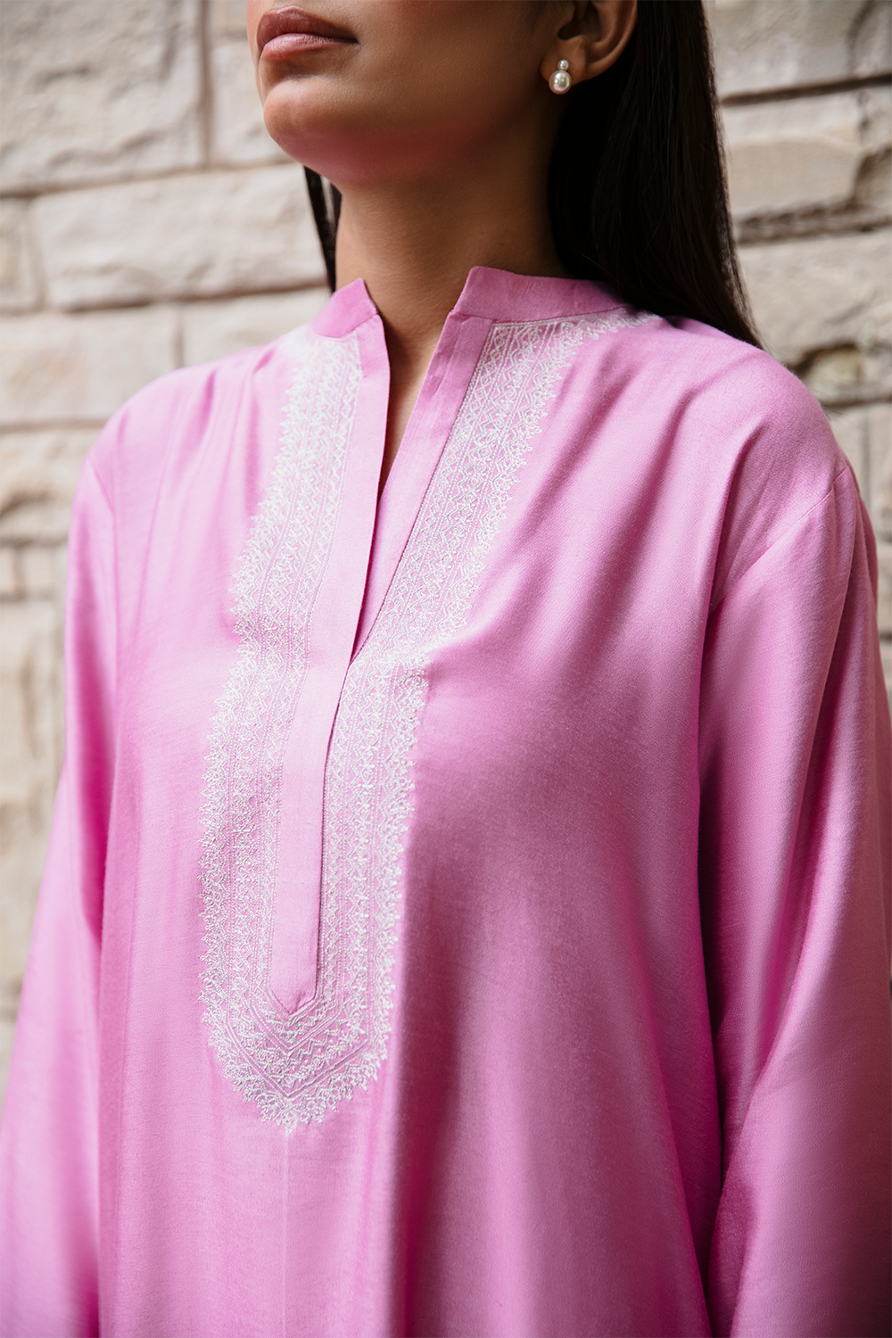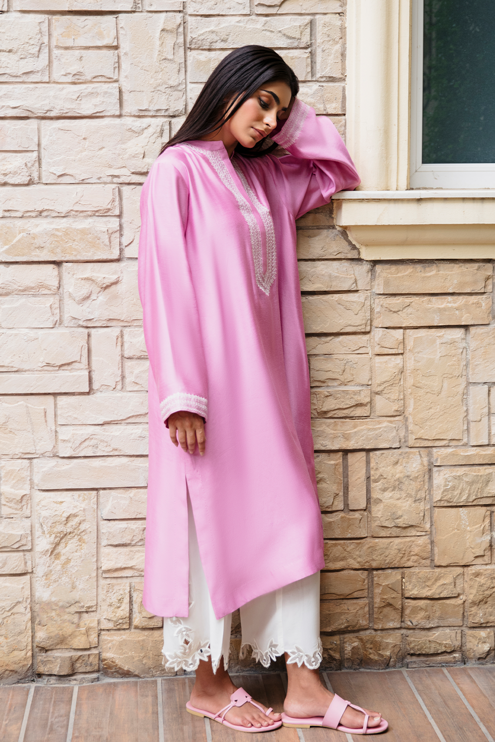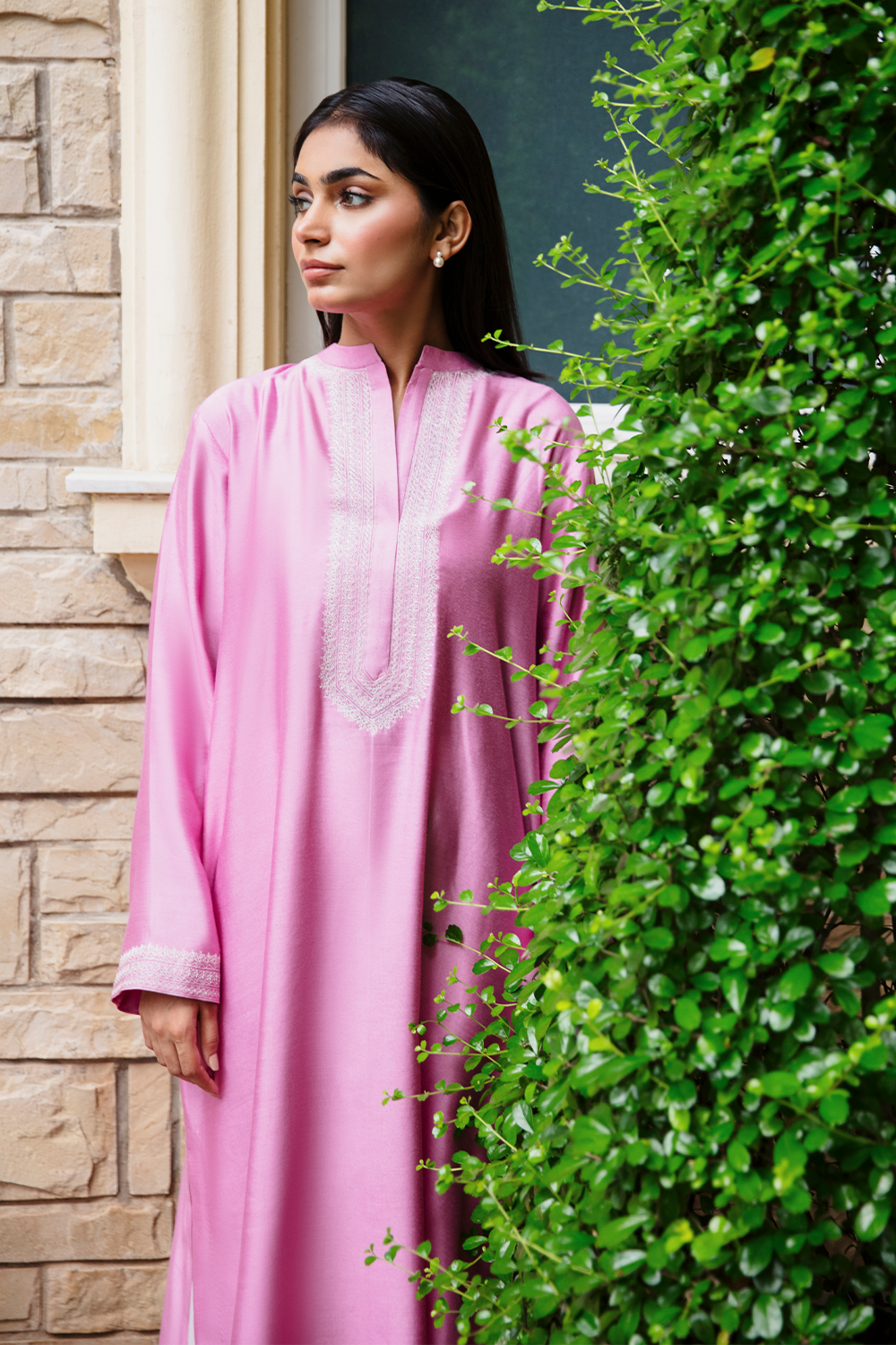 This elegant kurta, crafted from pure Khaddi Silk, exudes a timeless charm with its soft pink hue and delicate embroidery. The lightweight, breathable fabric ensures a perfect blend of style and comfort, ideal for both casual and formal settings. Pair it with our exquisite Izaar for a polished, effortless look.