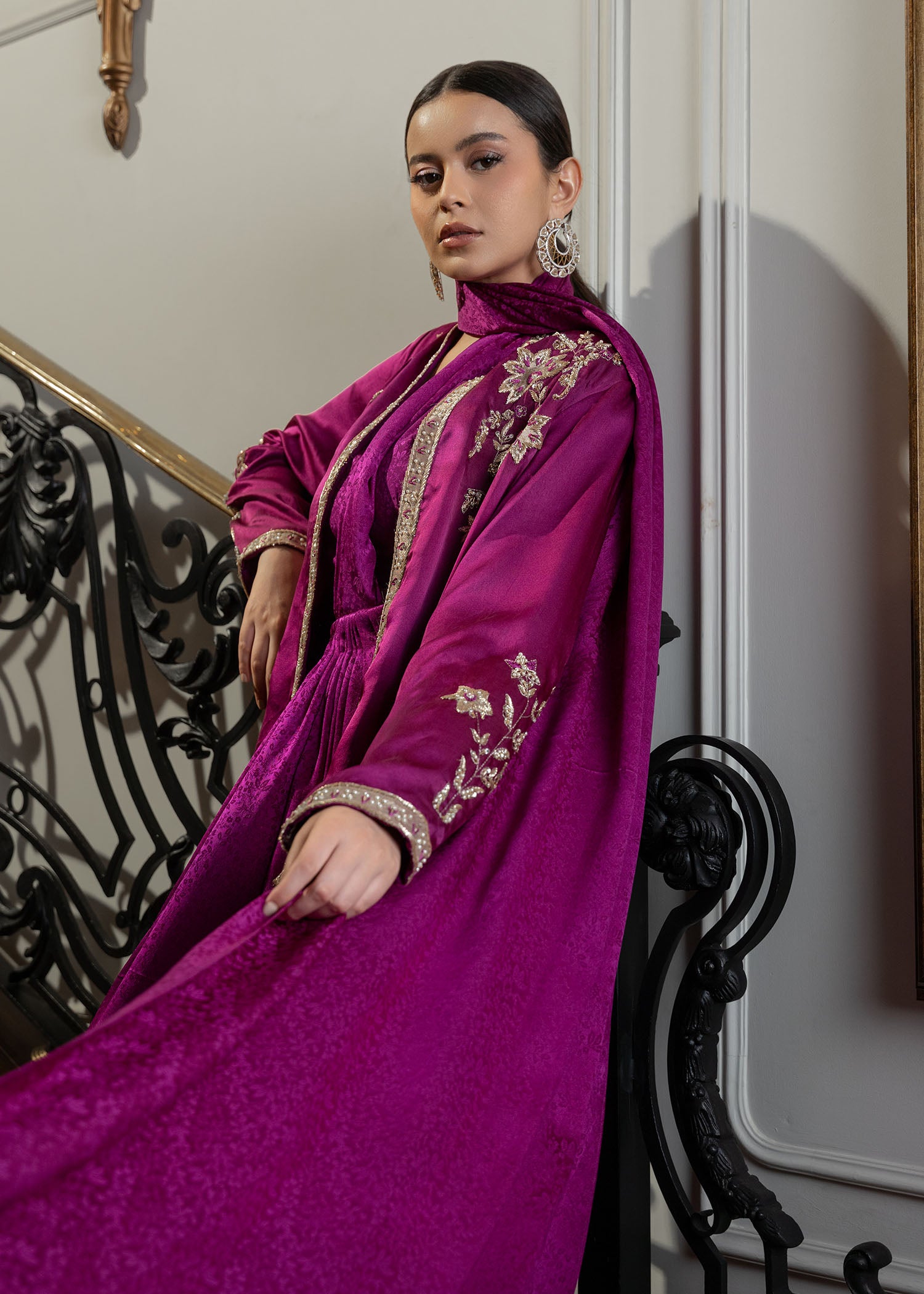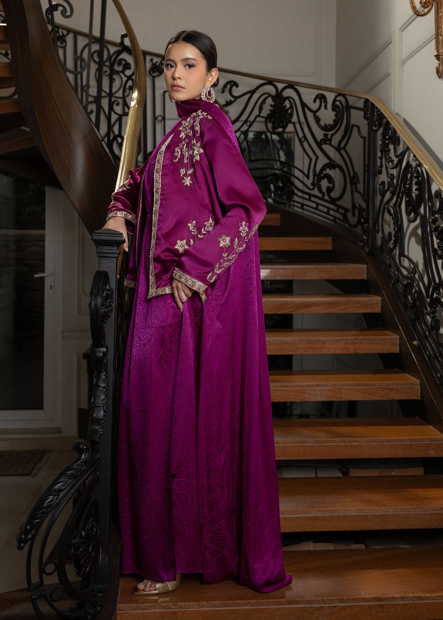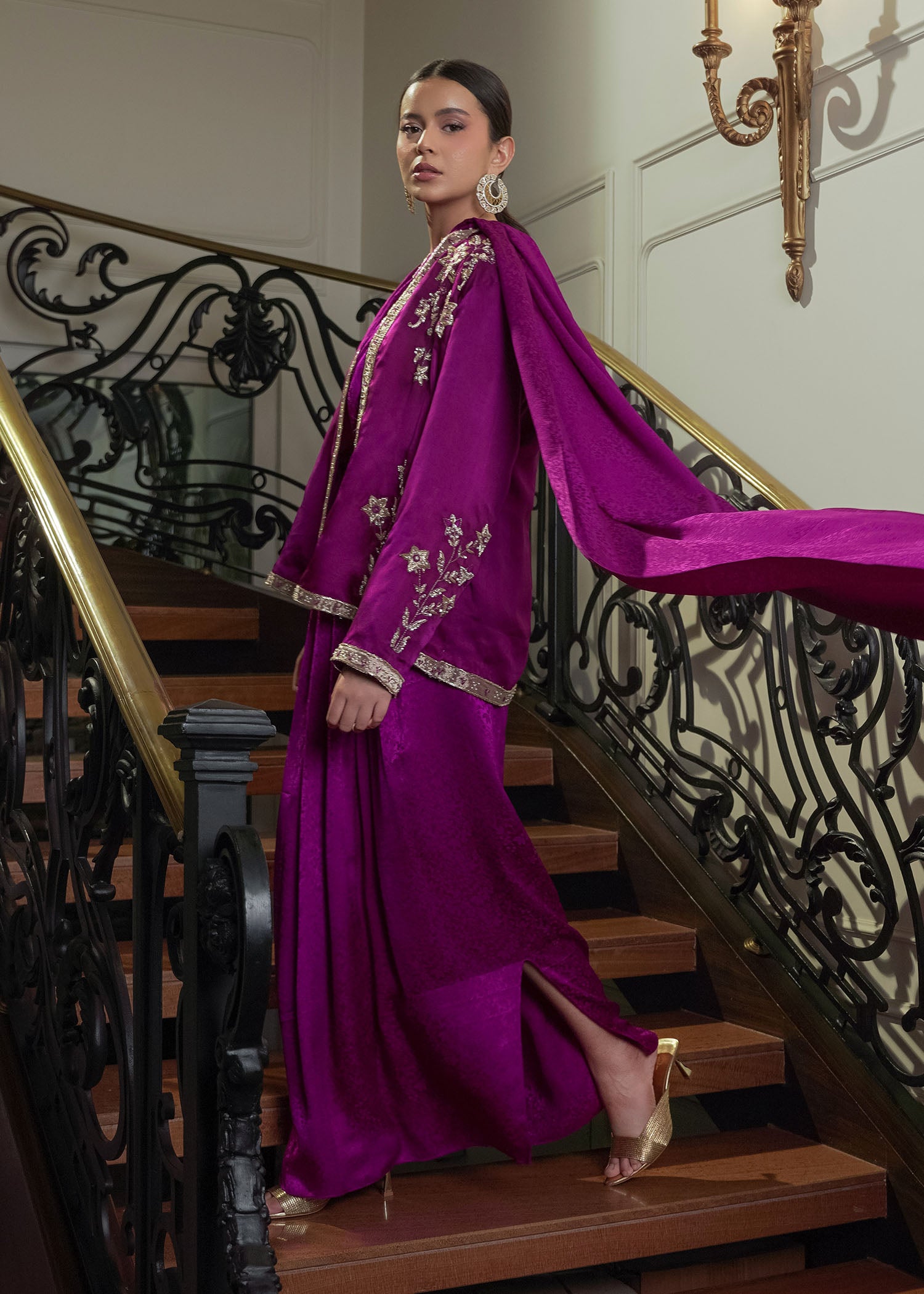 Step into luxury with the Mahrou ensemble, crafted from lustrous pure silk charmeuse. This striking draped saree features a rich magenta hue and is paired with an intricately hand-worked jacket. The delicate craftsmanship on the jacket adds a regal touch, making this outfit ideal for any festive or wedding event. The fluid drape of the saree combined with the structured elegance of the jacket creates a perfect balance of tradition and modernity.