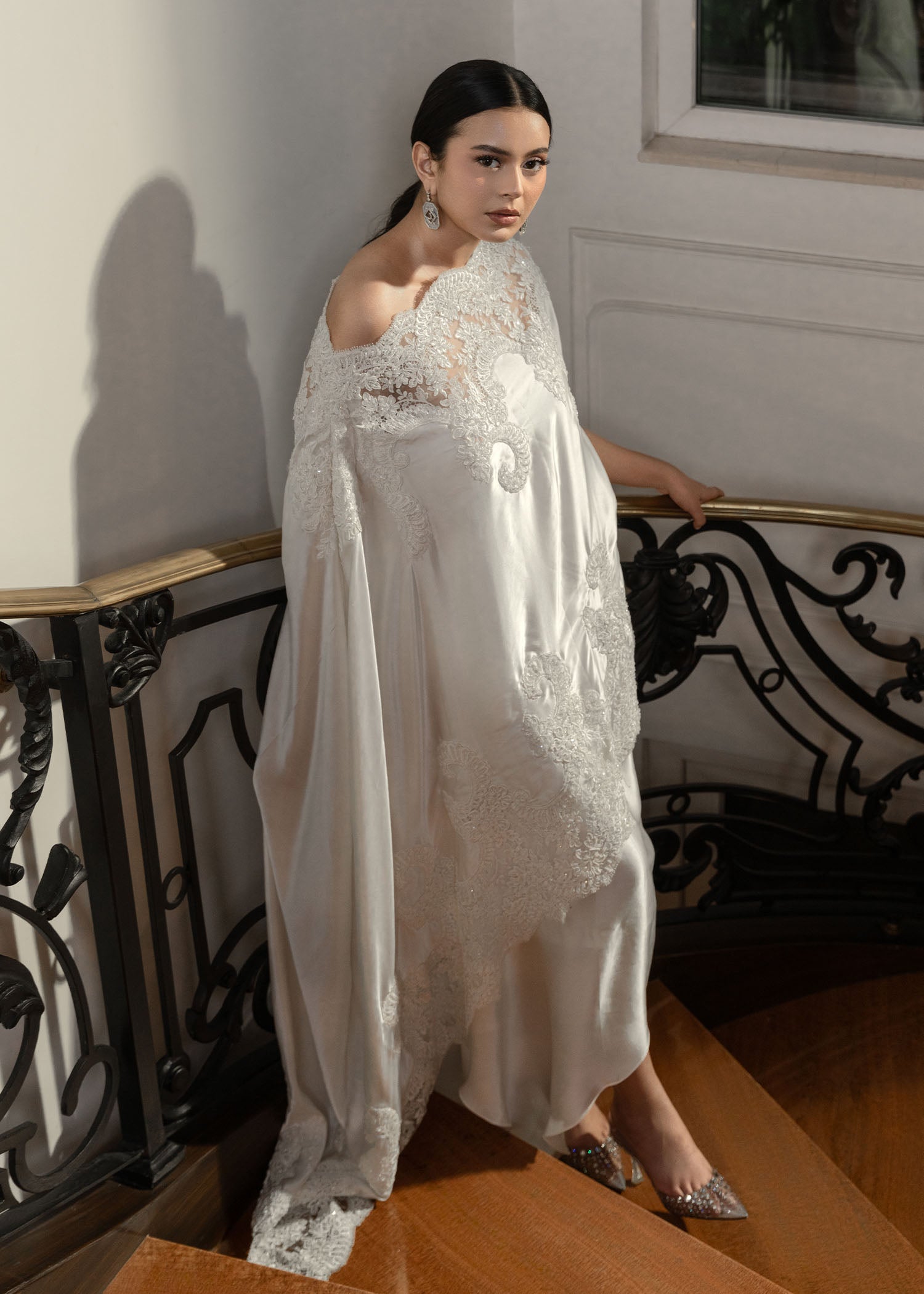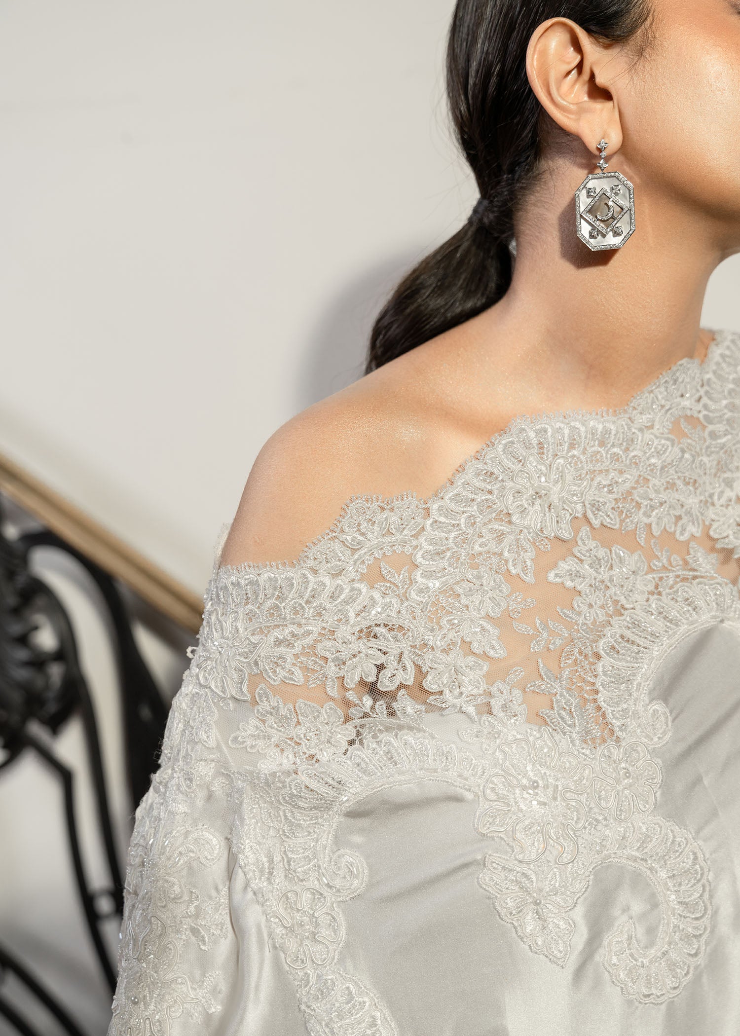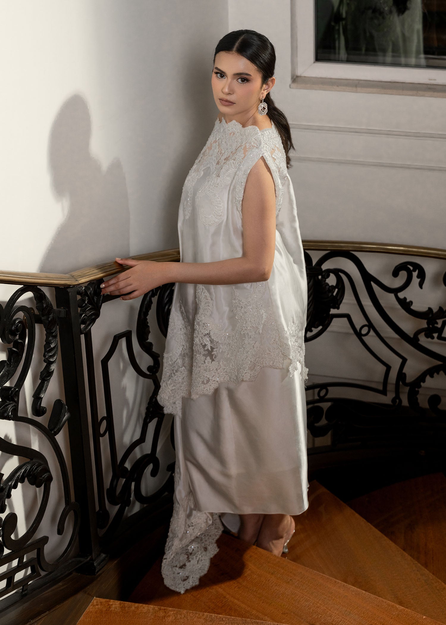 - Off-shoulder tunic in ivory hue featuring intricate lace detailing