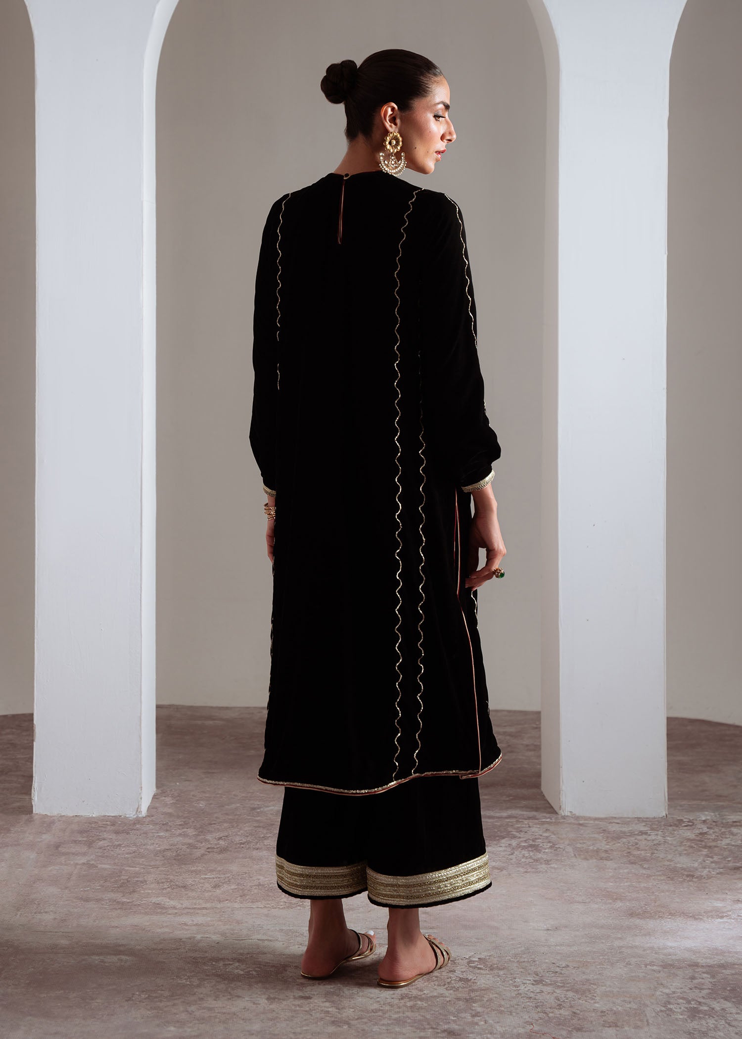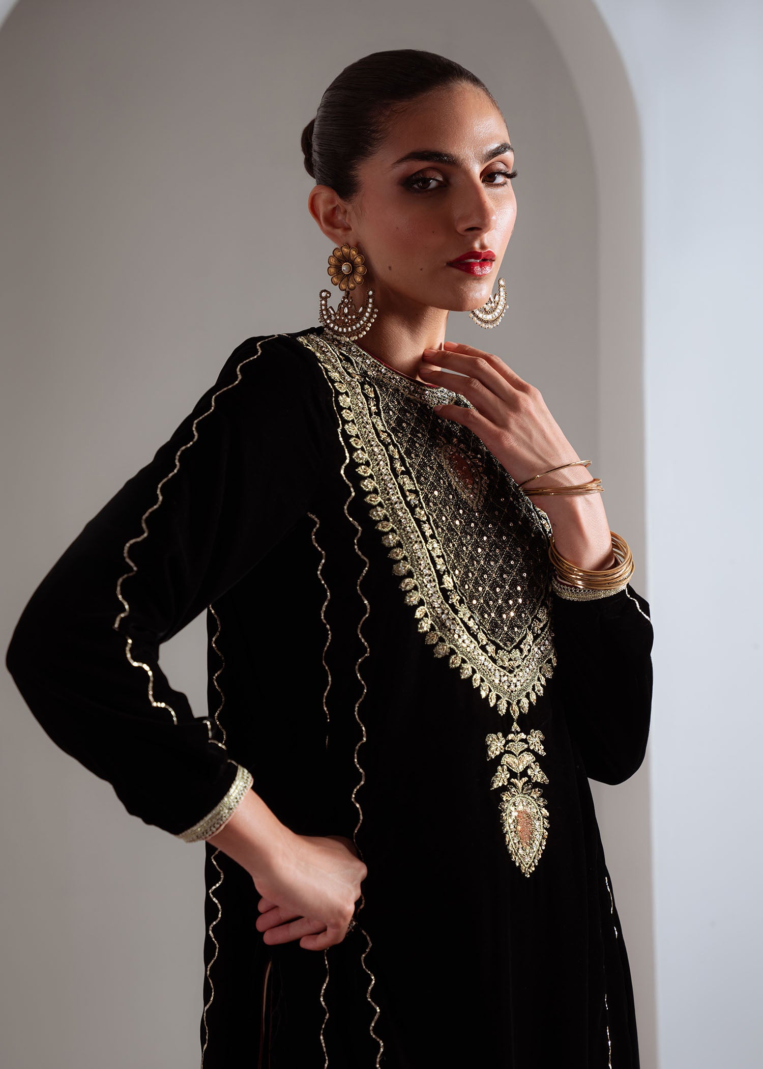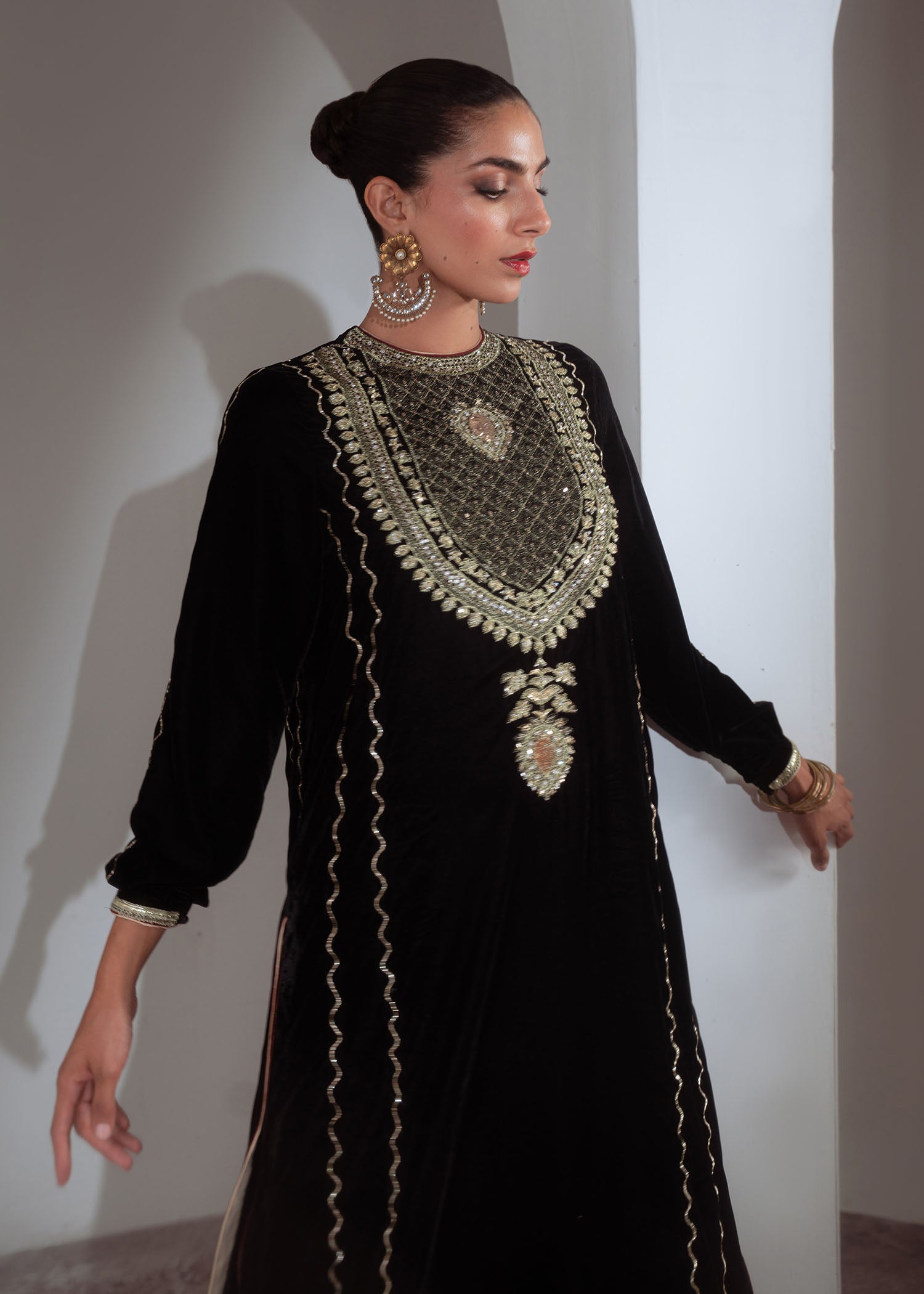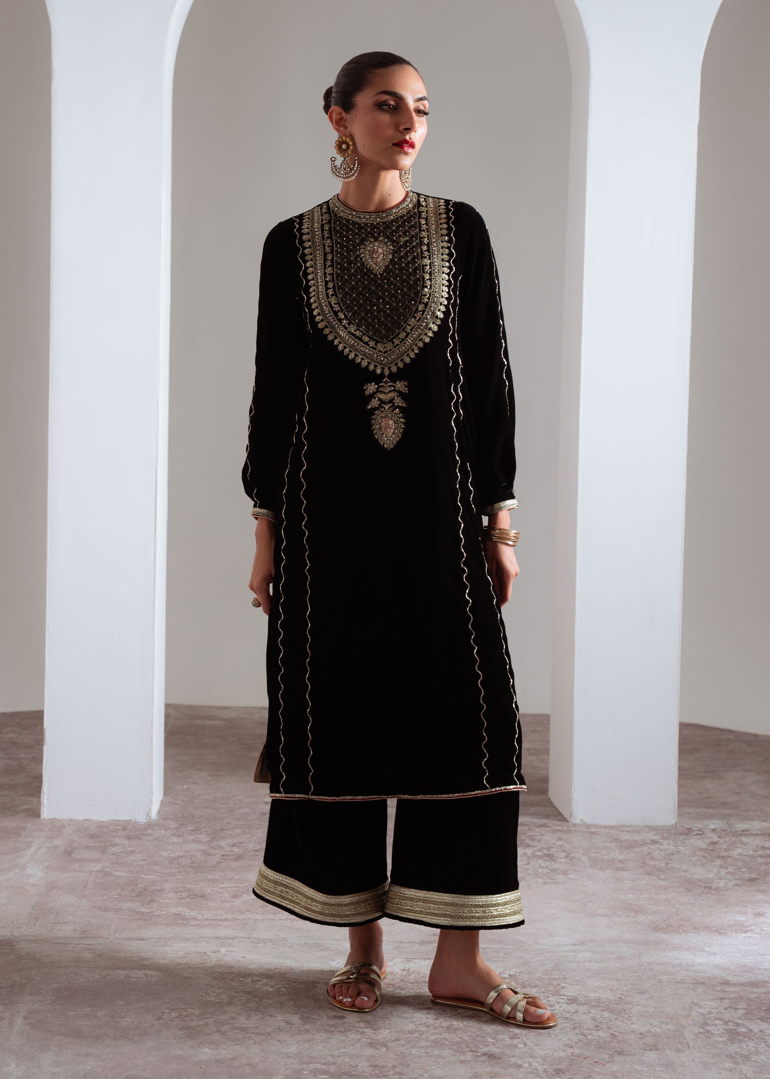 An exquisite ensemble in plush black velvet, this kurta is hand-embroidered with age-old techniques of gold pitta, zardozi, and sequins, creating a tapestry of timeless artistry. Paired with a matching velvet izaar, the set radiates sophistication and regal charm — a luxurious choice for festive evenings and formal occasions.