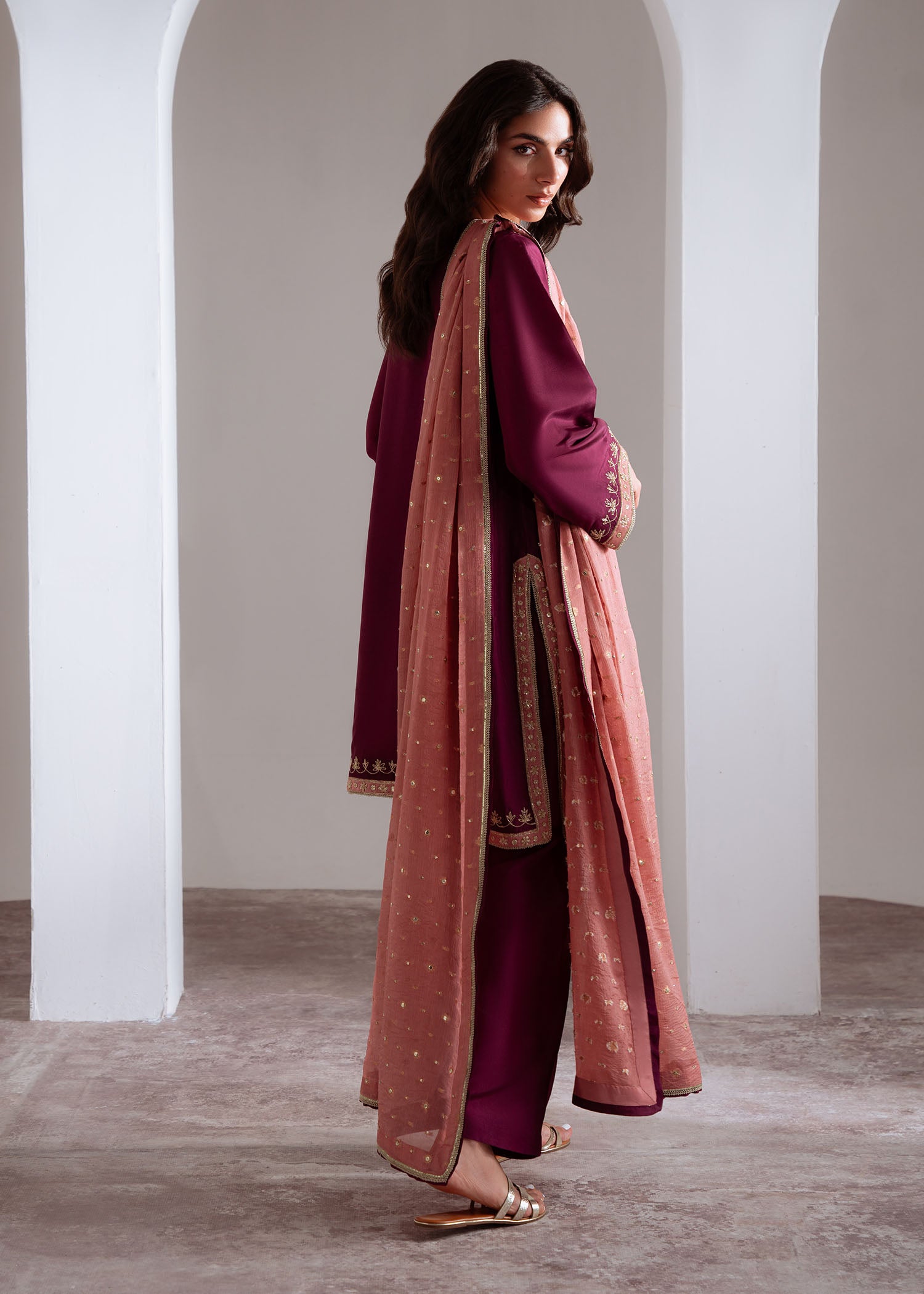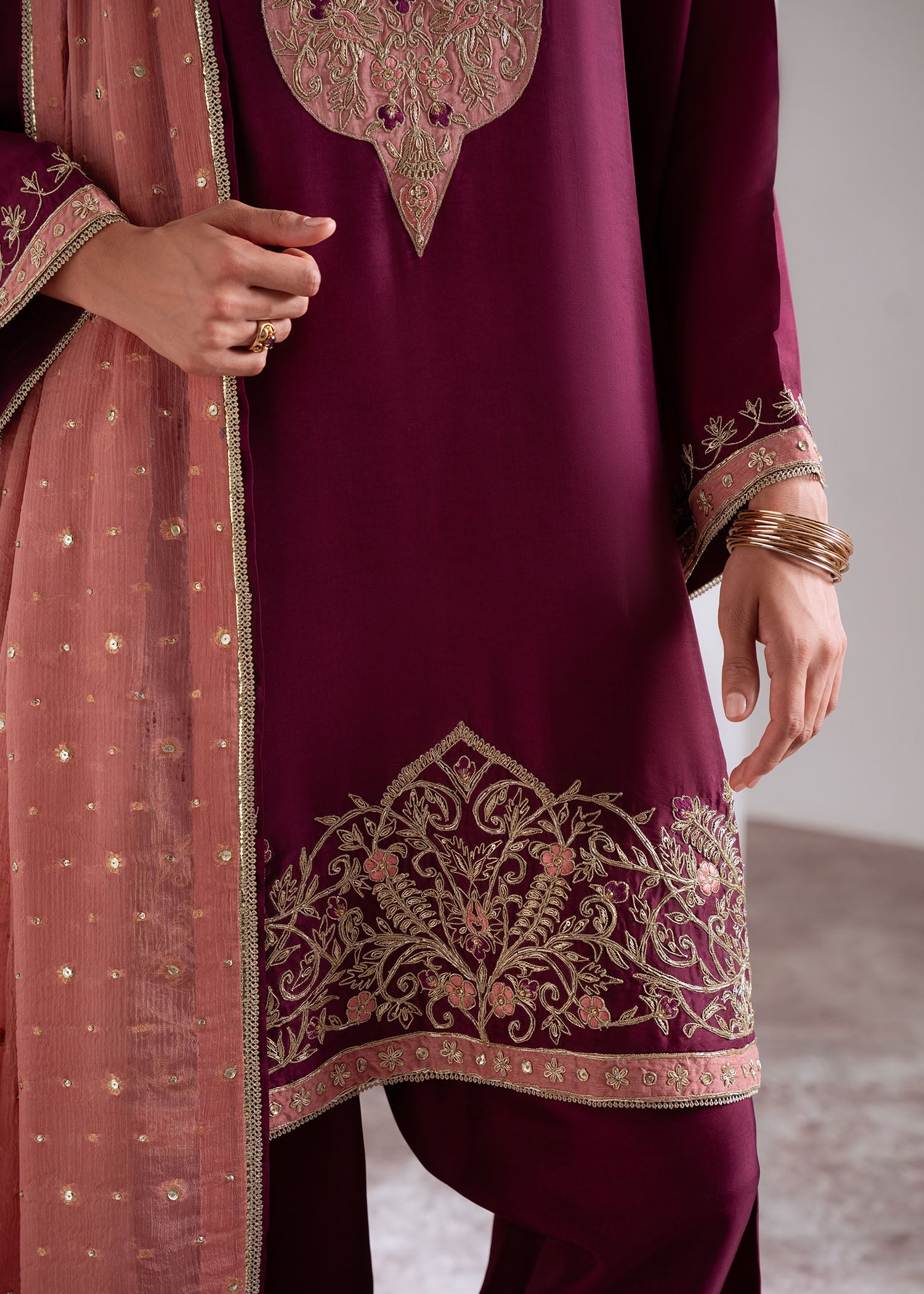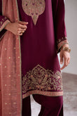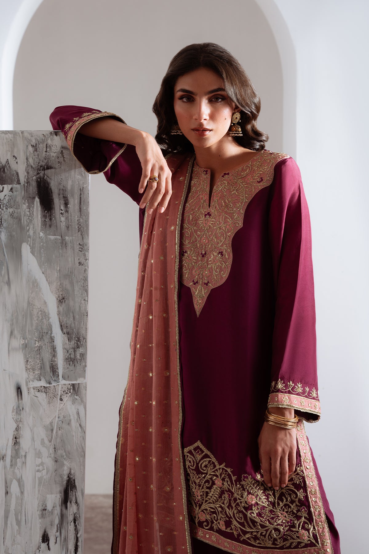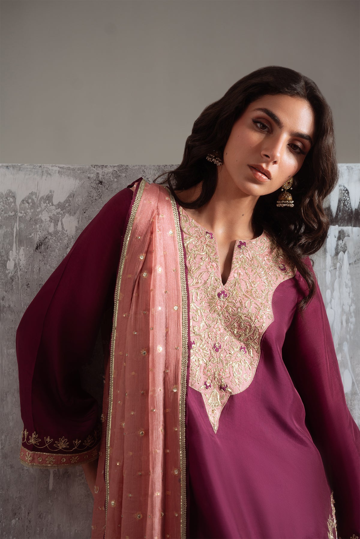 A rich plum ensemble that exudes refined elegance. The straight kurta features intricate hand-embroidered dori motifs in gold resham and sequins along the neckline and hem, creating a regal contrast against the deep jewel tone. Paired with a soft pink dupatta, delicately accented with crystals and sequins, this look strikes the perfect balance between tradition and sophistication. Ideal for festive occasions and wedding soirées.