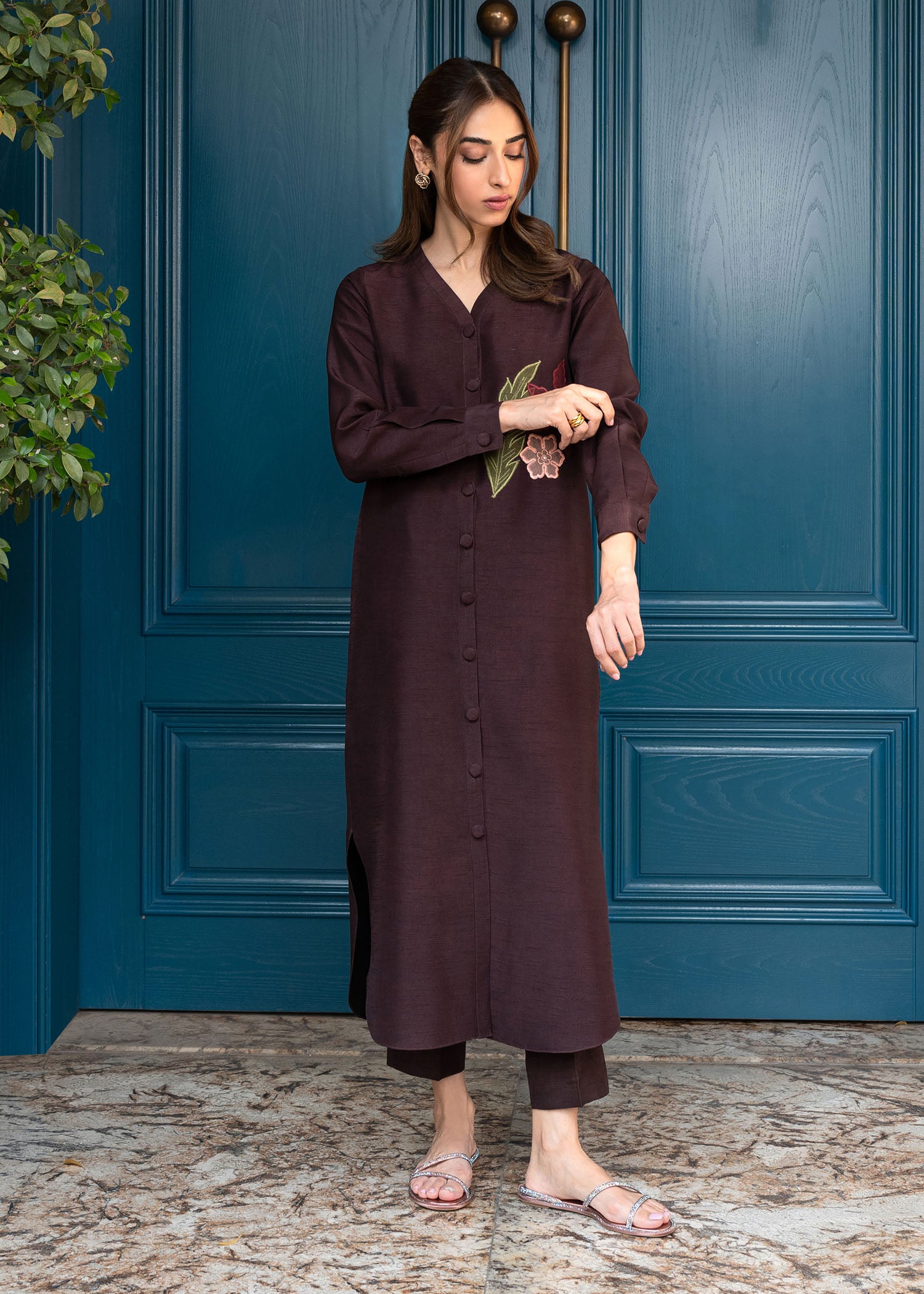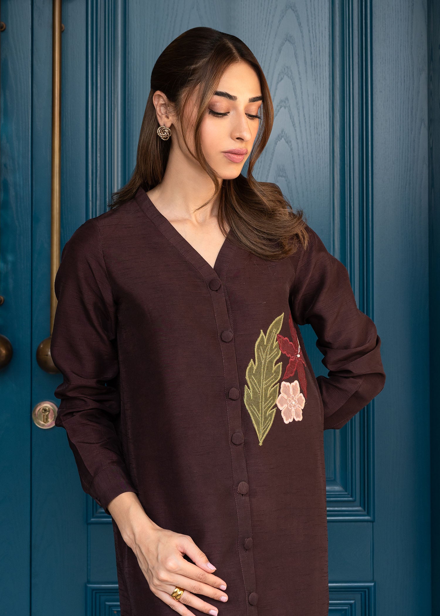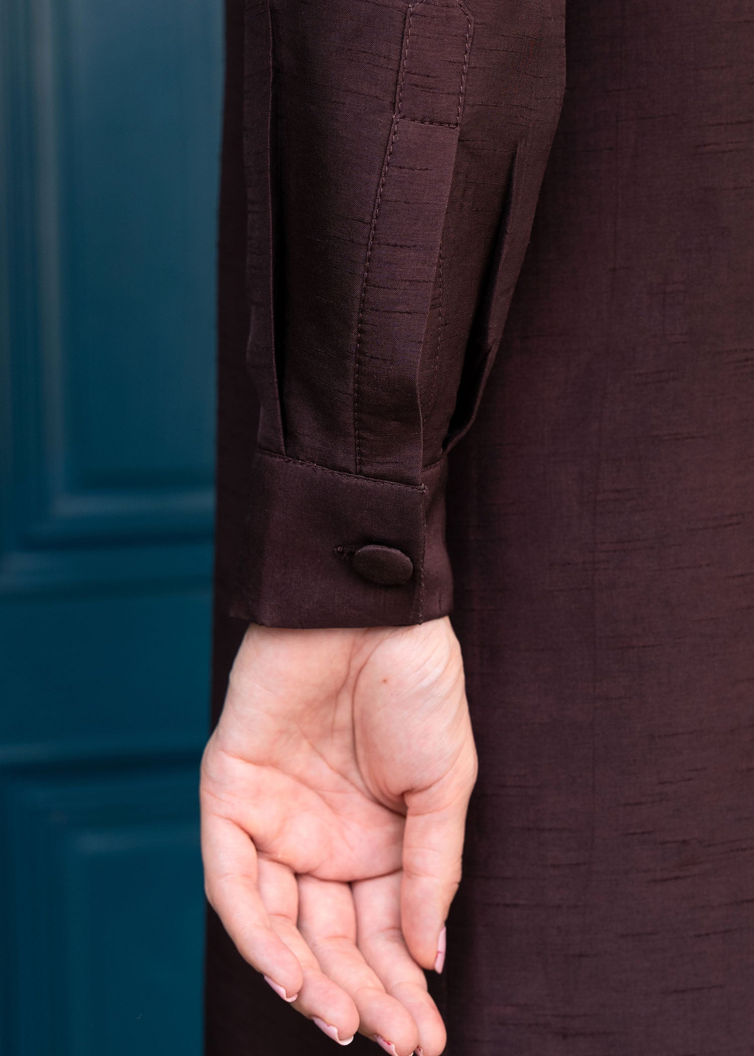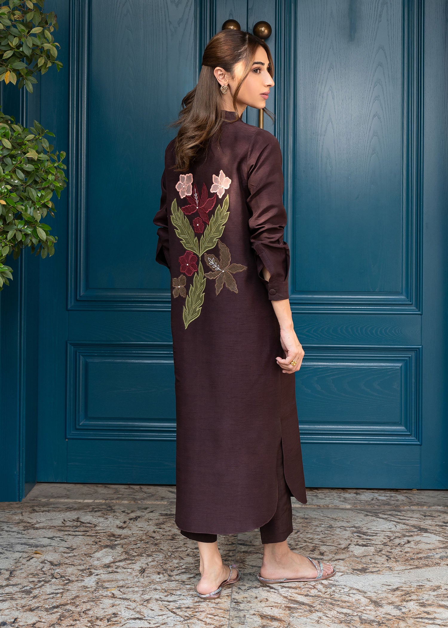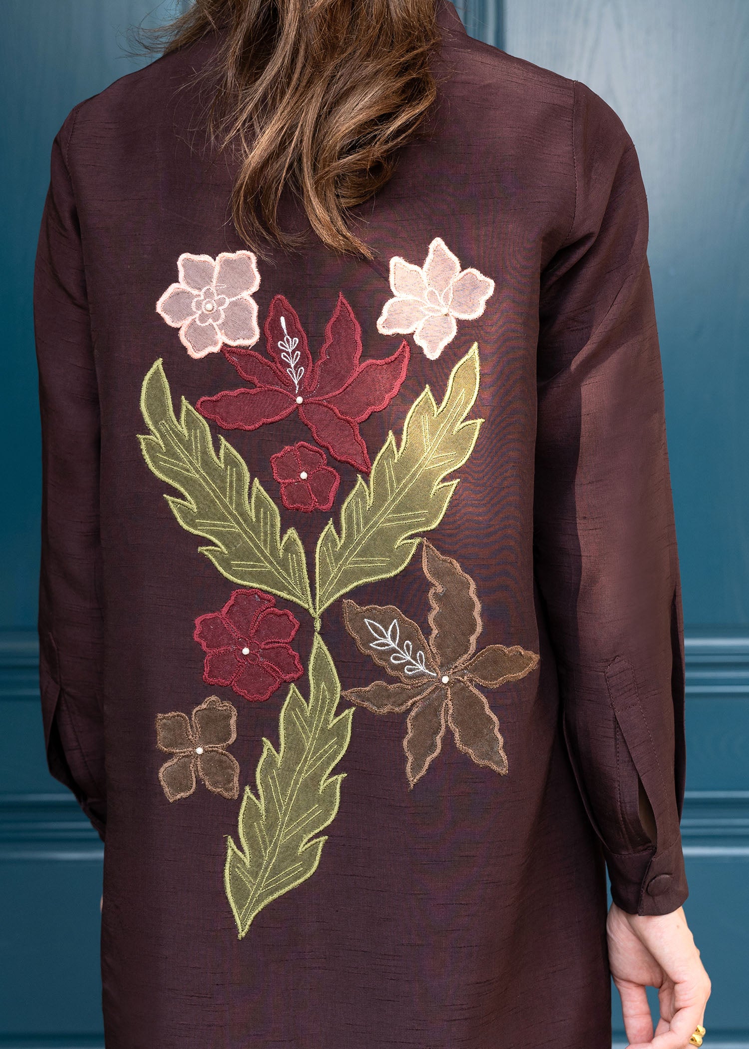 Timeless elegance defines our Nima shirt, crafted from luxurious brown raw silk. Featuring intricate patchwork in complementary hues, it’s paired with a matching trouser for a sophisticated look. Easily dress up or down for any occasion.