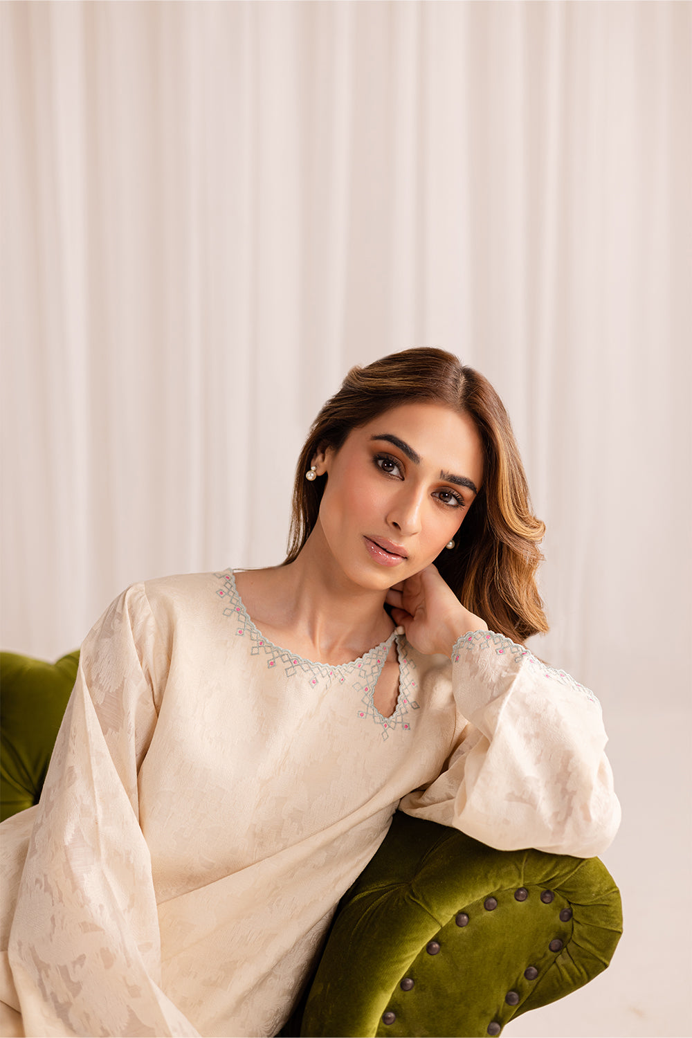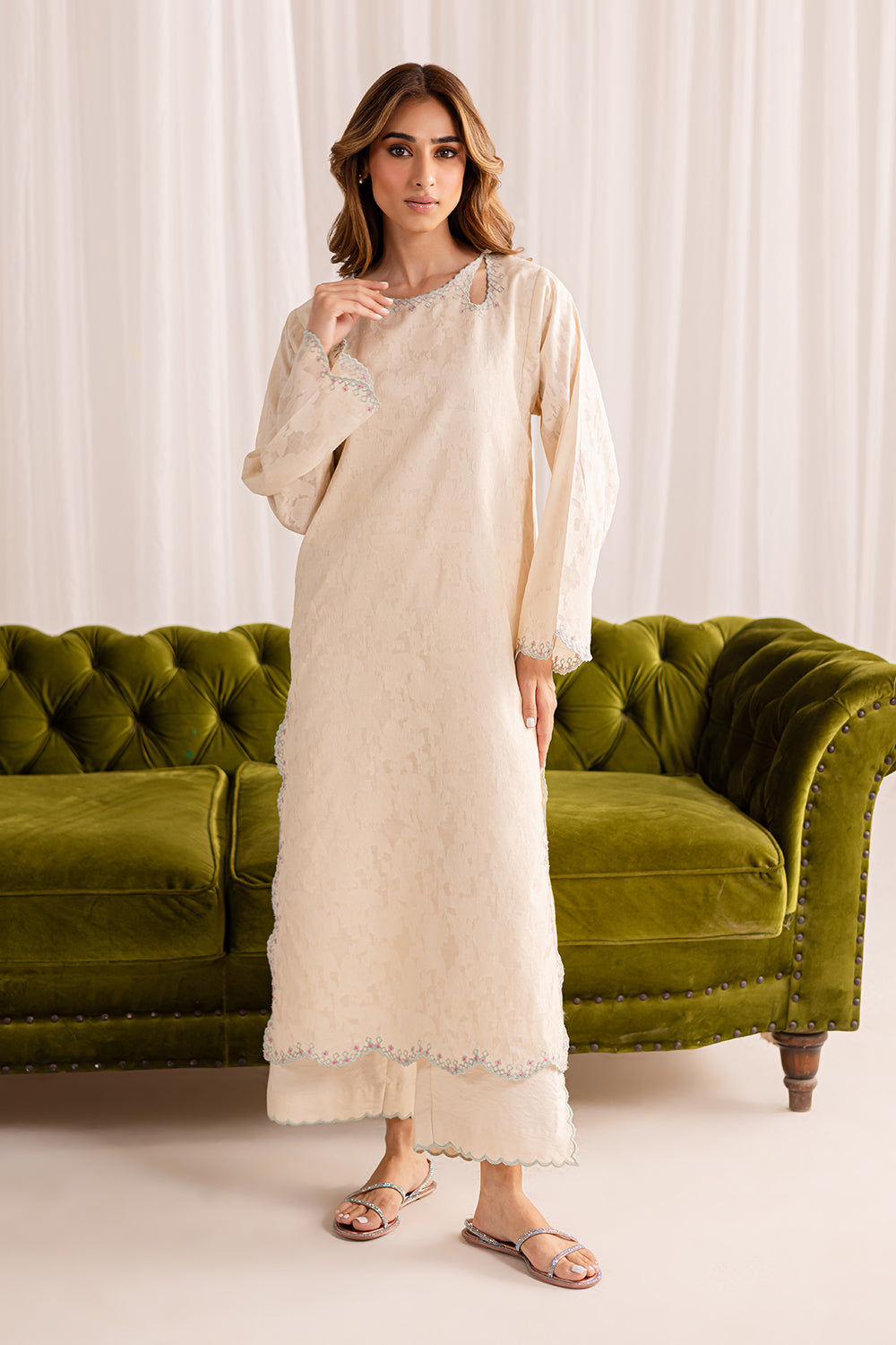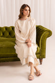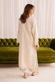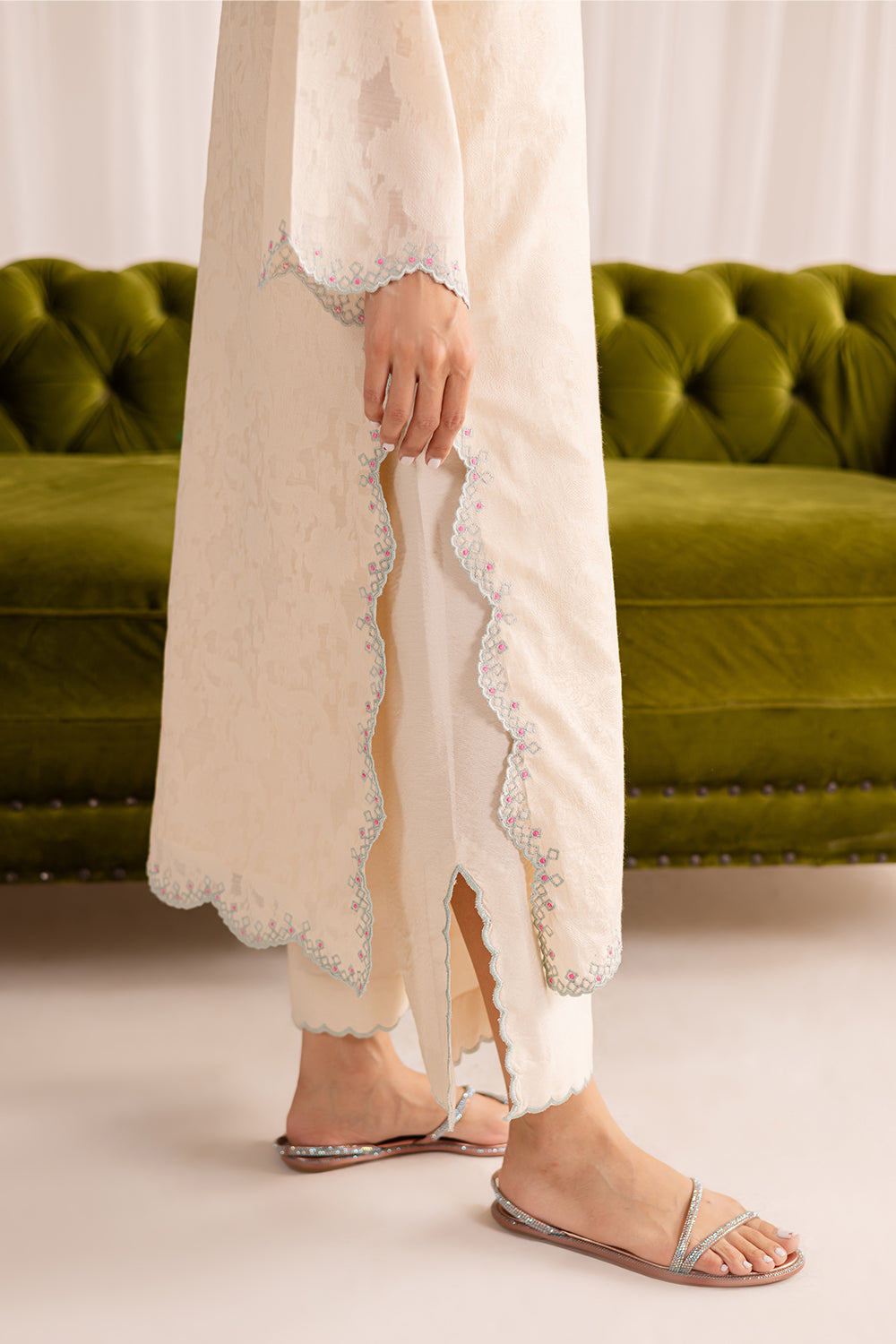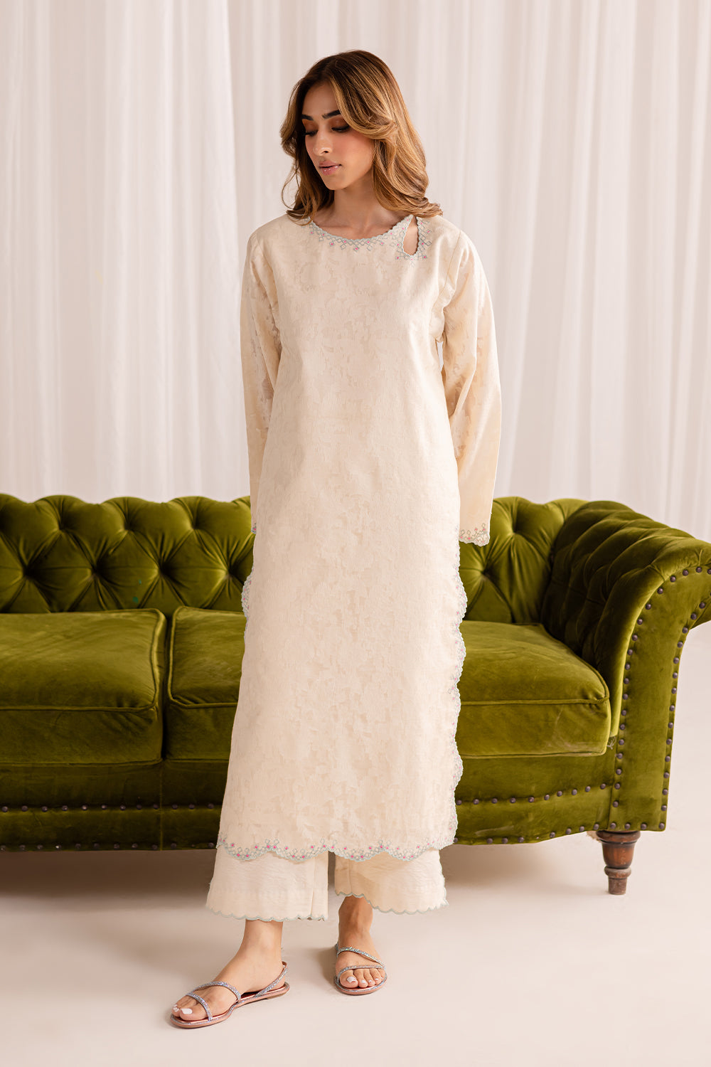 Exude elegance in our buttery white cotton lawn kurta, intricately embellished with fine embroidery all over. Paired with our matching crafted izaar, this ensemble offers a complete, sophisticated look.