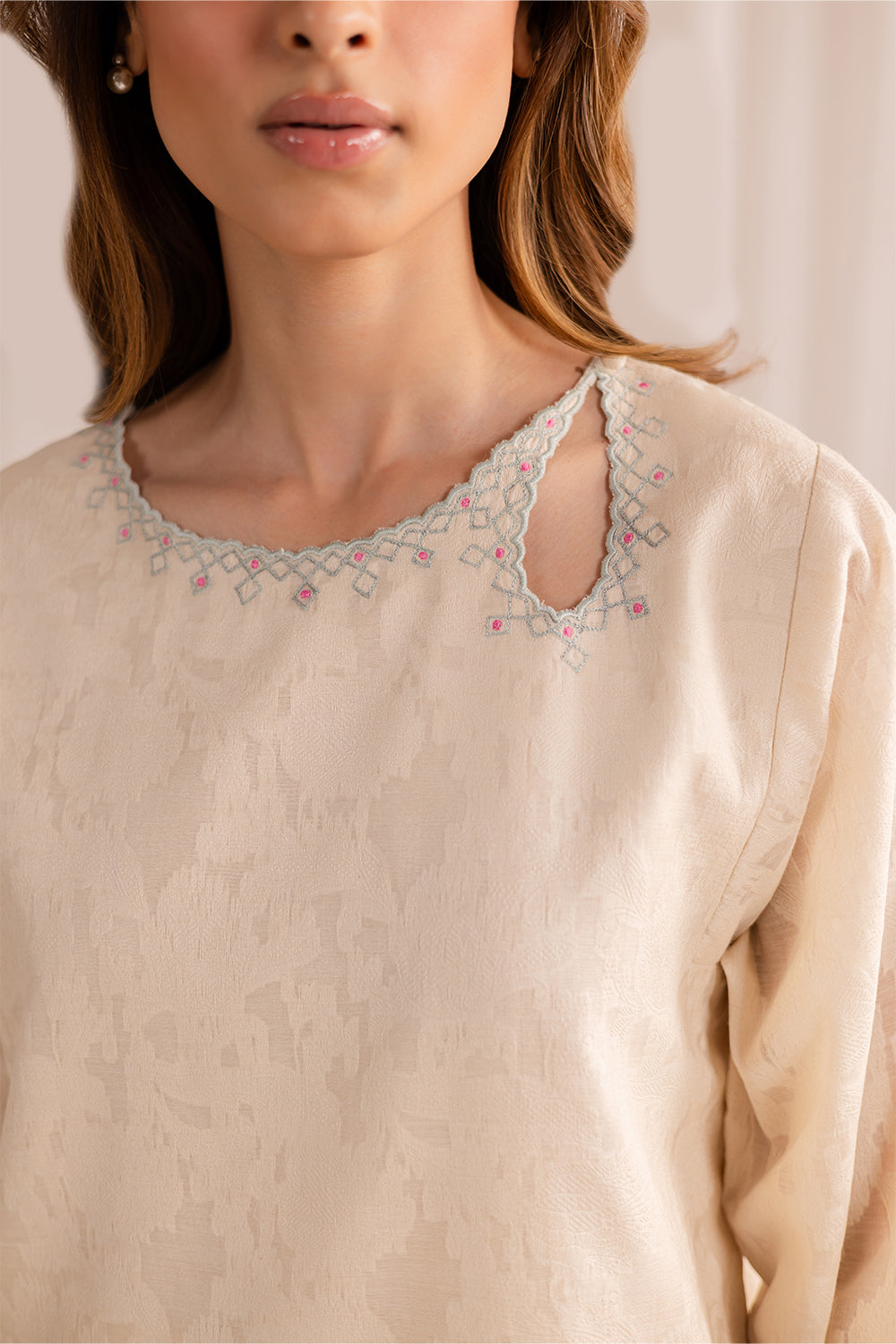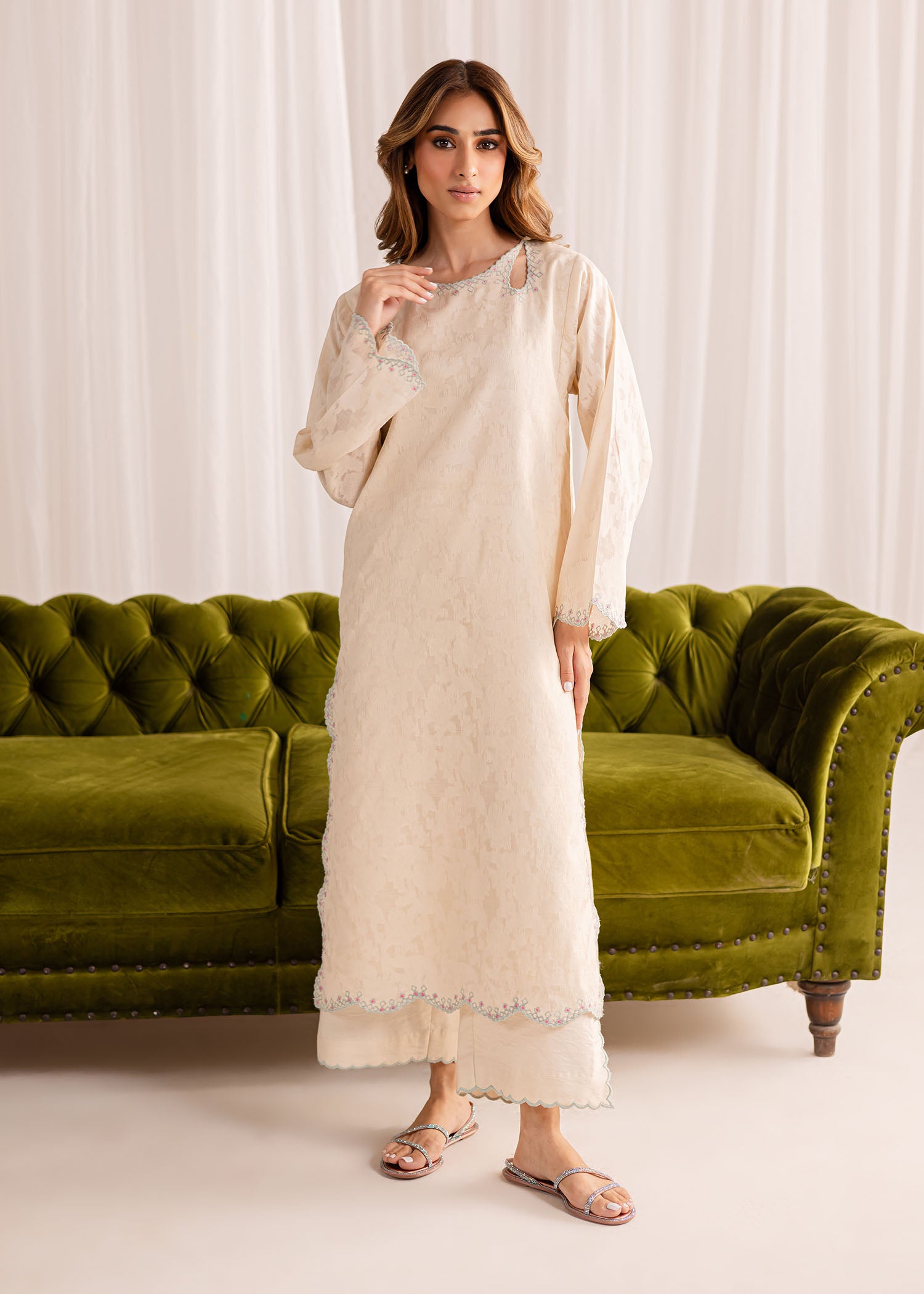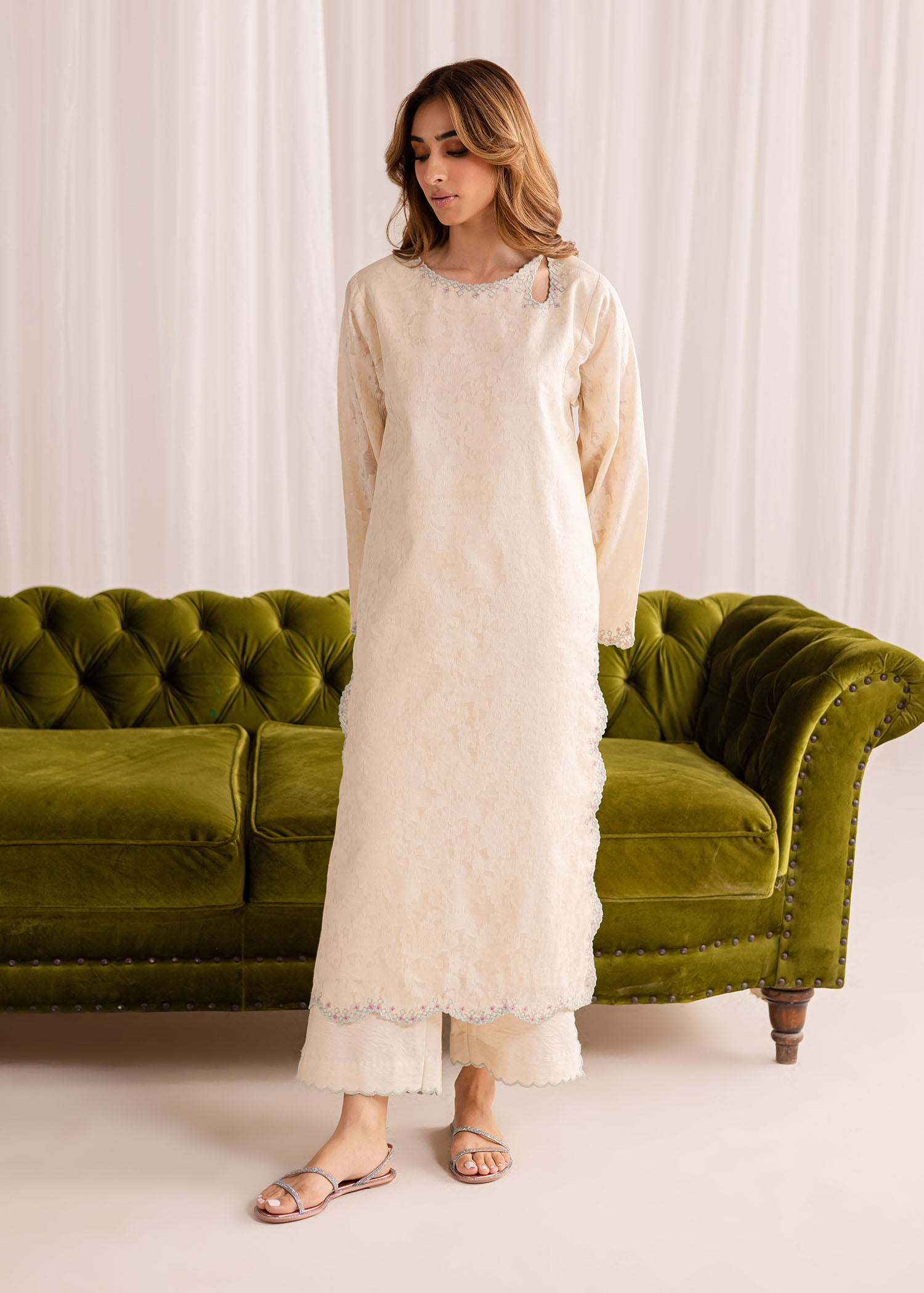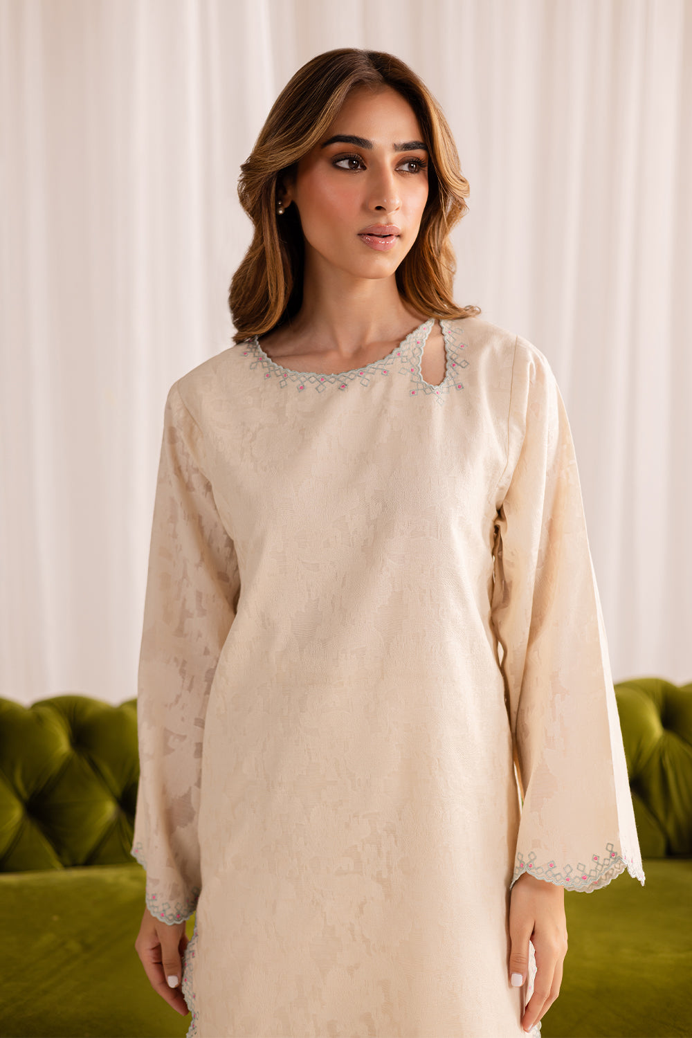 Exude elegance in our buttery white cotton lawn kurta, intricately embellished with fine embroidery all over. Paired with our matching crafted izaar, this ensemble offers a complete, sophisticated look.