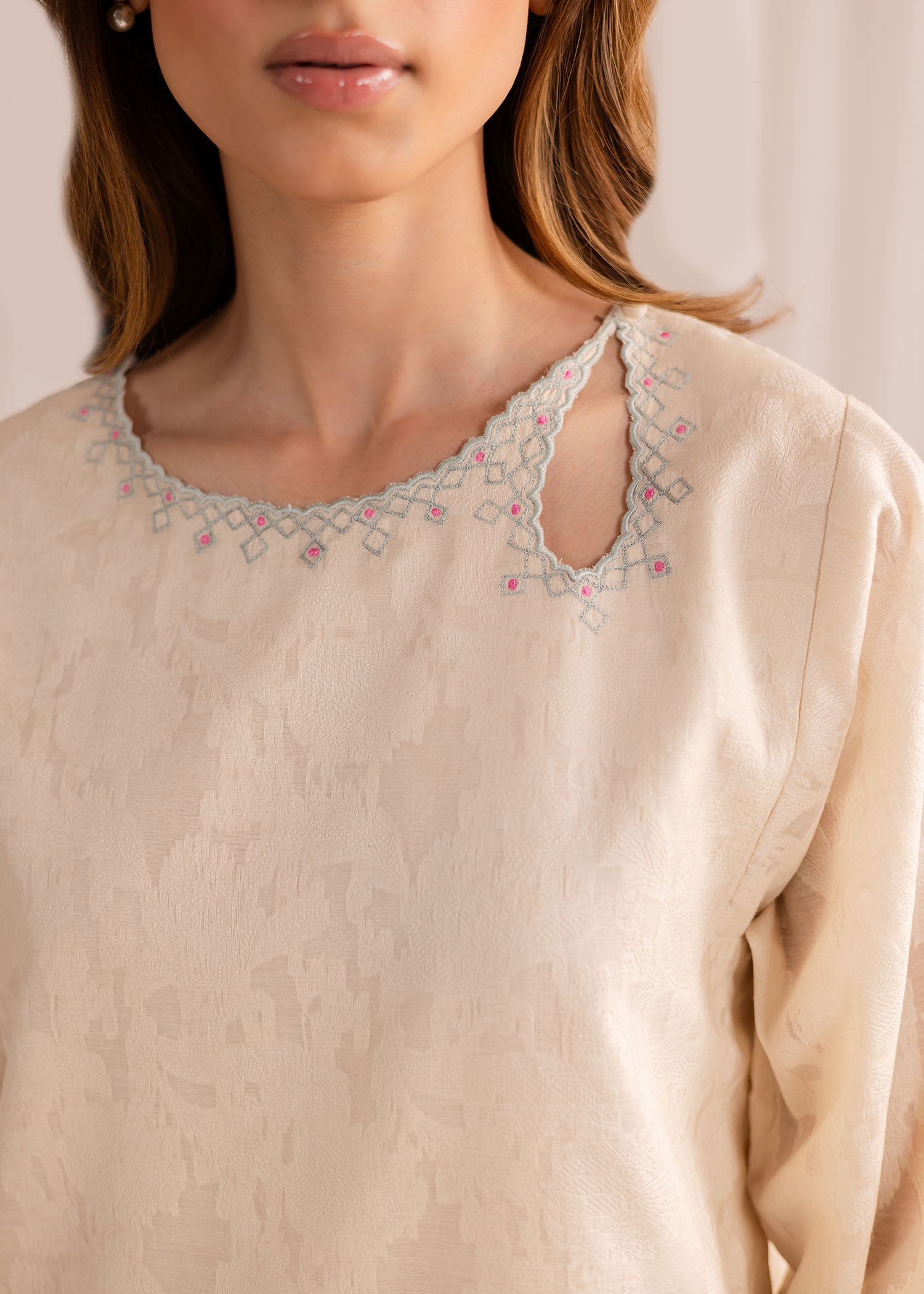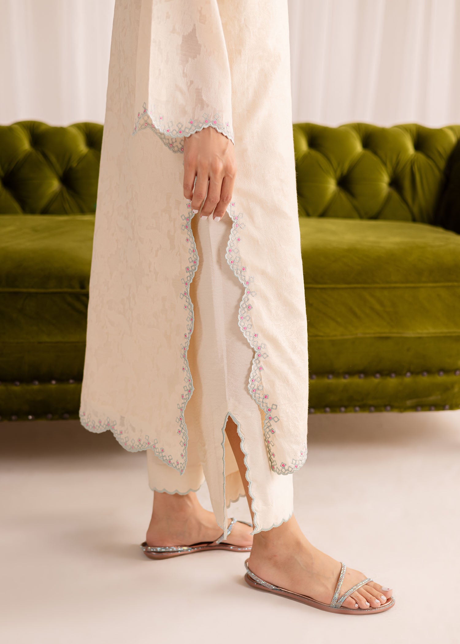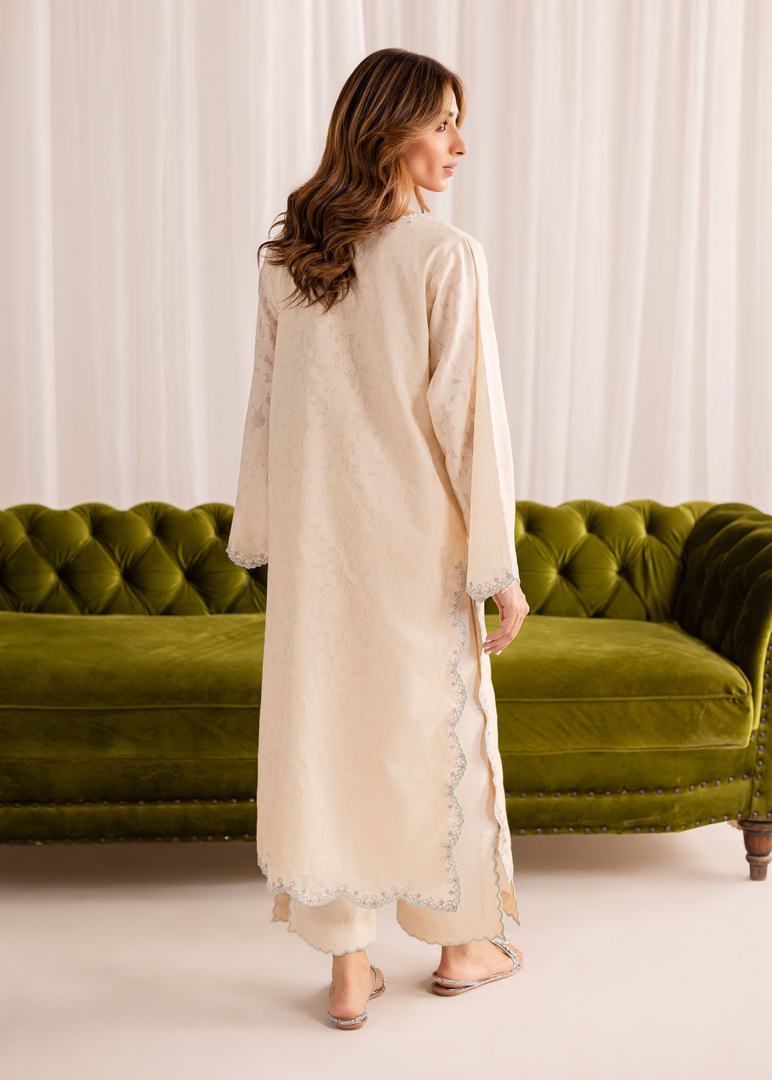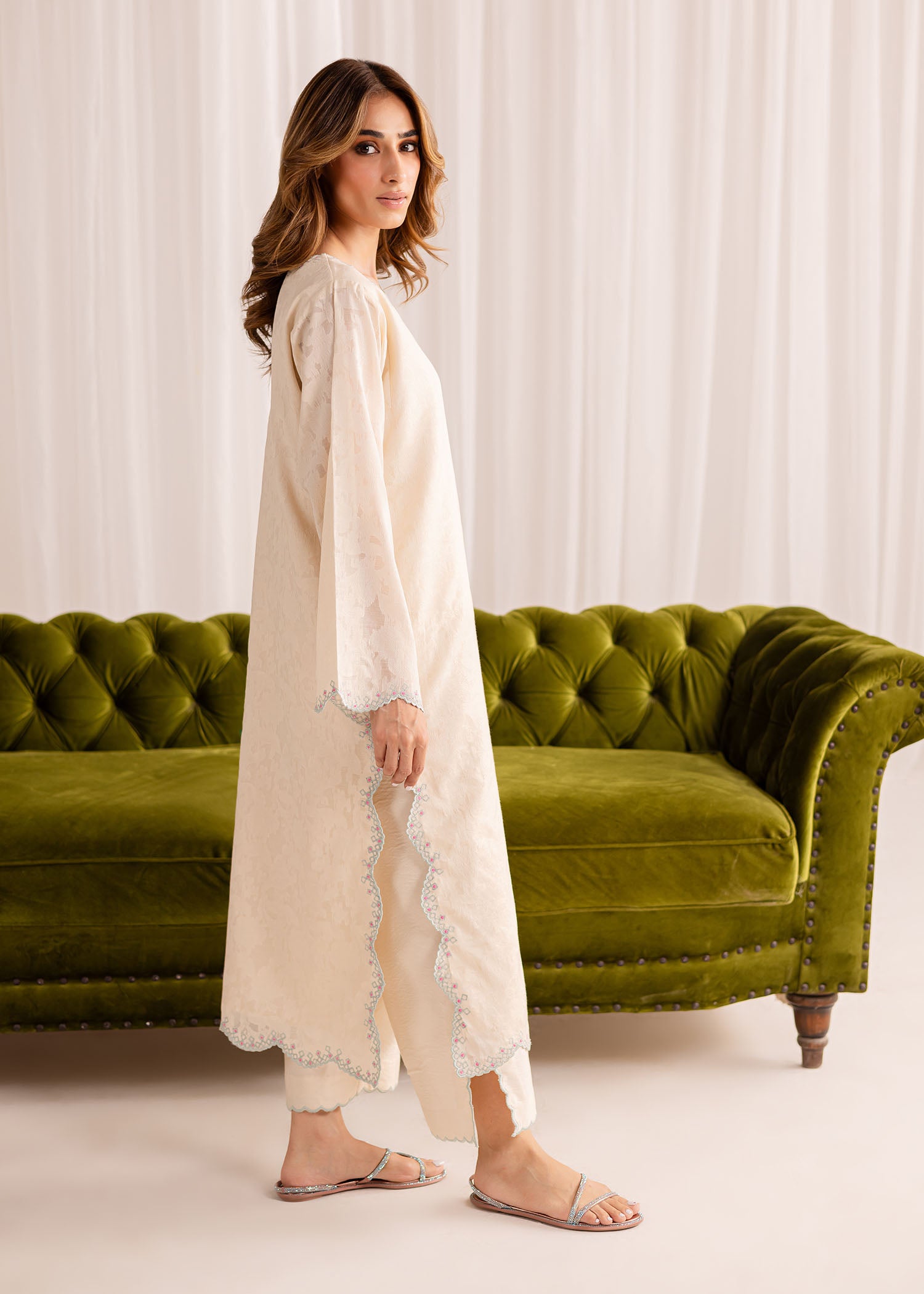 Exude elegance in our buttery white cotton lawn kurta, intricately embellished with fine embroidery all over. Paired with our matching crafted izaar, this ensemble offers a complete, sophisticated look.