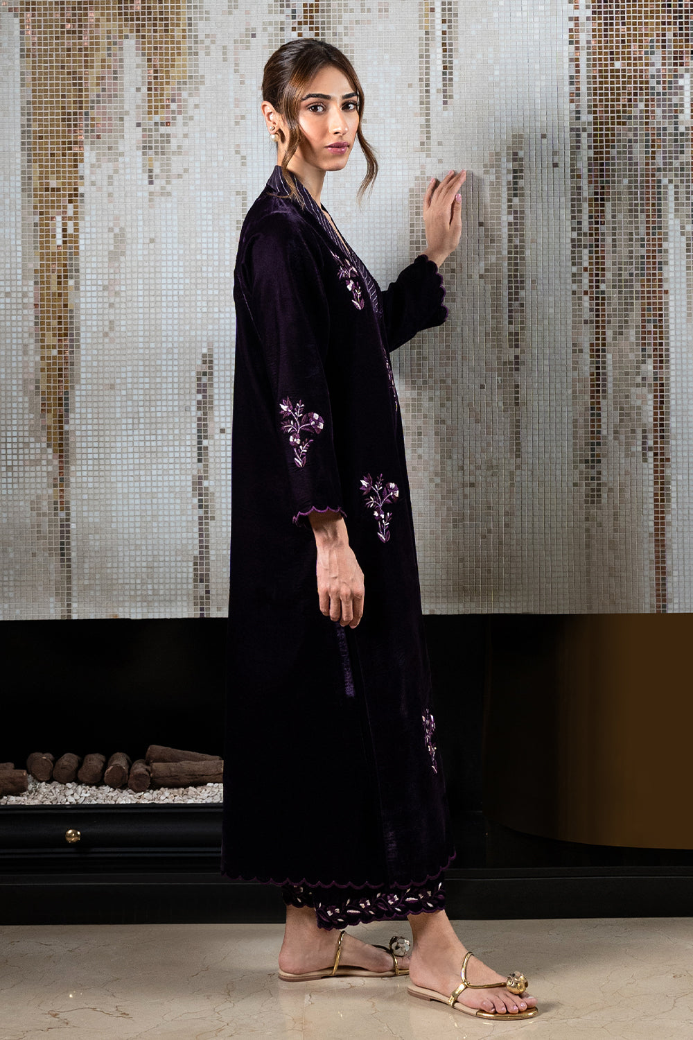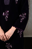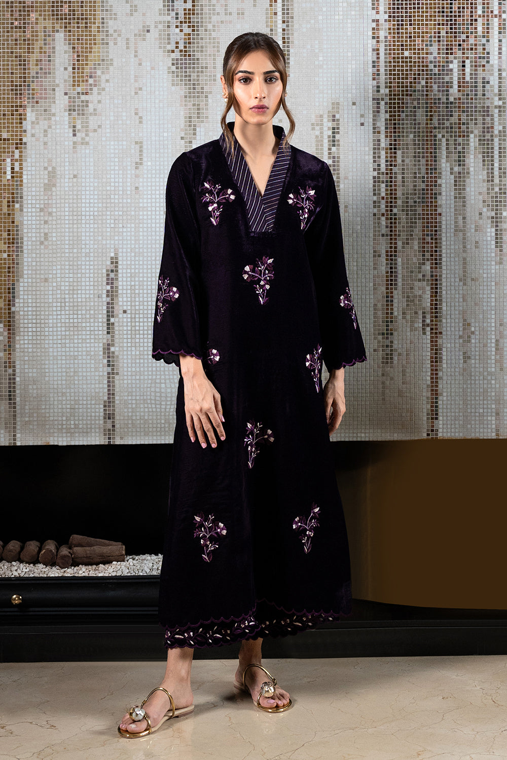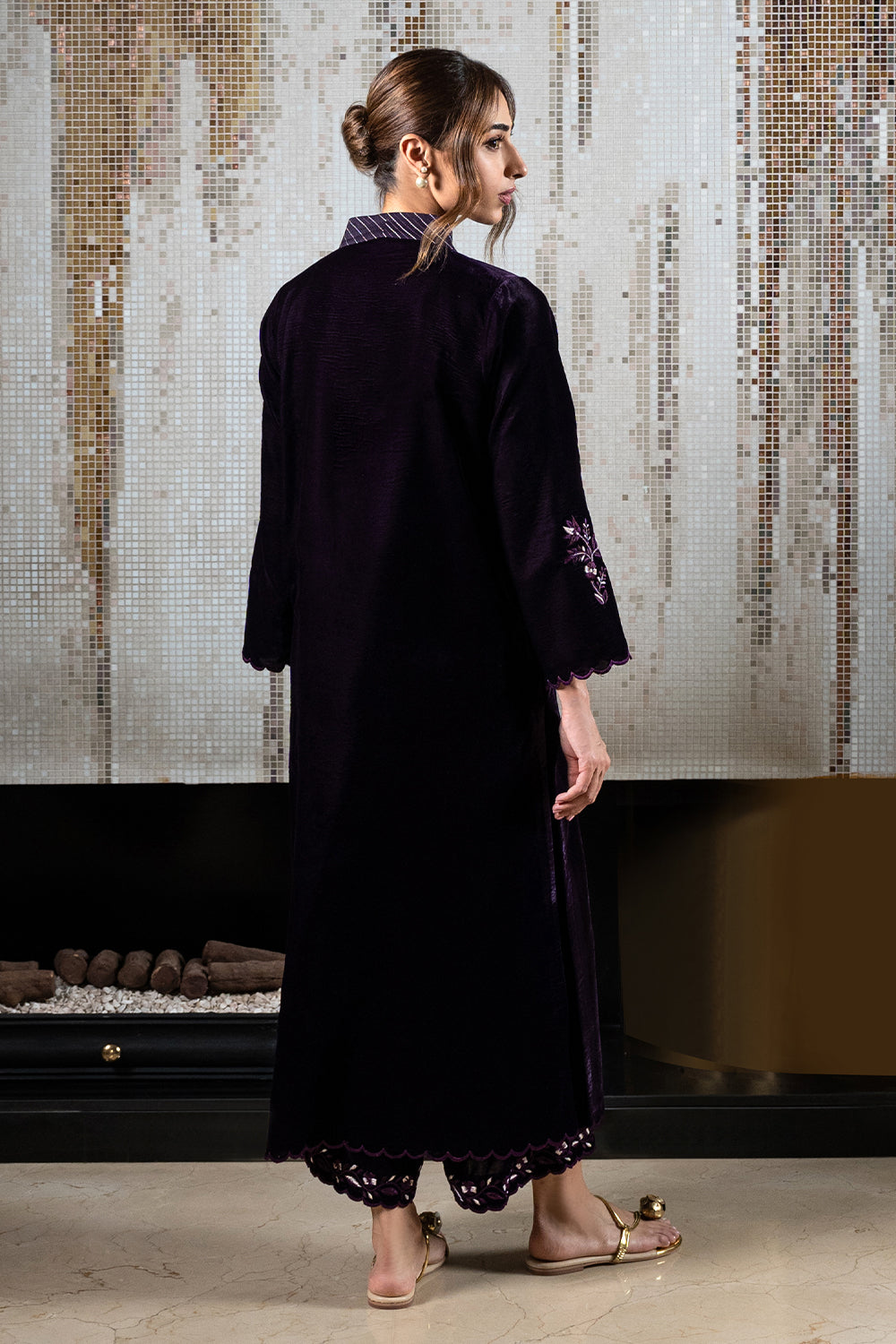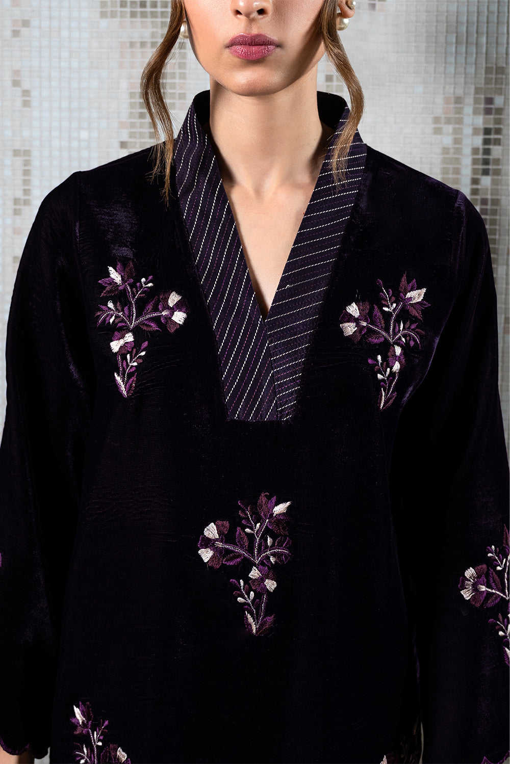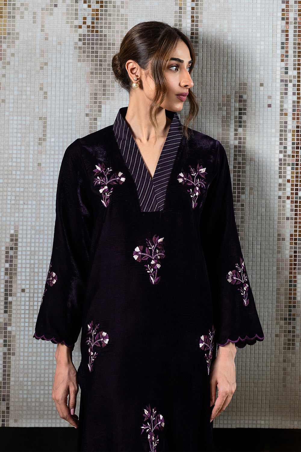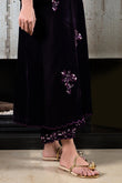 Indulge in timeless sophistication with our exquisite dark purple velvet kurta, elegantly embroidered with tonal resham embroidery inspired by classic chintz motifs. Paired with a matching velvet izaar, this ensemble is perfect for any occasion.