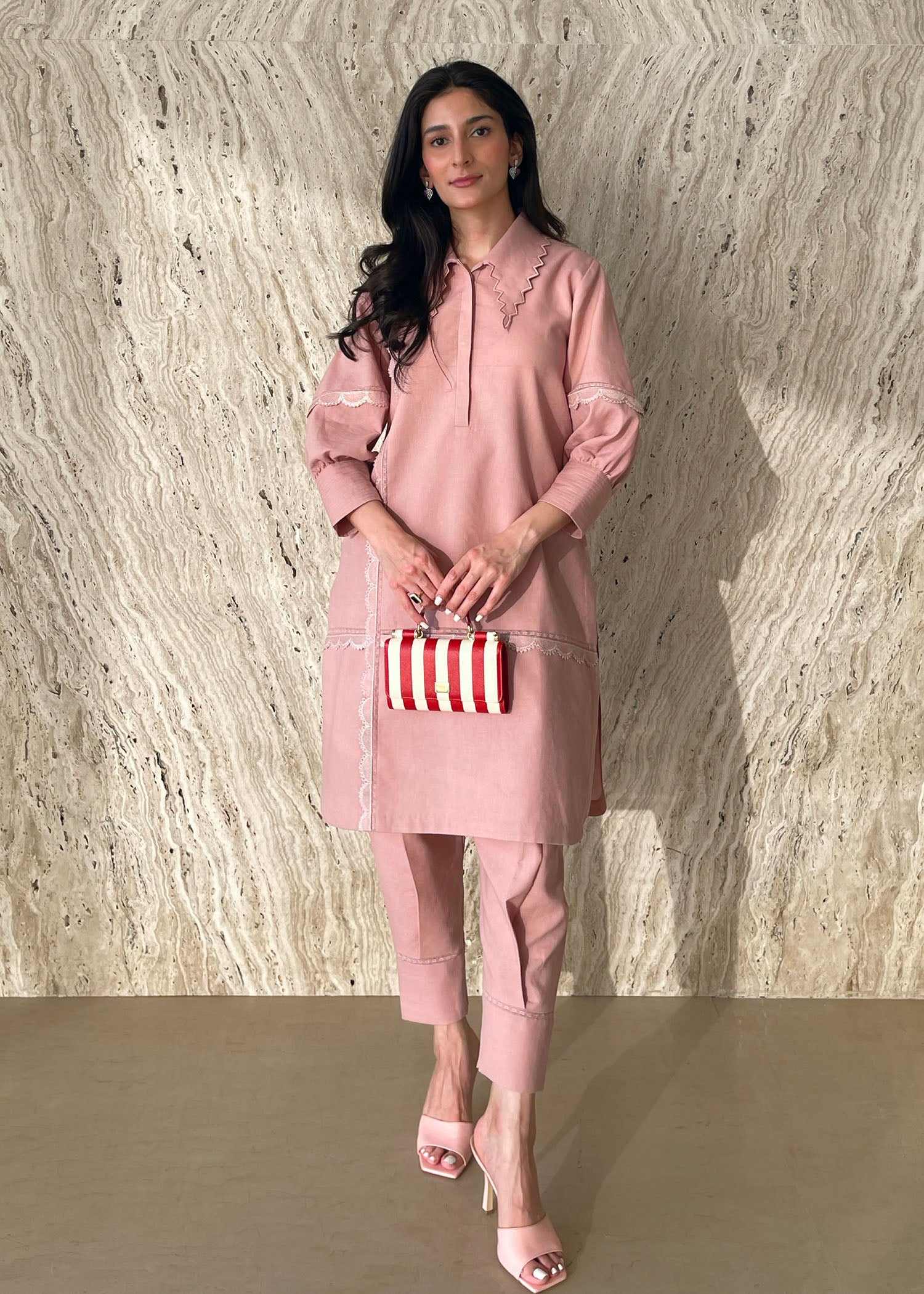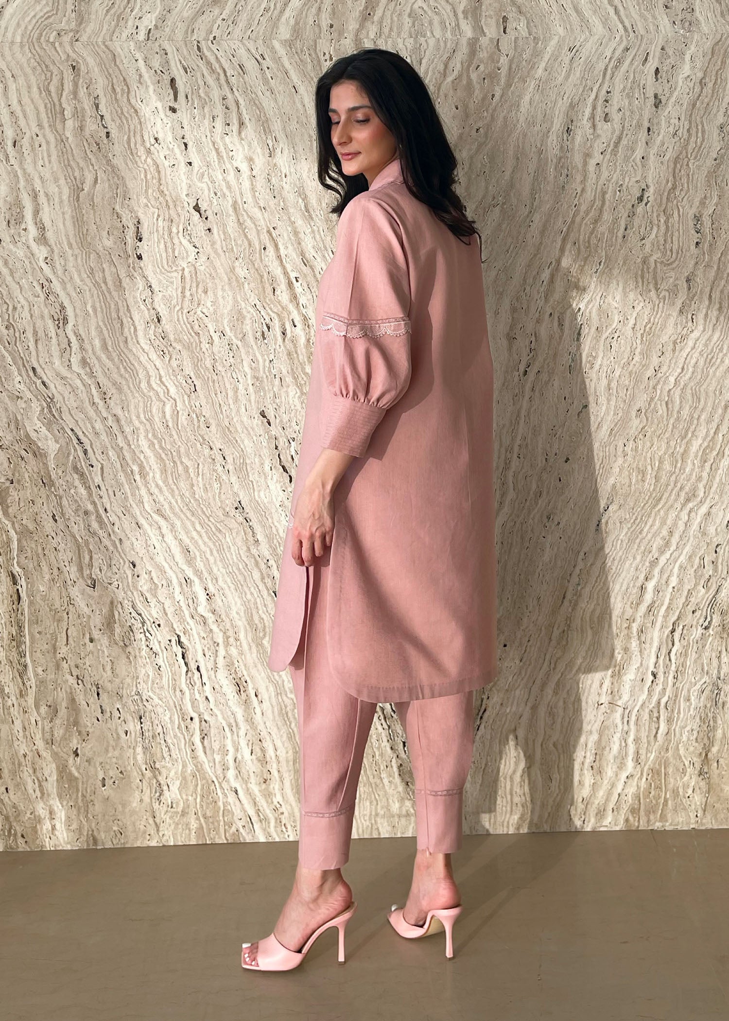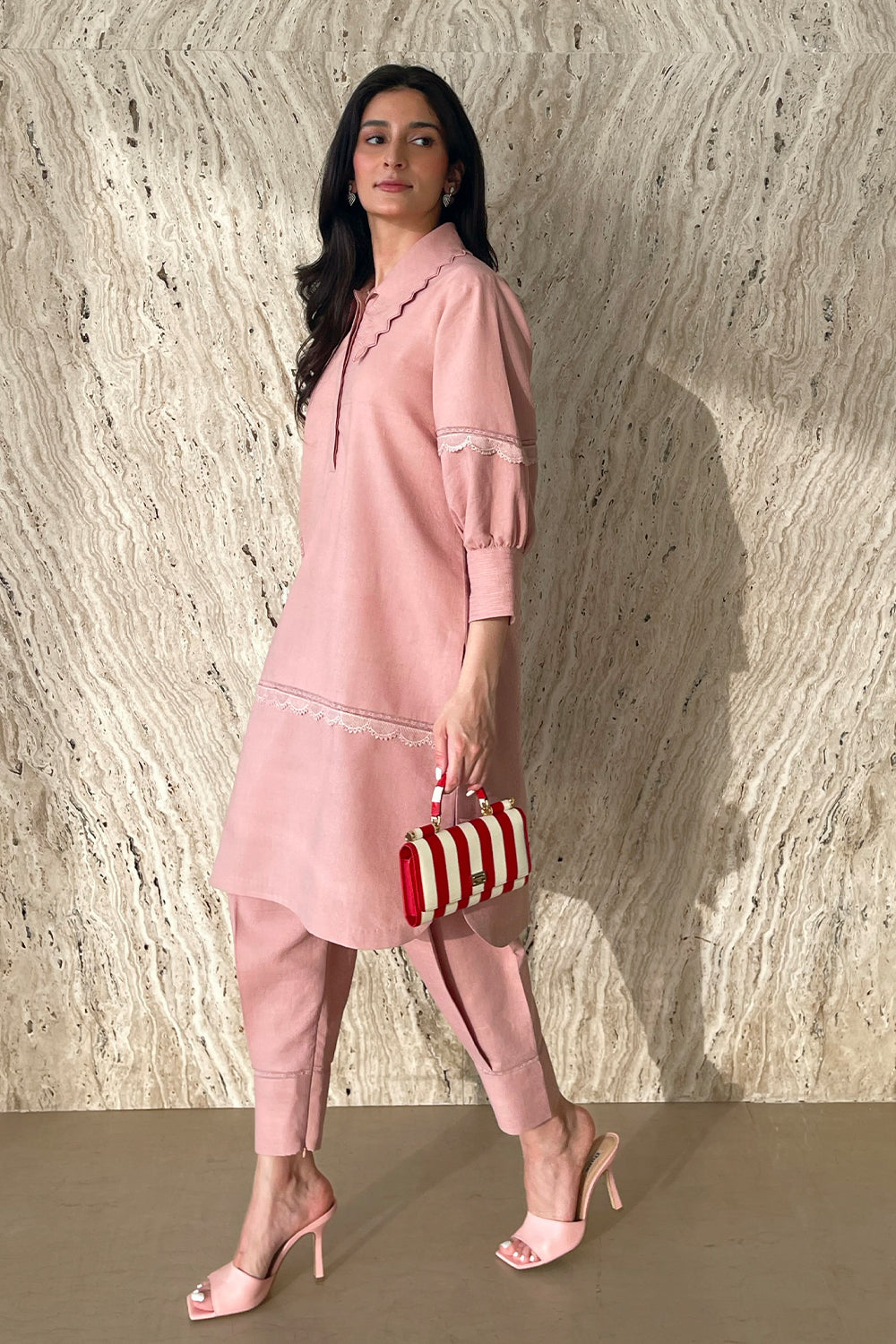 Fall in love with our Powder Pink Cotton Nura Set. Whimsical collar, lace details, and a matching pleated shalwar make this set a forever favorite. Buy now and treasure for seasons to come.