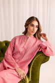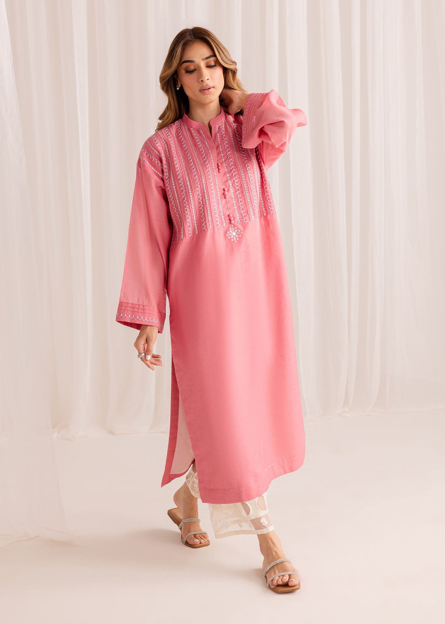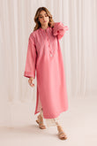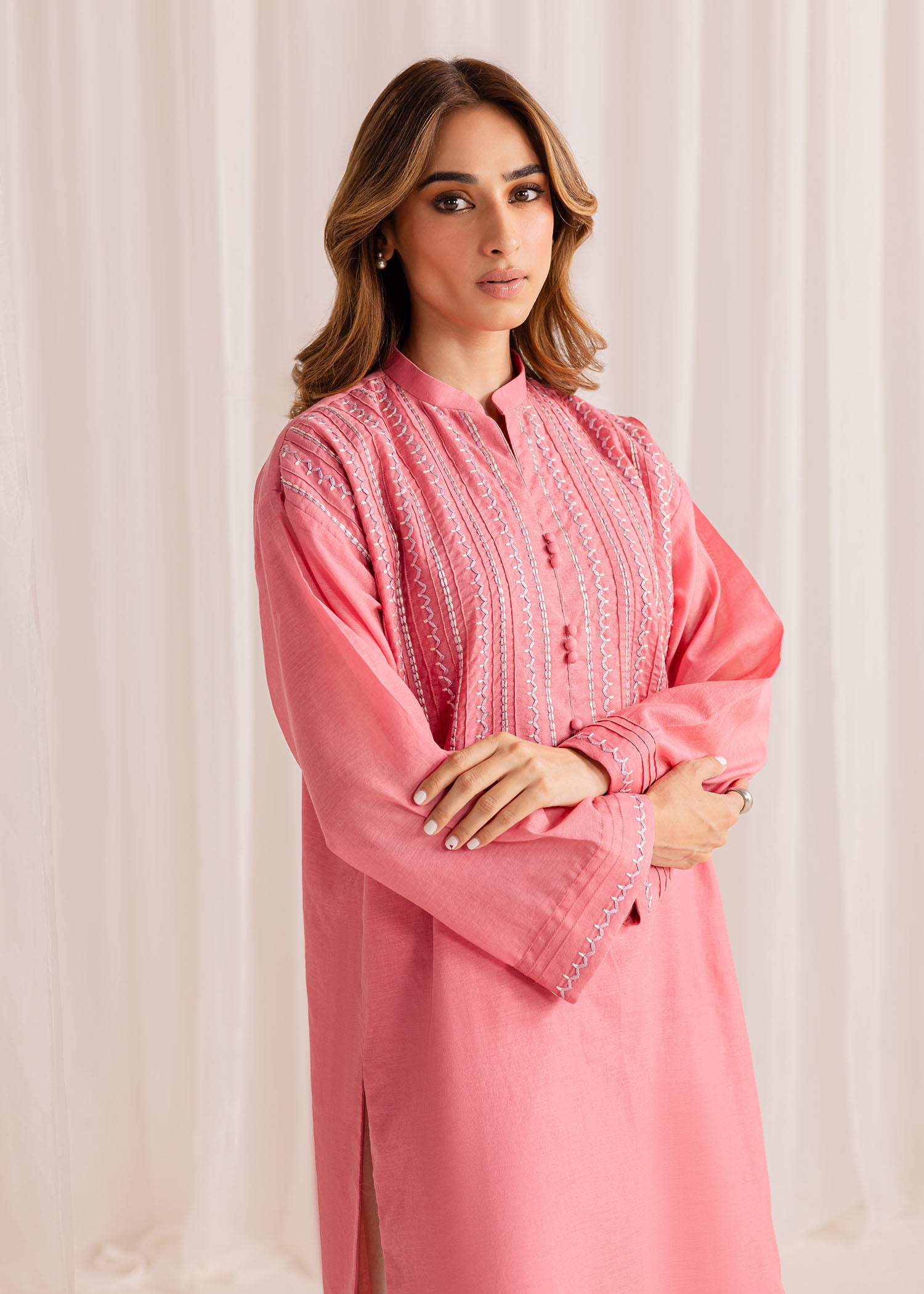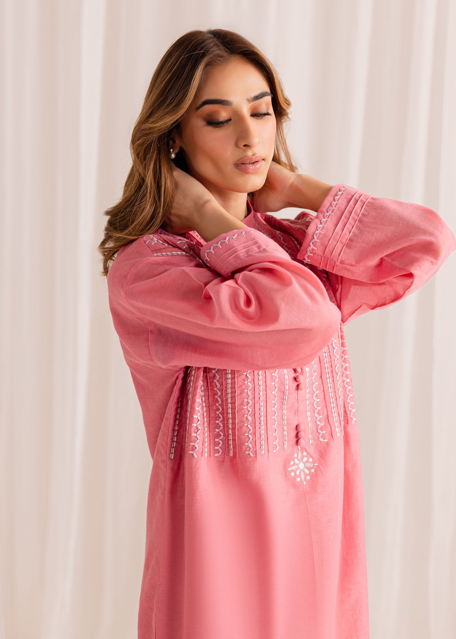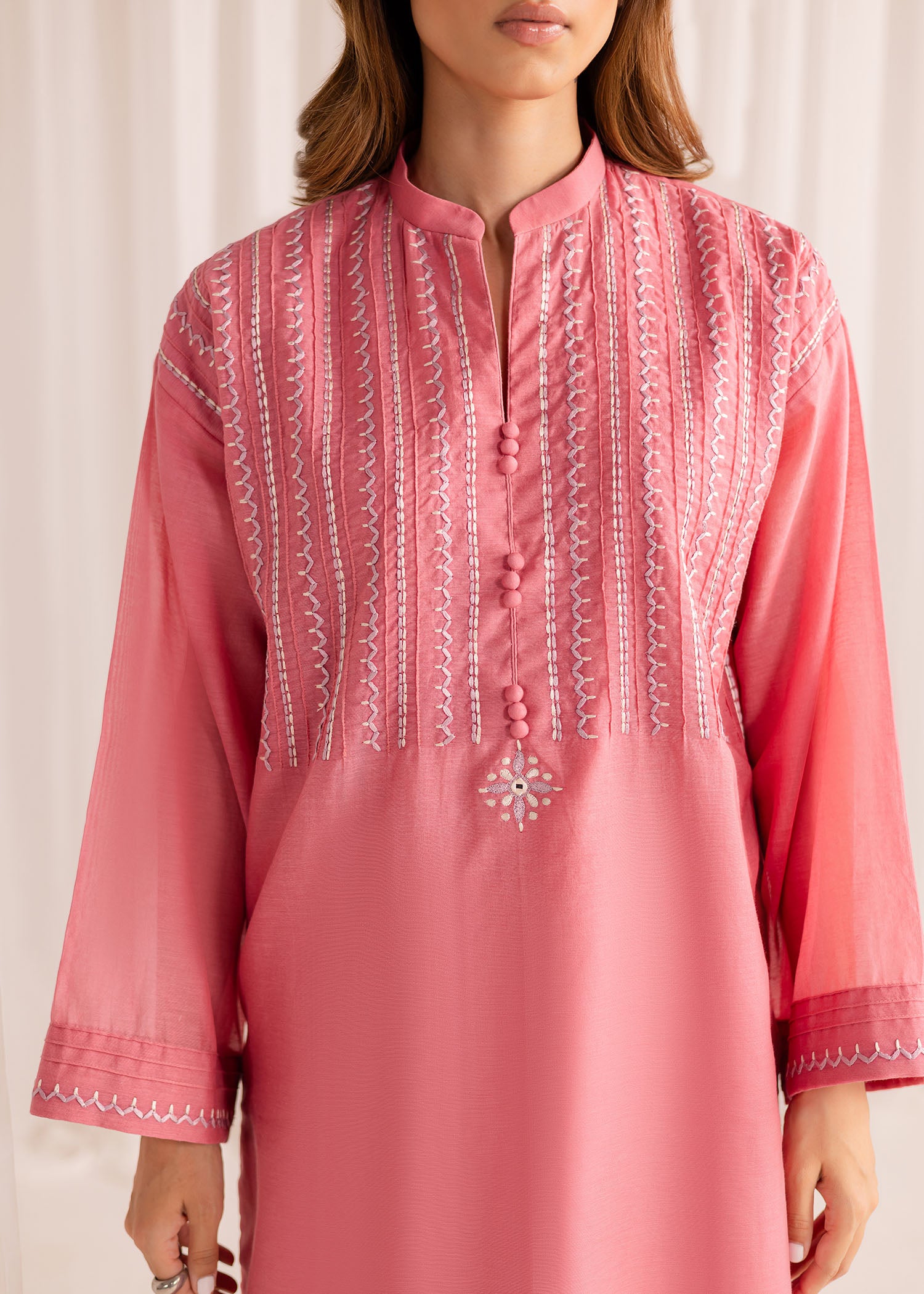Elevate your wardrobe with the watermelon pink Rania Kurta, a paragon of modern sophistication. Crafted from crisp kora cotton and adorned with exquisite multi-hued resham embroidery, this piece is a versatile staple. Pair it with our Izaar for a refined, polished look.