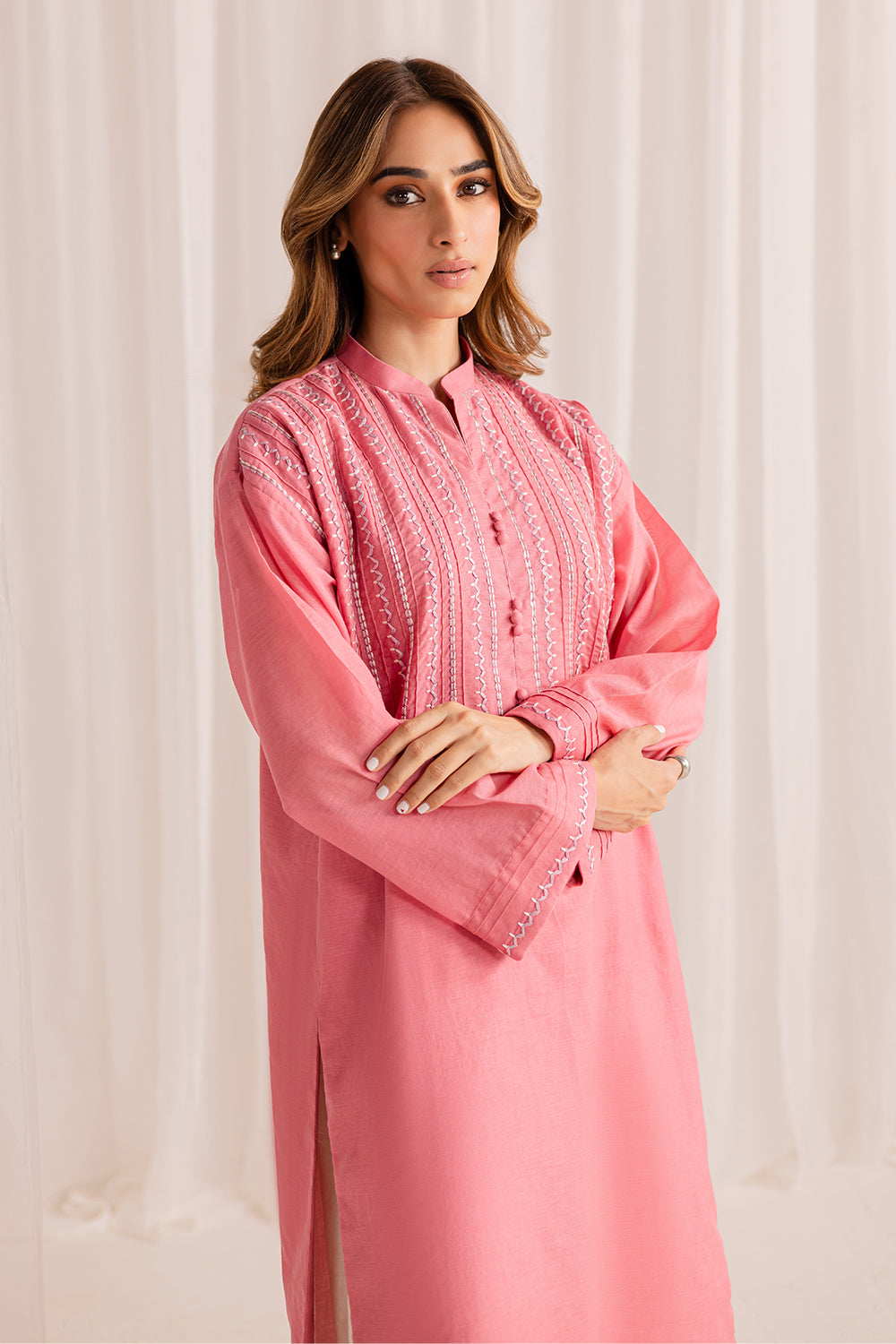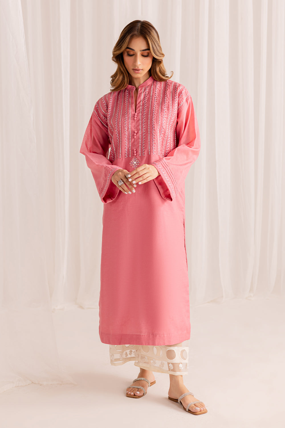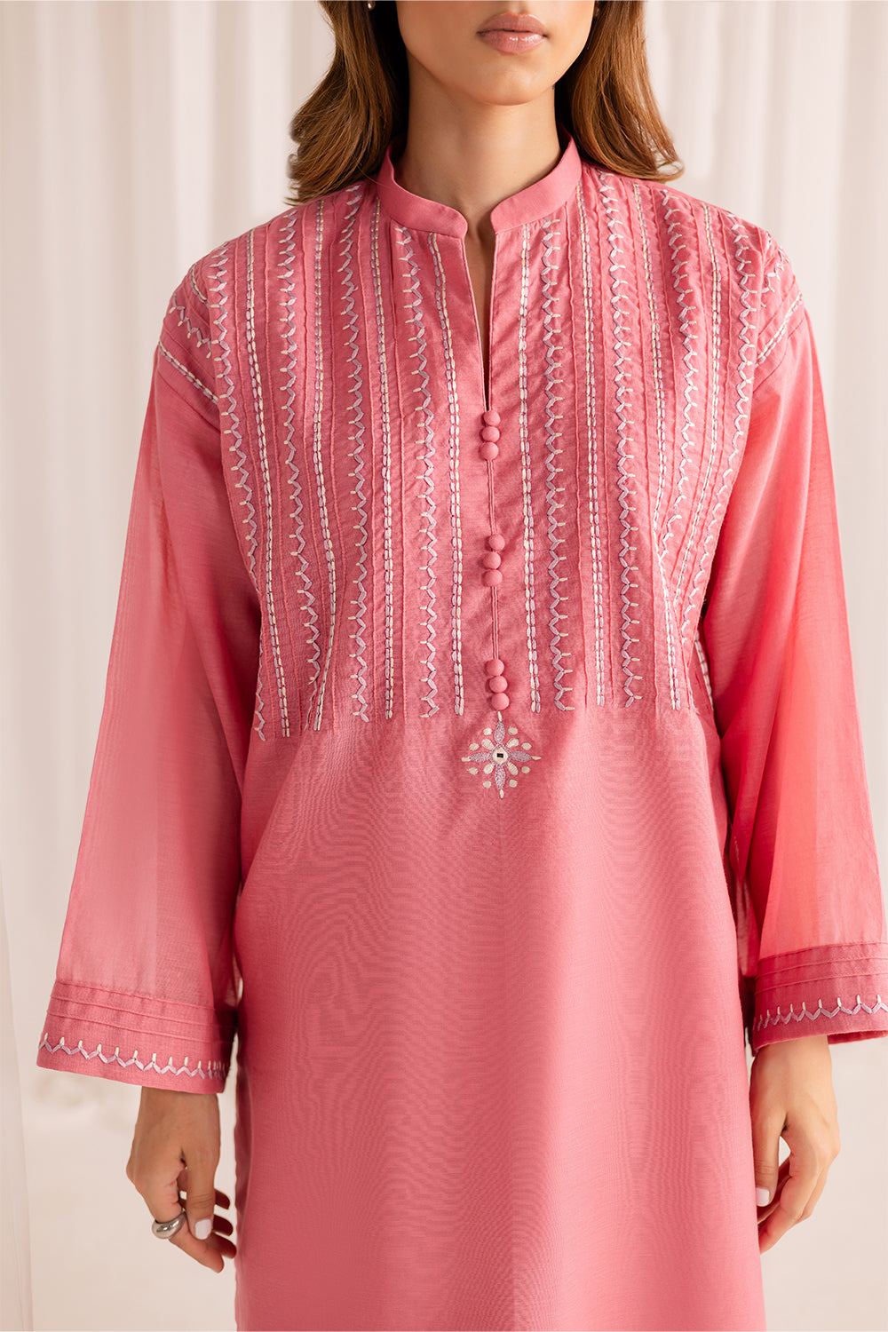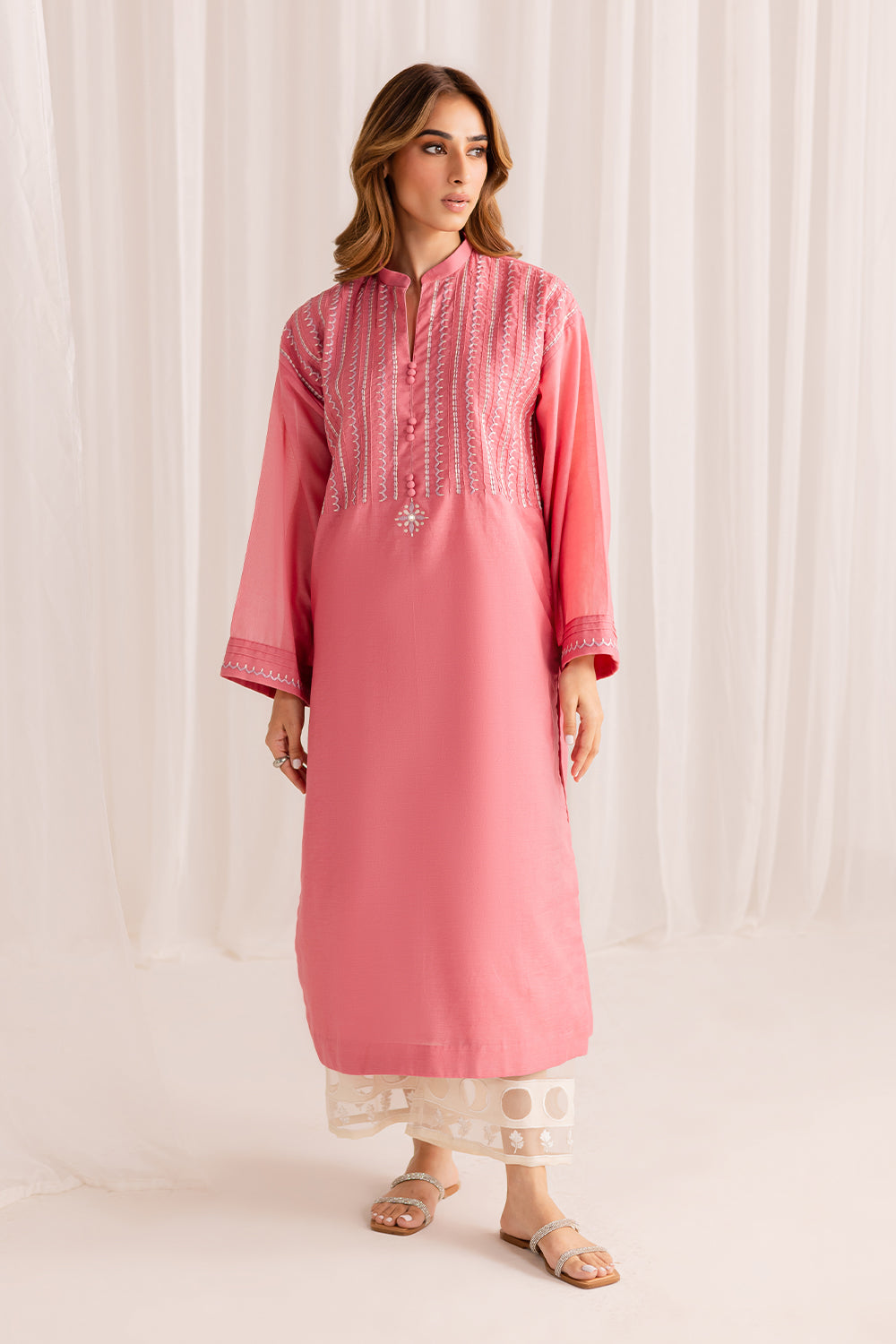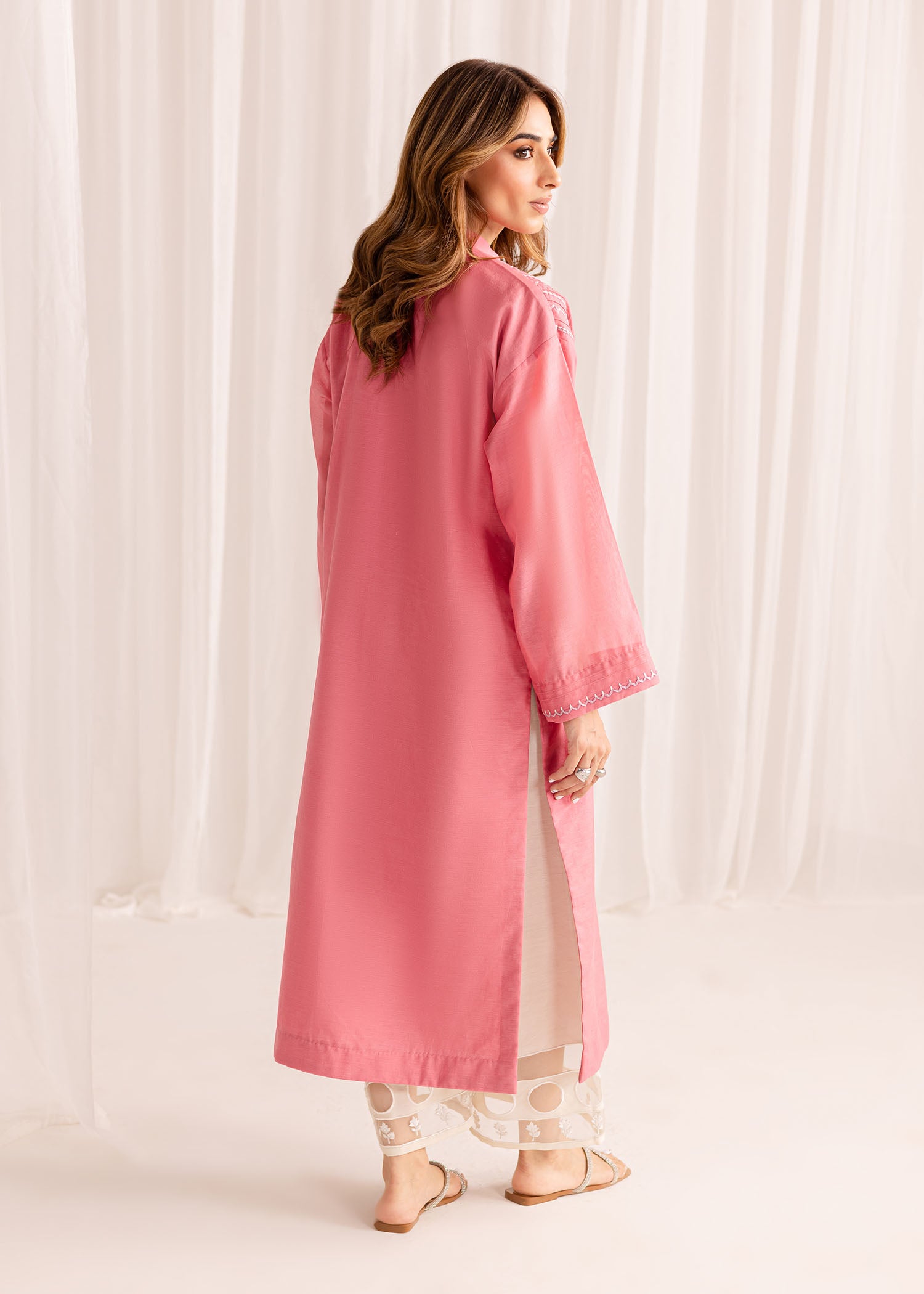 Elevate your wardrobe with the watermelon pink Rania Kurta, a paragon of modern sophistication. Crafted from crisp kora cotton and adorned with exquisite multi-hued resham embroidery, this piece is a versatile staple. Pair it with our Izaar for a refined, polished look.