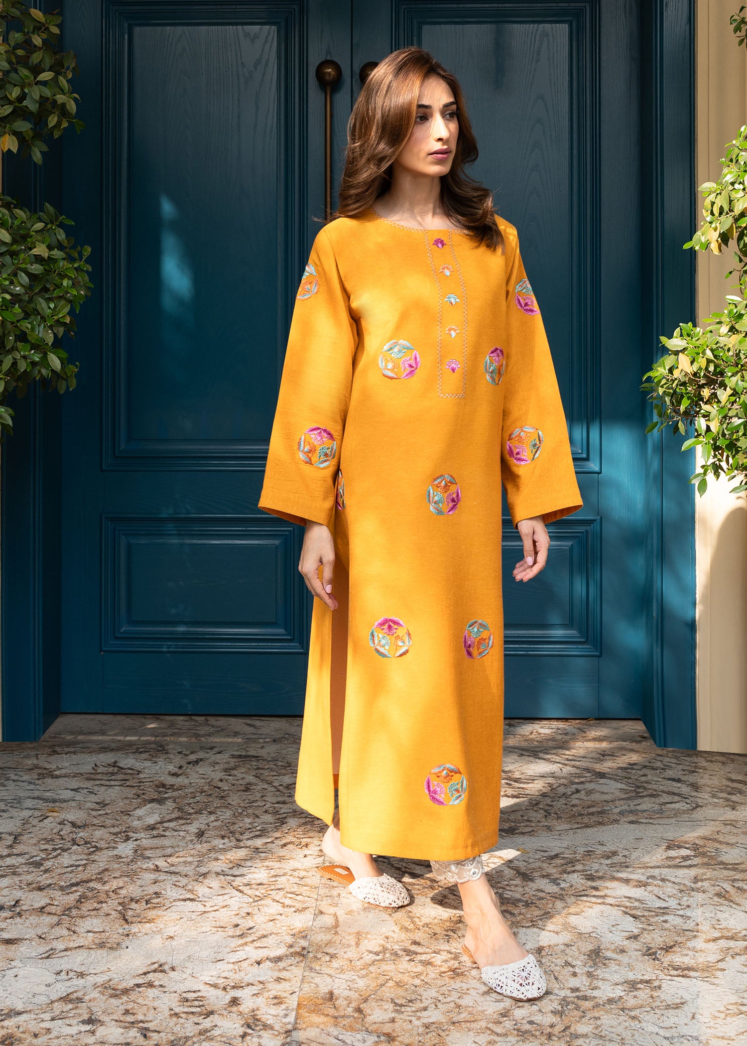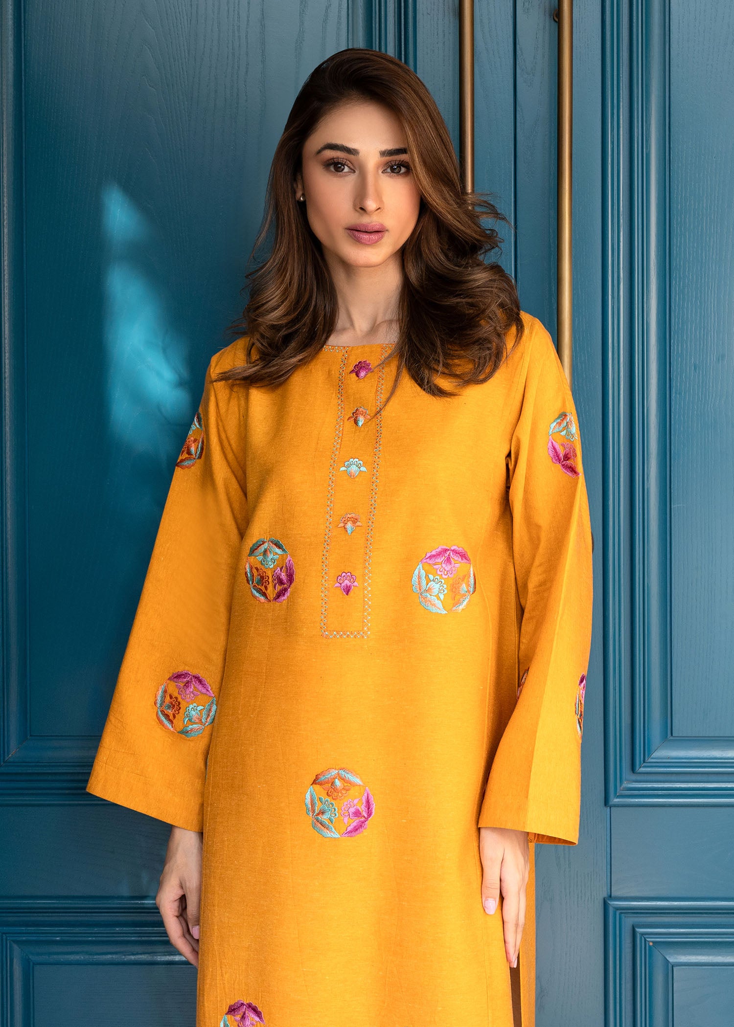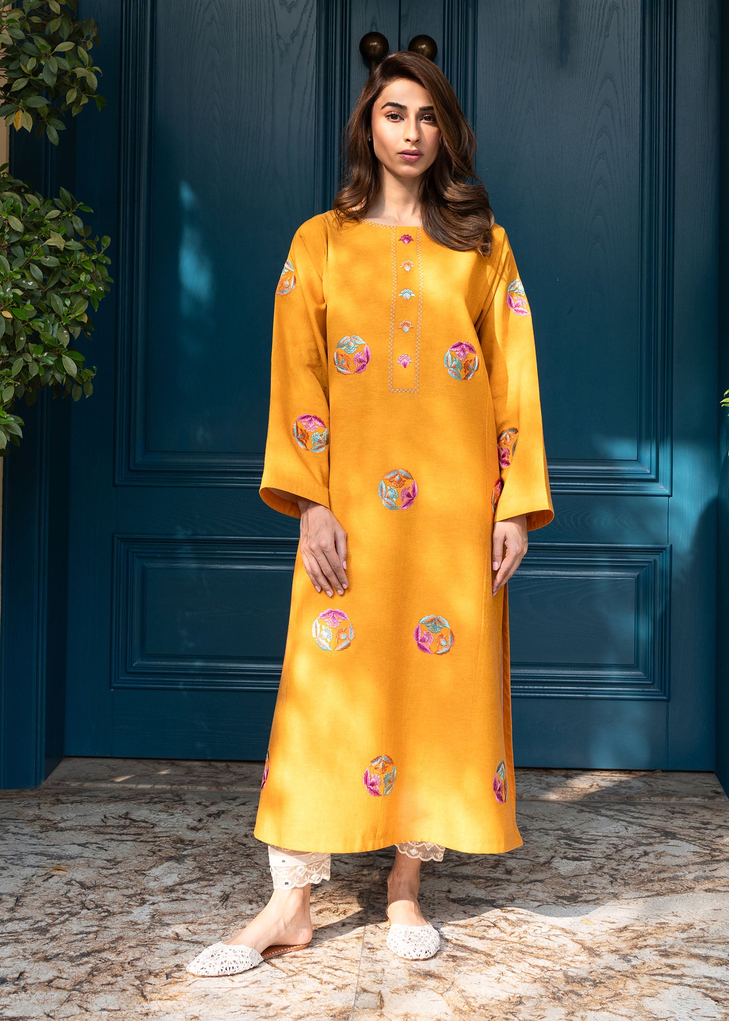 Pure Karandi meets artisanal charm in our Rooz kurta. Geometric patterns dance in colorful tones, perfect for adding warmth and style to your winter wardrobe. Pair it with our skinny shalwar as seen here.