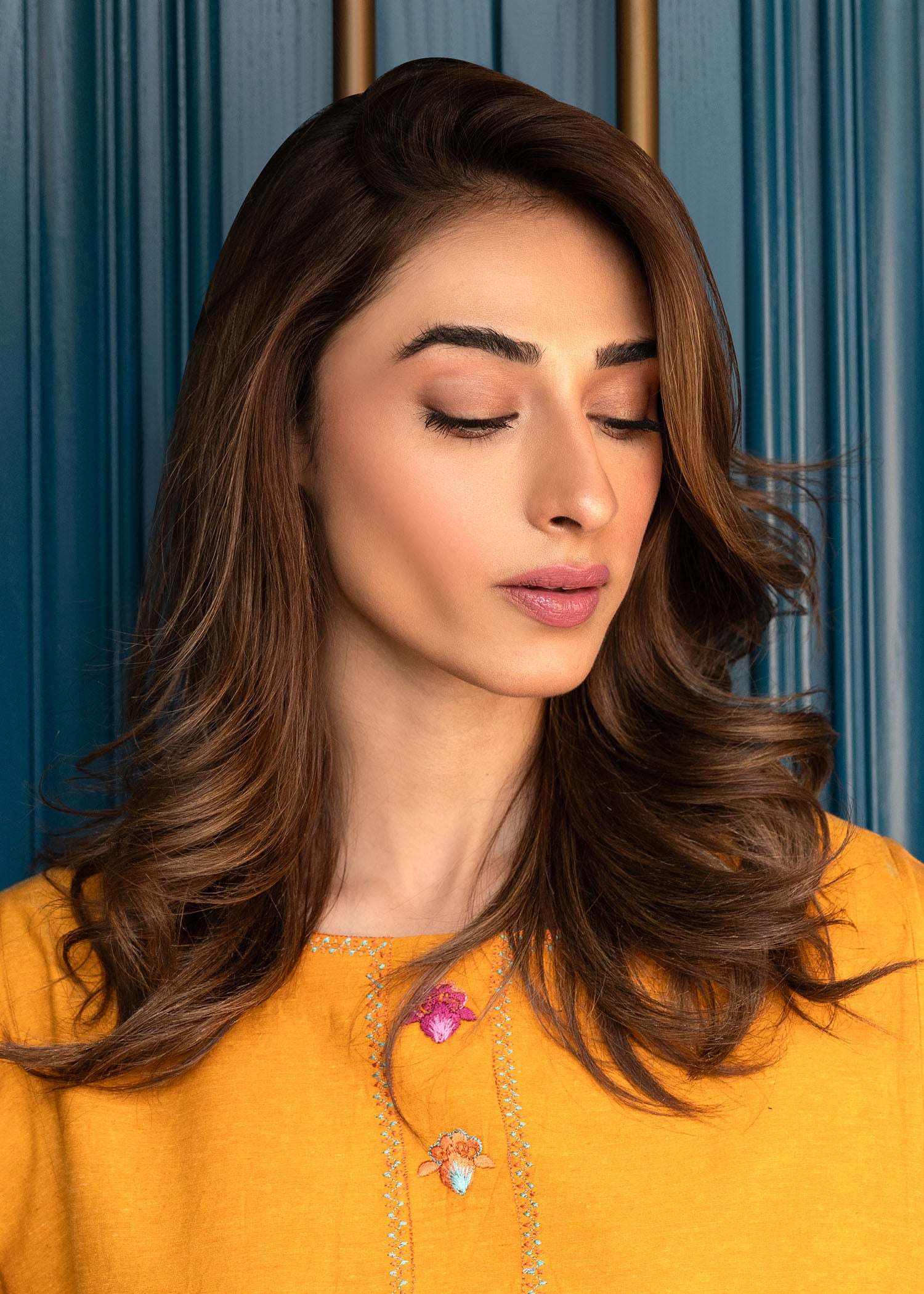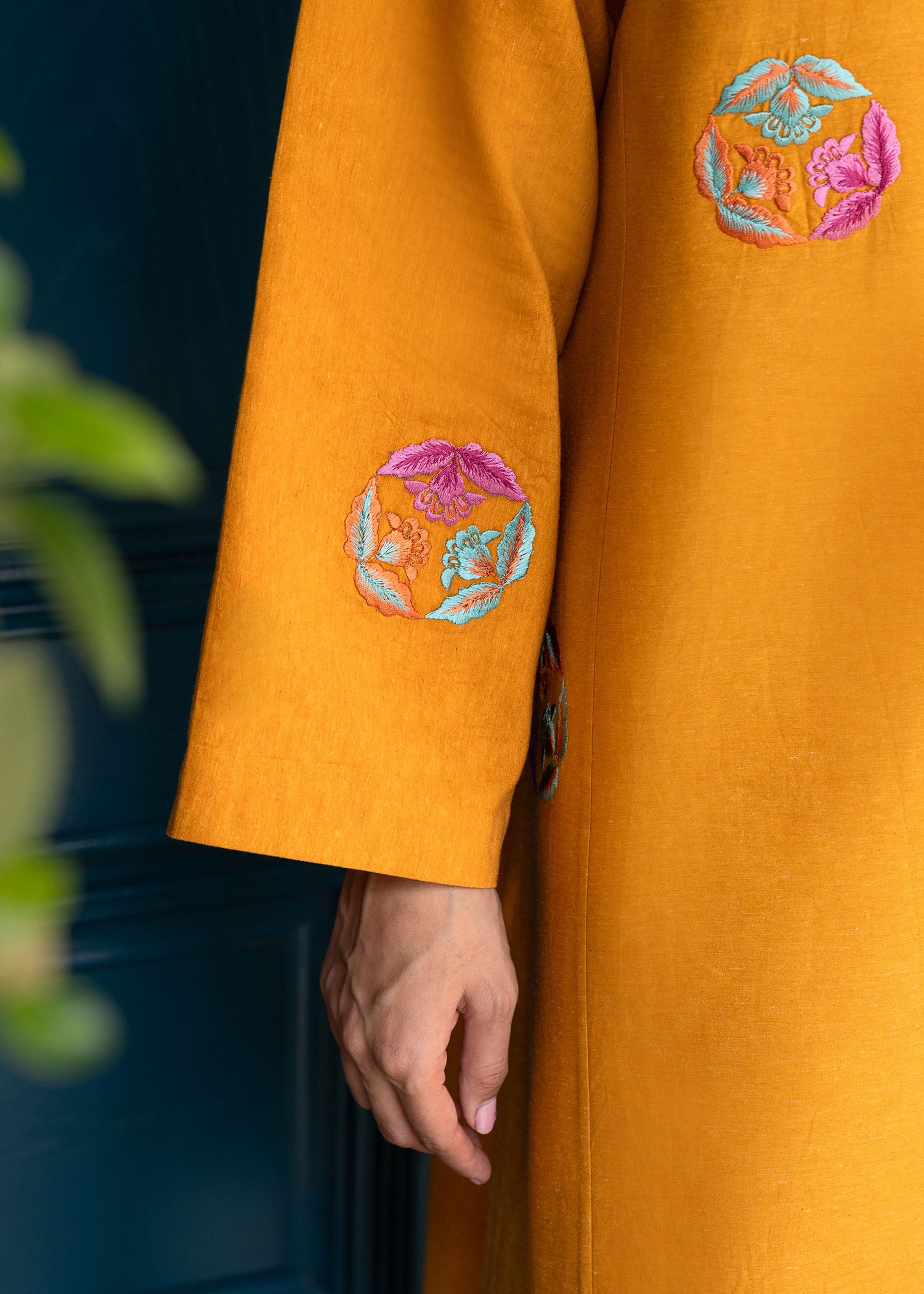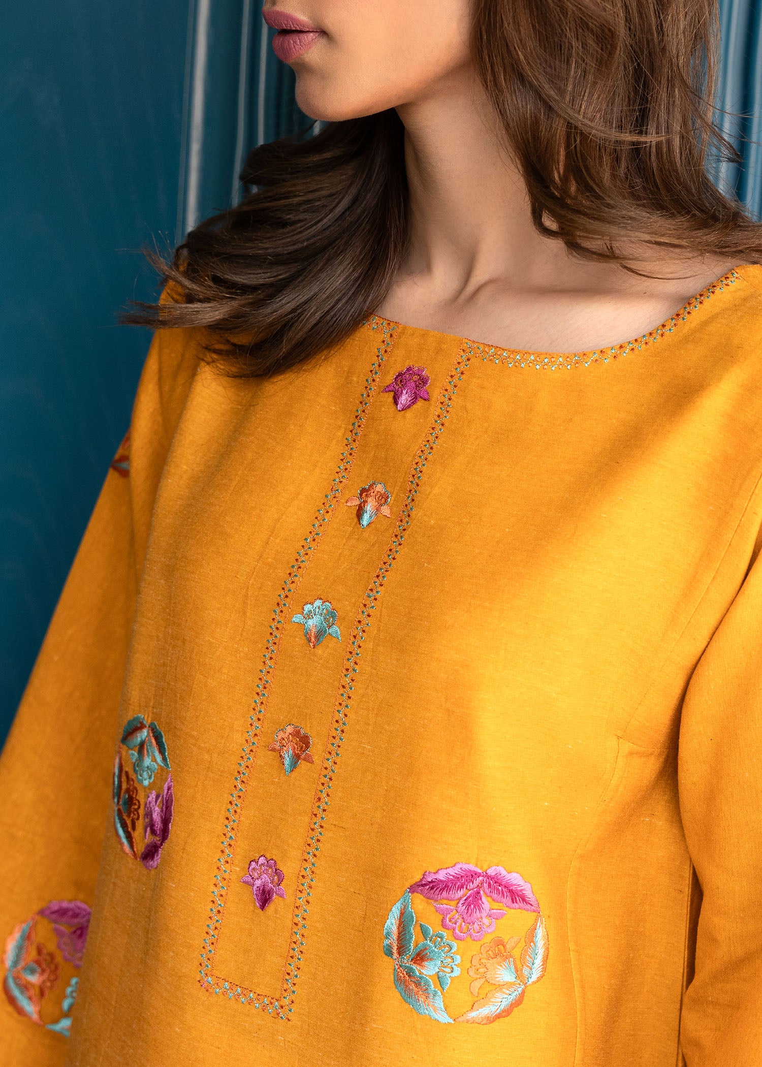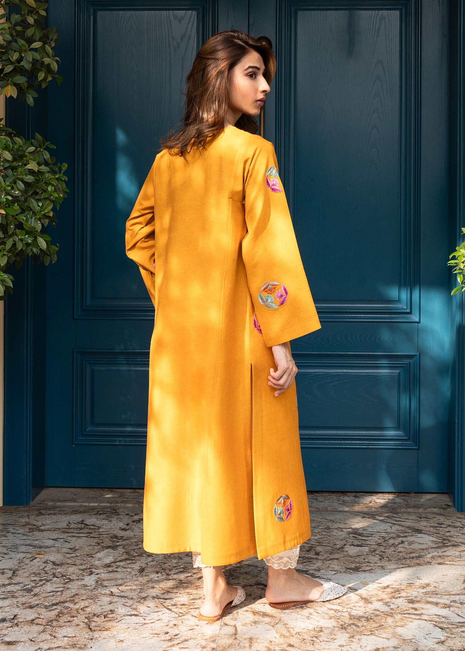 Pure Karandi meets artisanal charm in our Rooz kurta. Geometric patterns dance in colorful tones, perfect for adding warmth and style to your winter wardrobe. Pair it with our skinny shalwar as seen here.