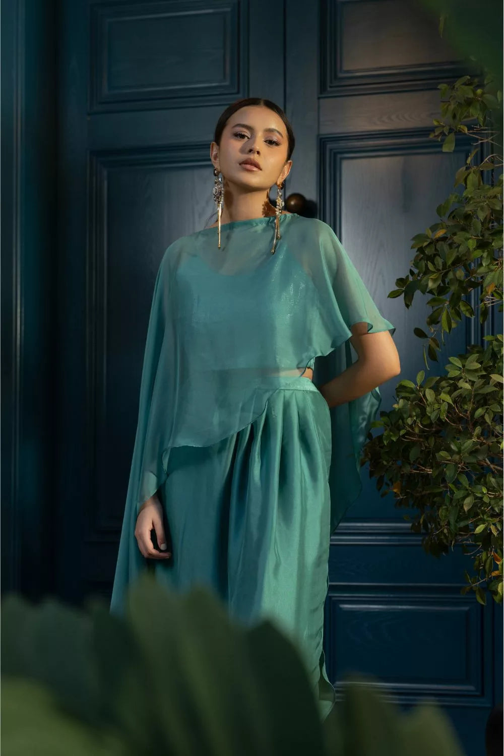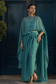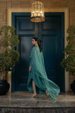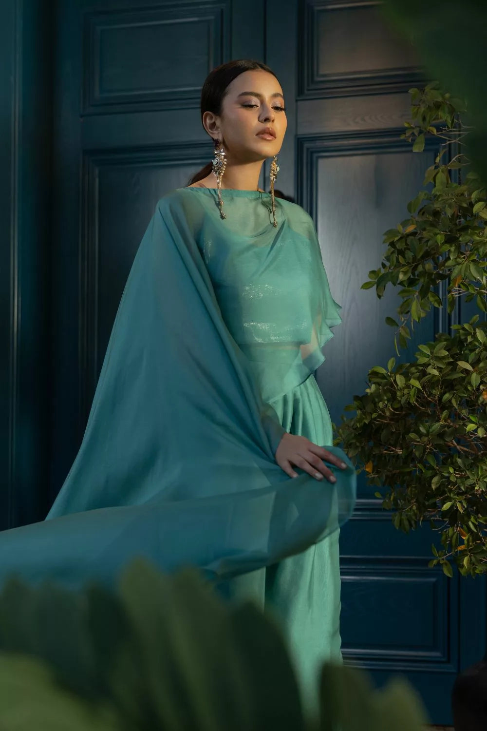 The Roya set exudes effortless elegance, crafted from pure French chiffon. This 3- piece outfit includes a flowing cape, a sleek shimmery blouse and a pleated skirt, all in a stunning aqua hue. The lightweight fabric drapes beautifully, offering a graceful and airy silhouette perfect for festive and formal occasions.