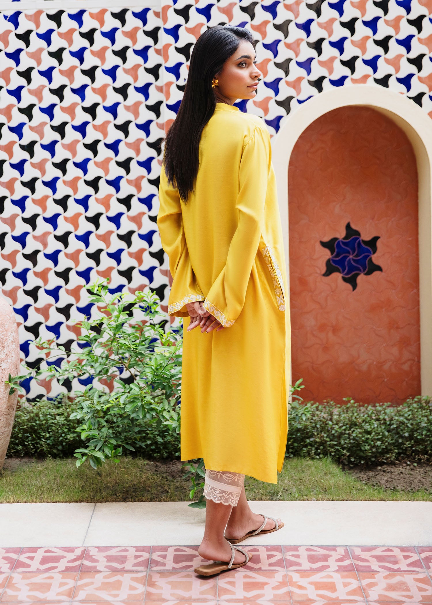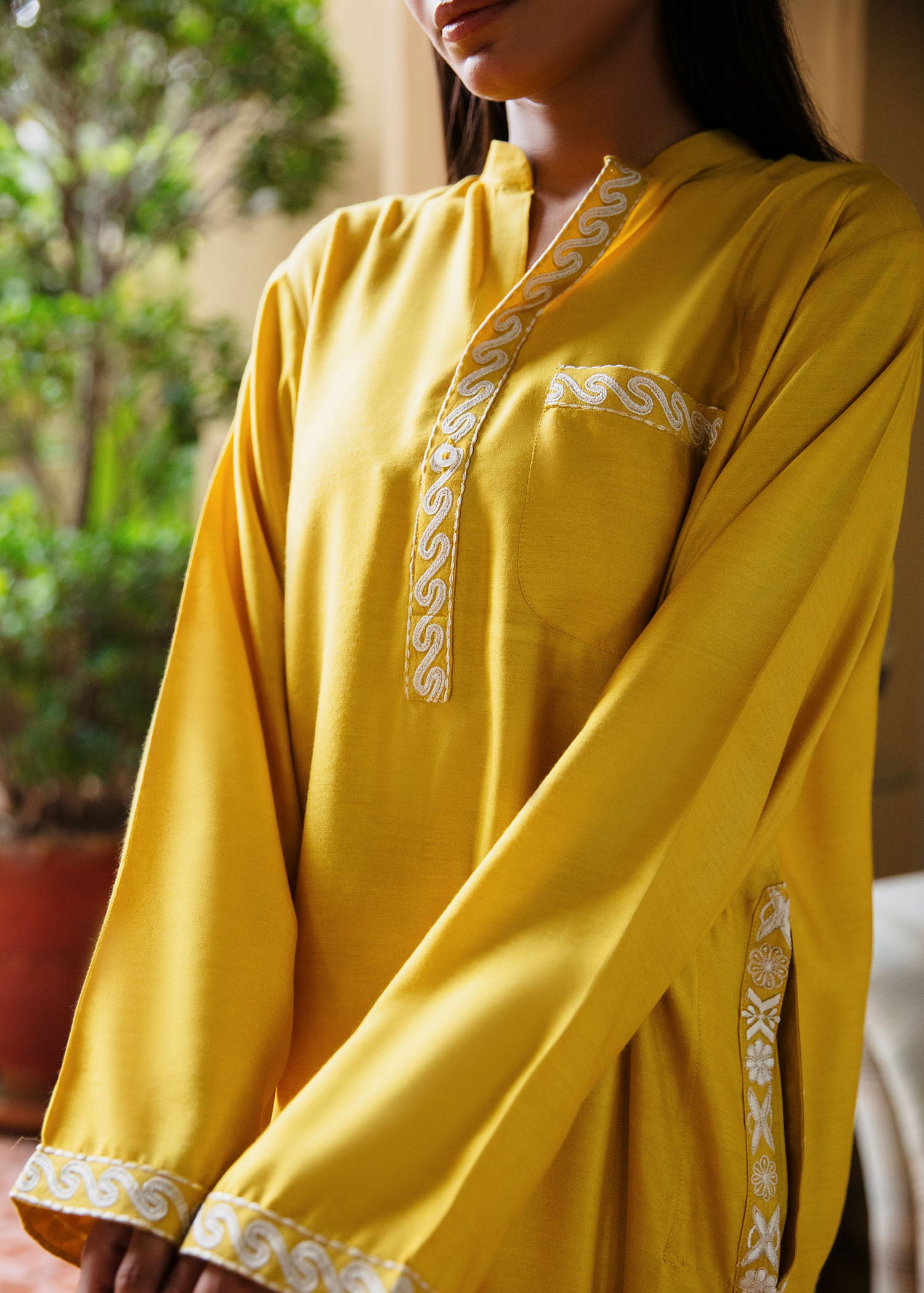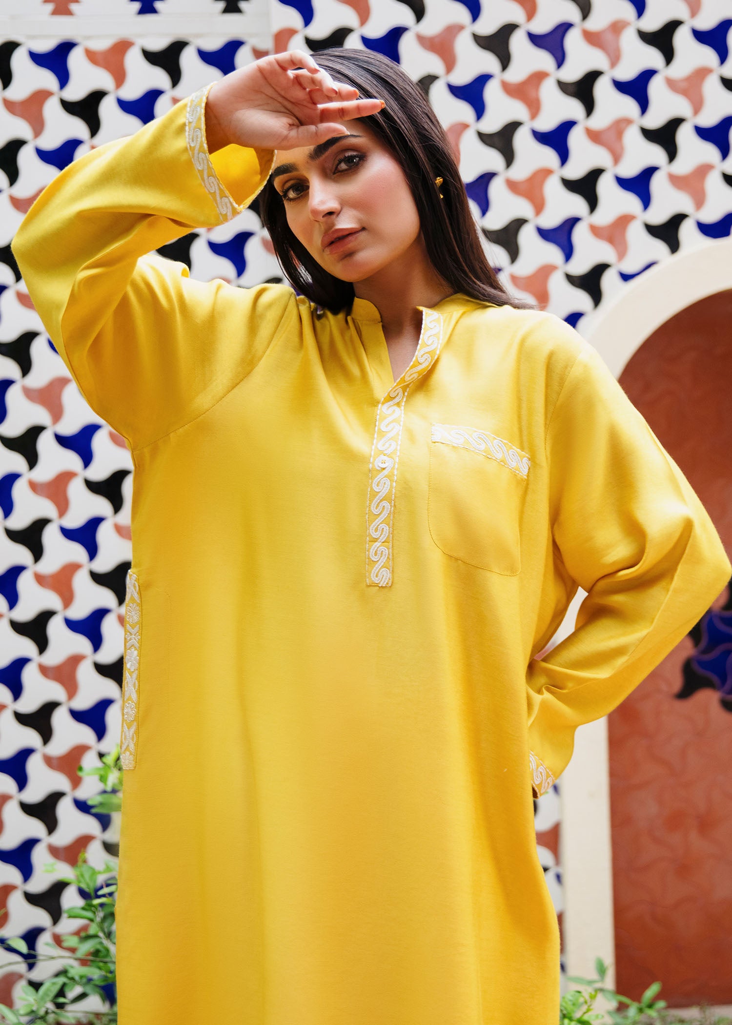 The vibrant yellow kurta exudes a radiant warmth perfect for both casual and festive wear. The delicate embroidery along the neckline and cuffs adds a subtle yet elegant touch to the design. Pair it with our skinny shalwar for a sophisticated, timeless look.