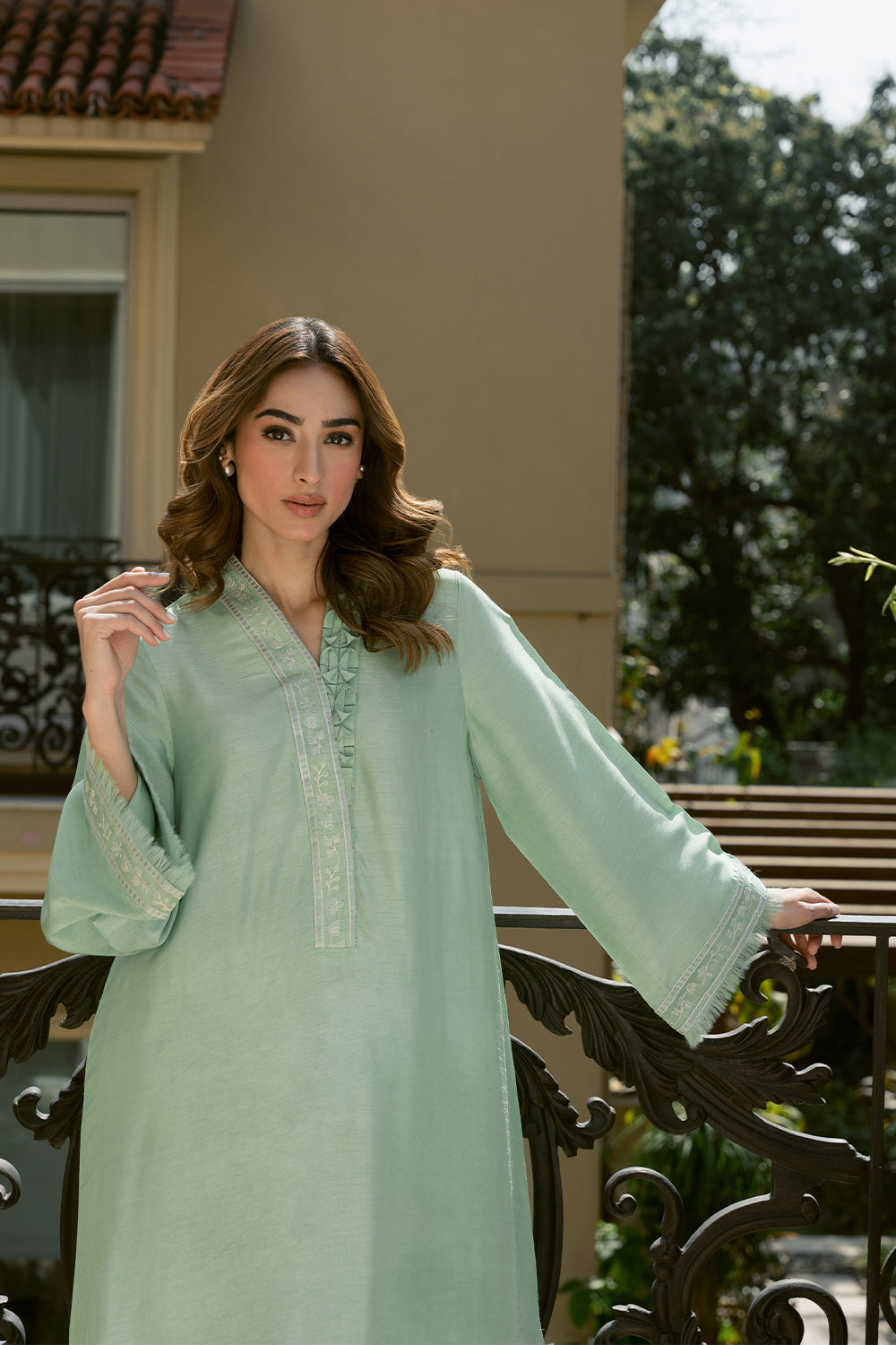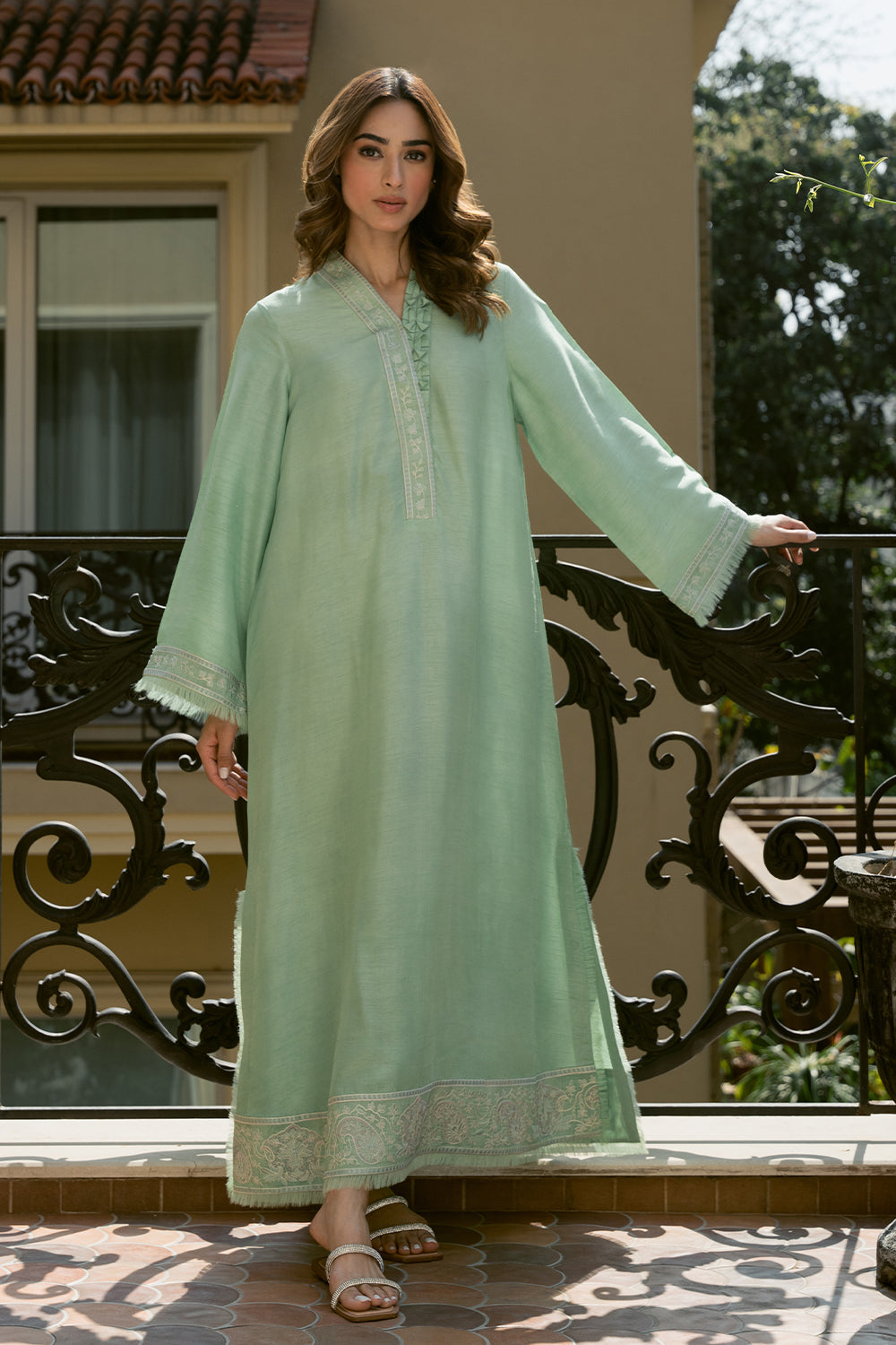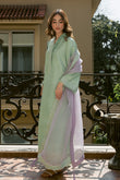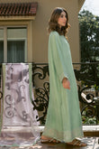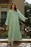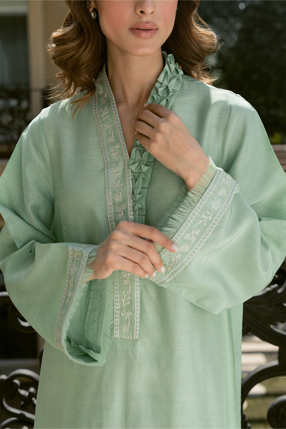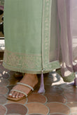 Crafted from vibrant tea green rawsilk, this stunning kaftan boasts a show-stopping statement neckline, adding a touch of whimsy. Paired with a beautiful lilac dupatta featuring delicate embroidery on the borders, creating a rich, textured look. The flowing hem adds a graceful silhouette, making this kaftan perfect for festive celebrations.