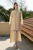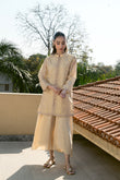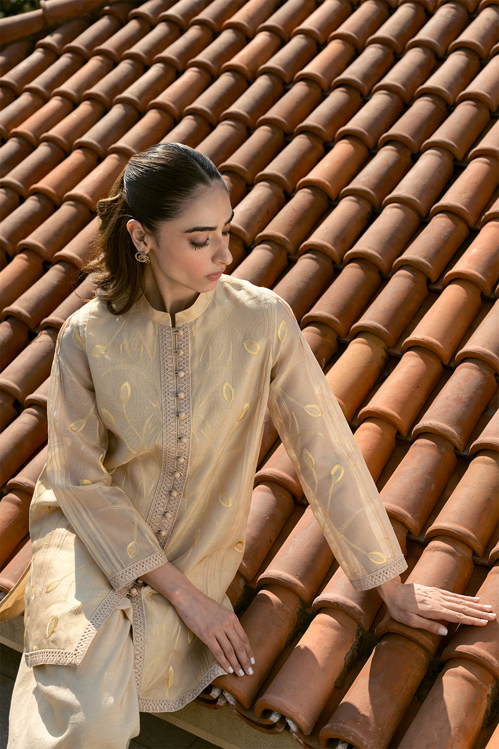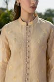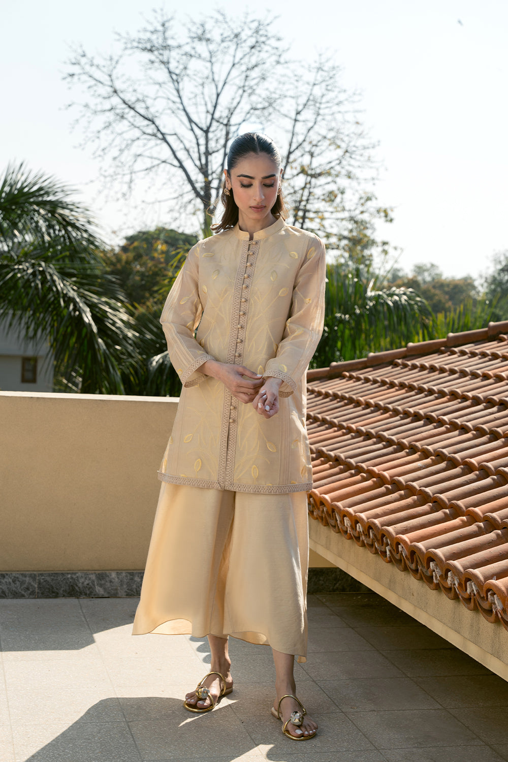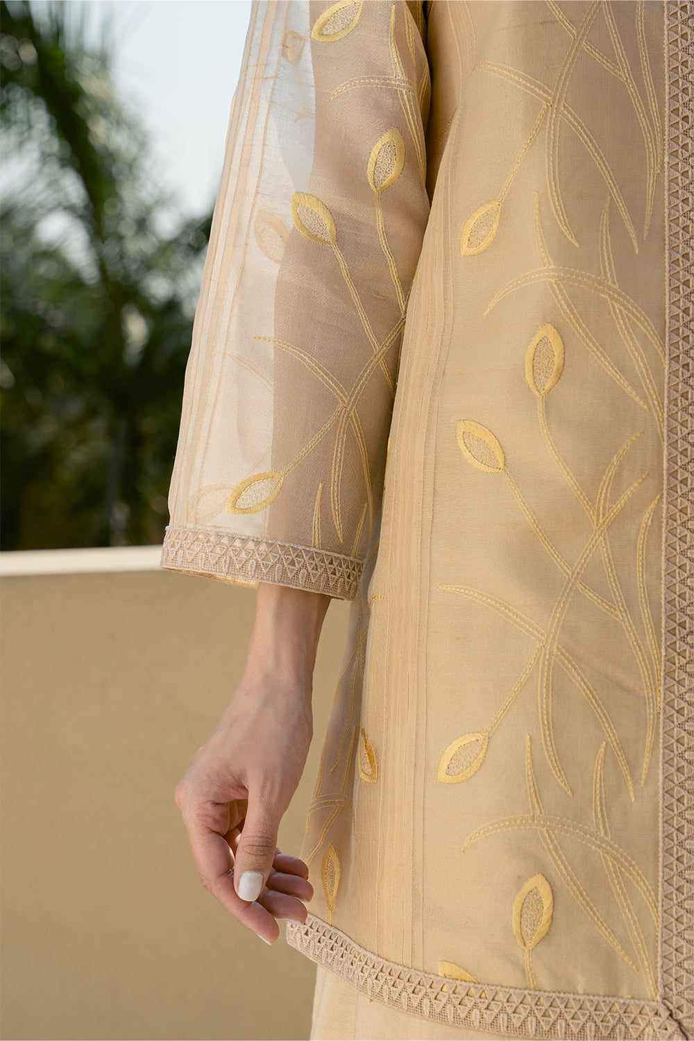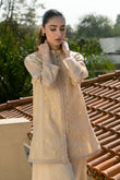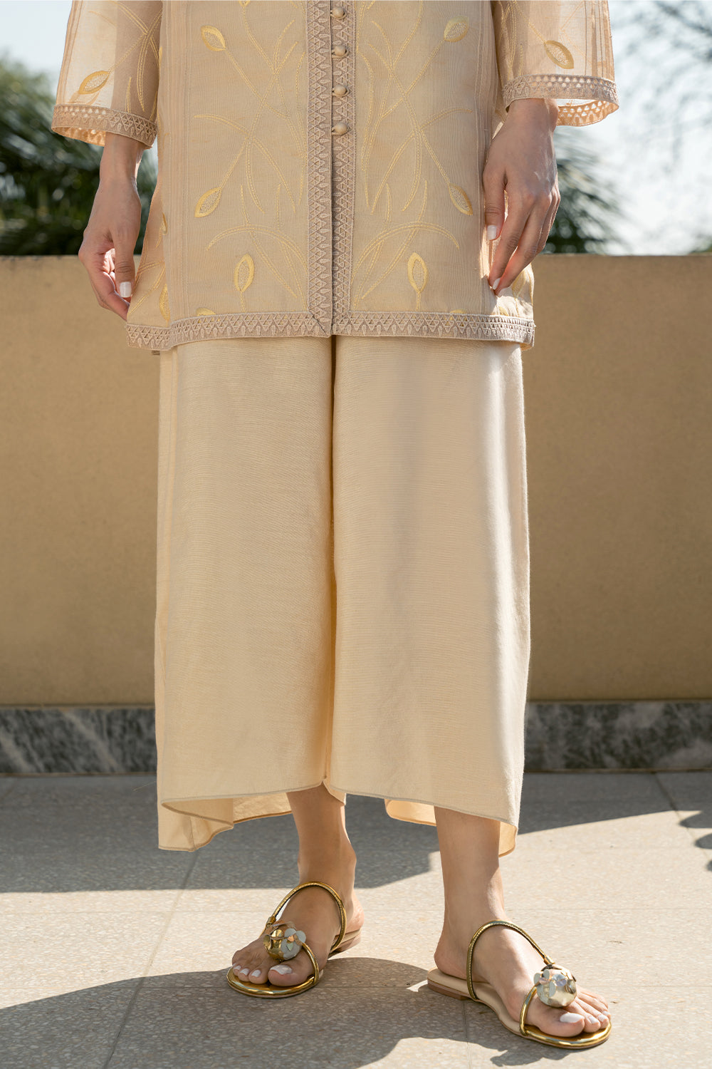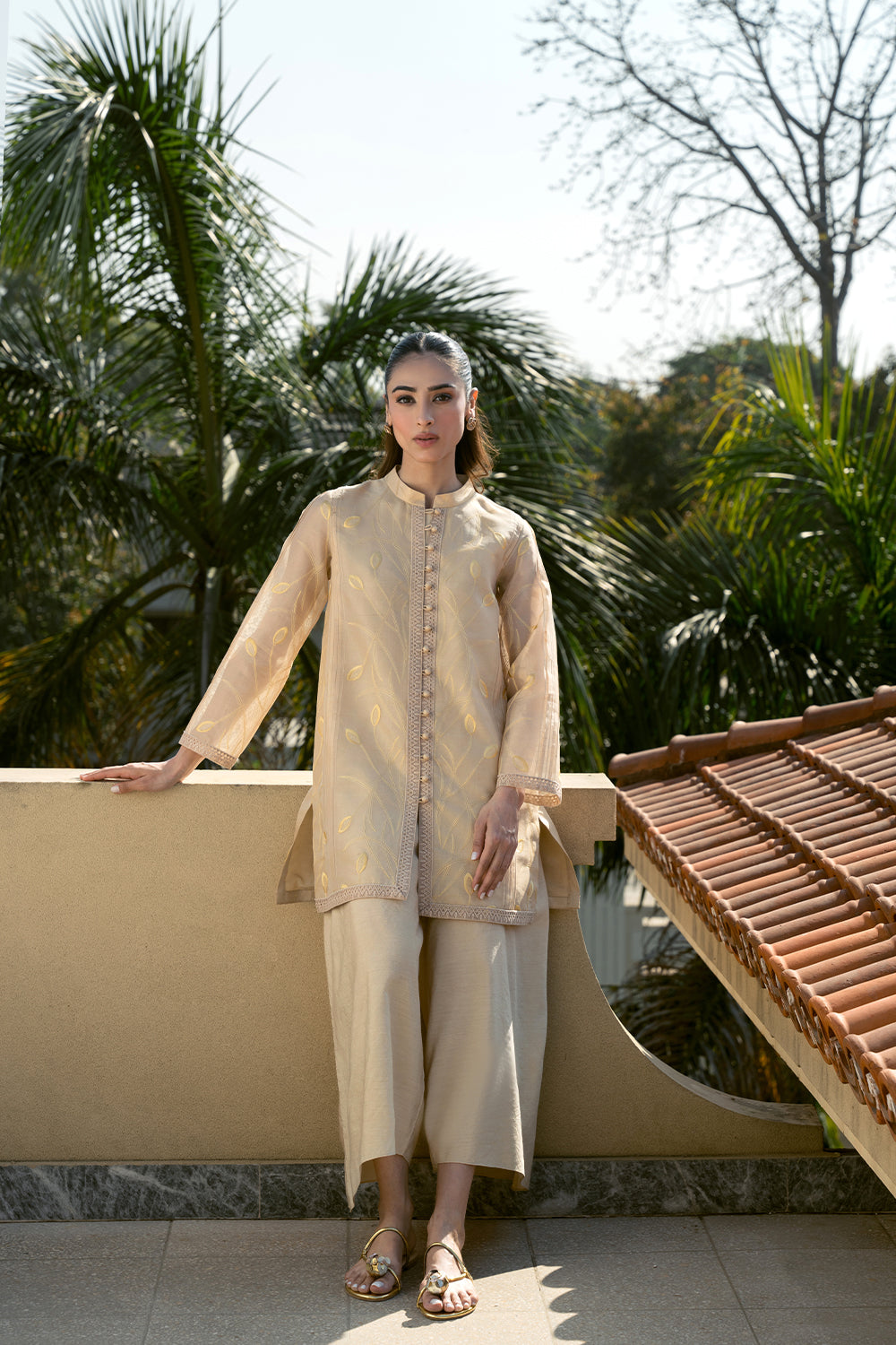 Make a stylish statement at your next festive occasion with our stunning Shahin jacket. Crafted from pure organza raw silk in a soft beige hue, this beautifully embroidered piece features intricate lace detailing and is perfectly paired with our triangular pants. Get ready to turn heads with this effortlessly refined ensemble!