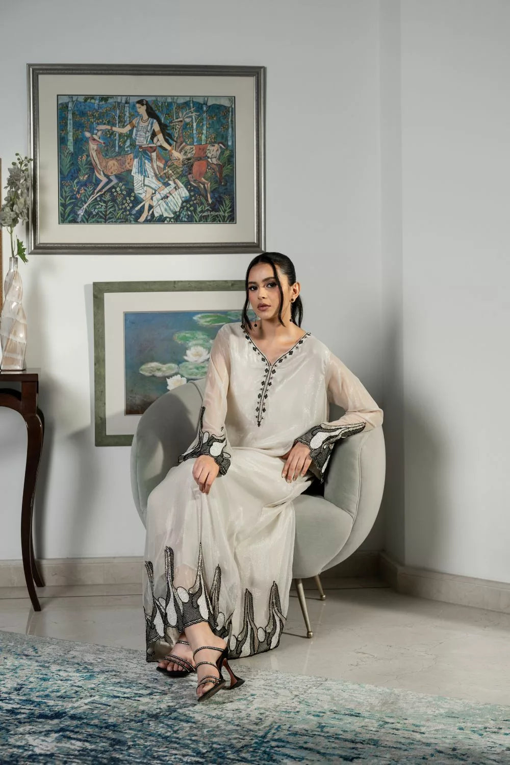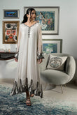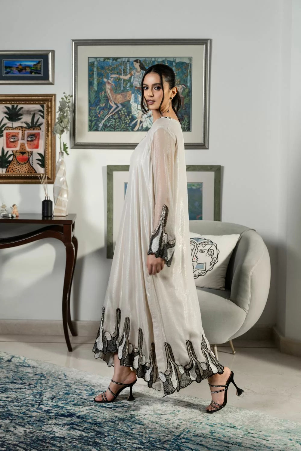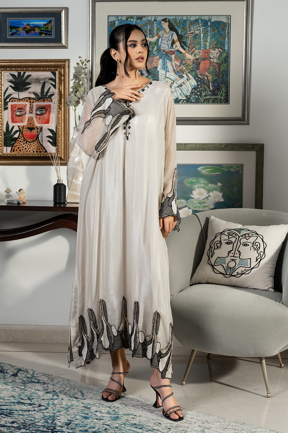 Simple yet stunning, this shimmery chiffon kaftan features timeless hand work in jewel tones.