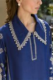 Add a touch of refinement to your everyday style with our stunning indigo blue Sorud set, expertly cut from premium spun net. The set showcases exquisite fine beige-hued embroidery on the sleeves, beautifully complemented by geometric-inspired appliqué and intricate neckline detailing. Paired with a matching khaddi silk skinny shalwar, this ensemble is perfect for effortless, year-round sophistication.