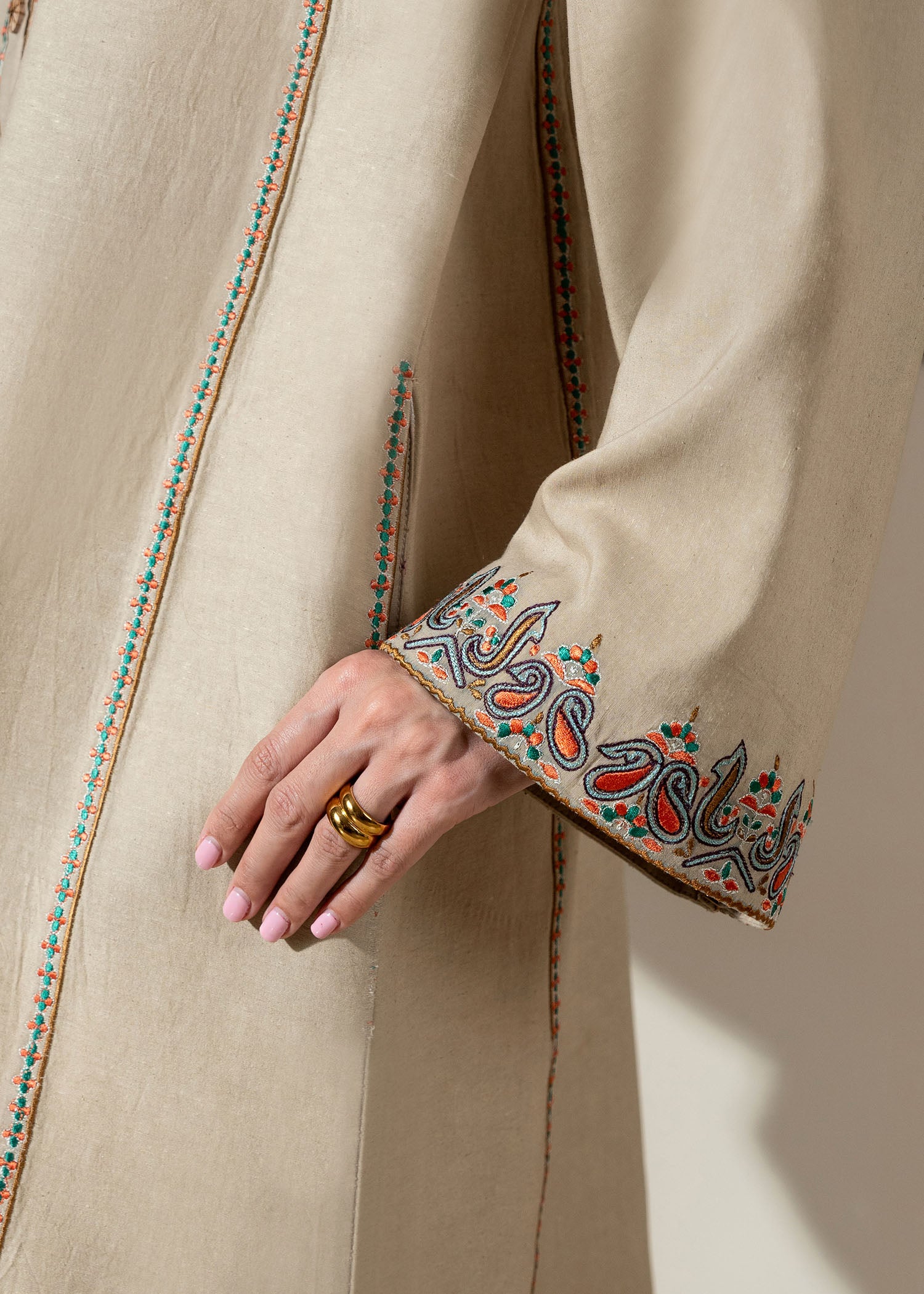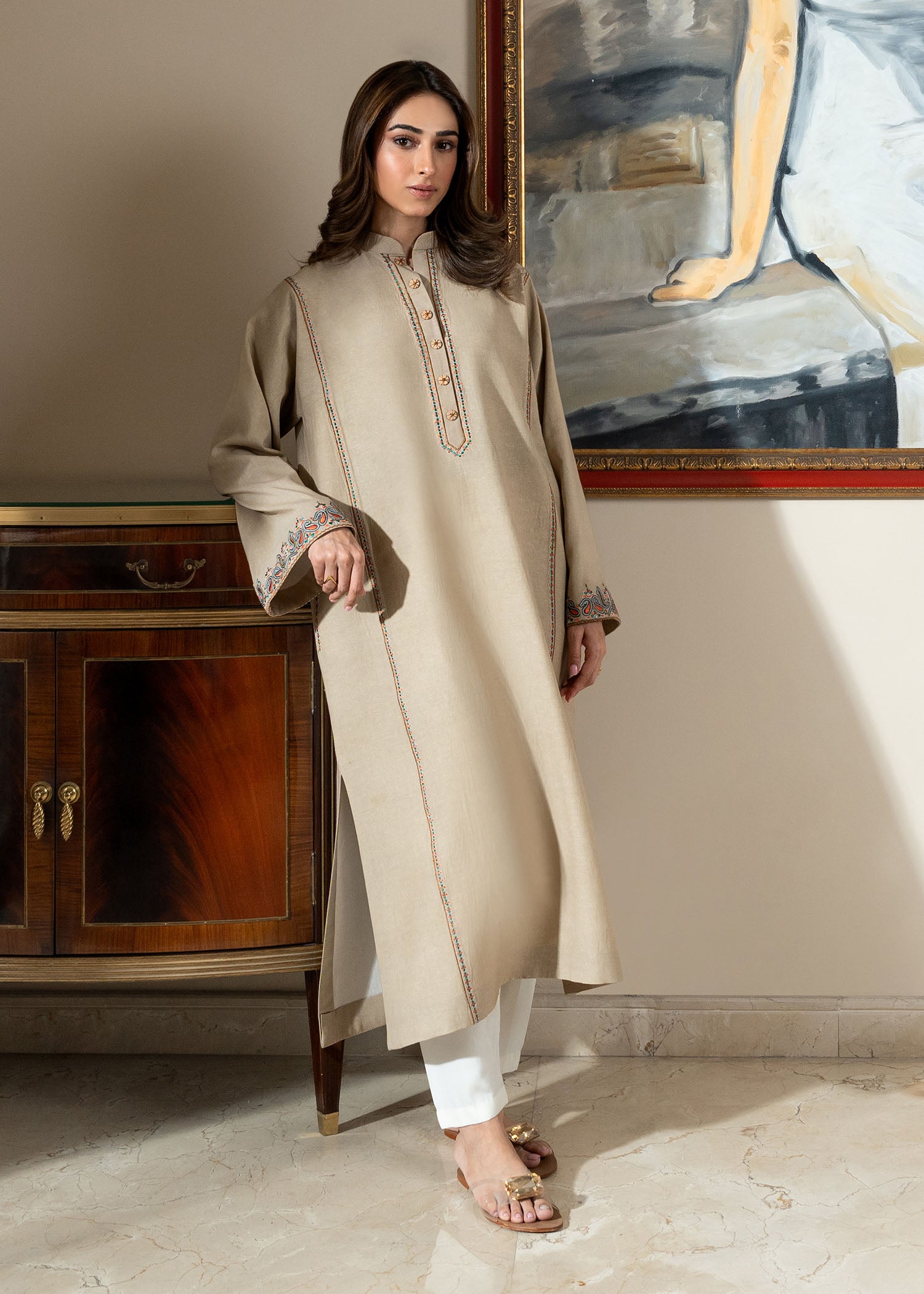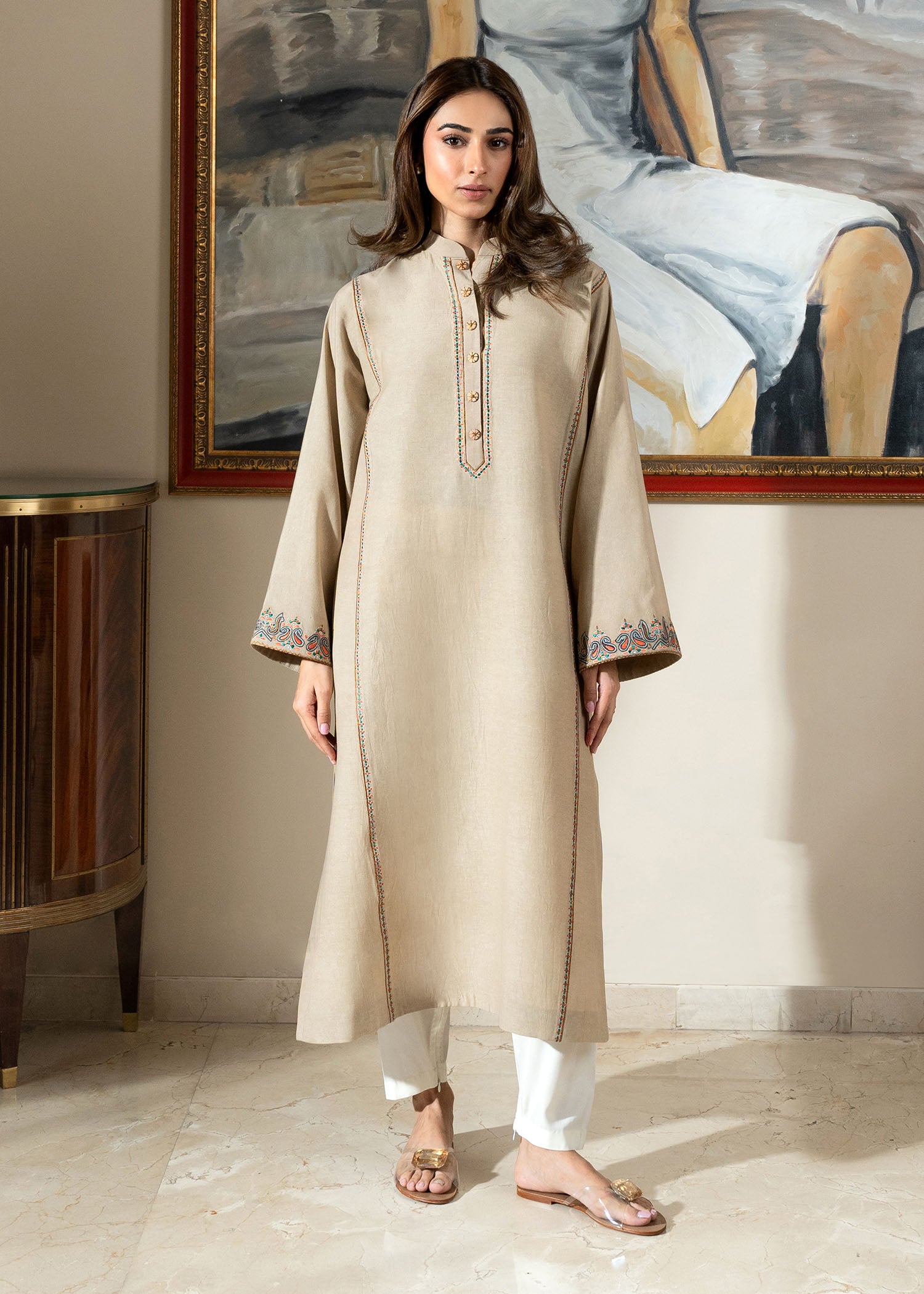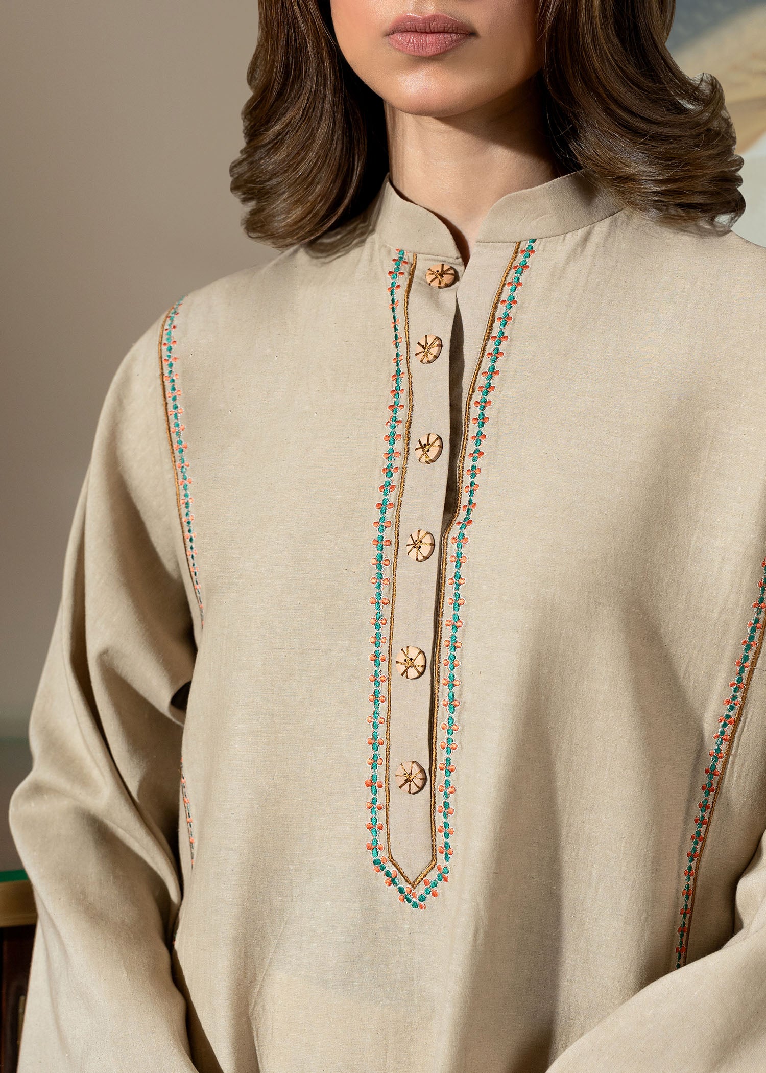 Pure Karandi fabric, timeless brown hue, and delicate embroidery come together in perfect harmony. Our Talia Kurta is the epitome of elegance, suitable for any occasion. Pair it with our ivory boski shalwar, as seen here.