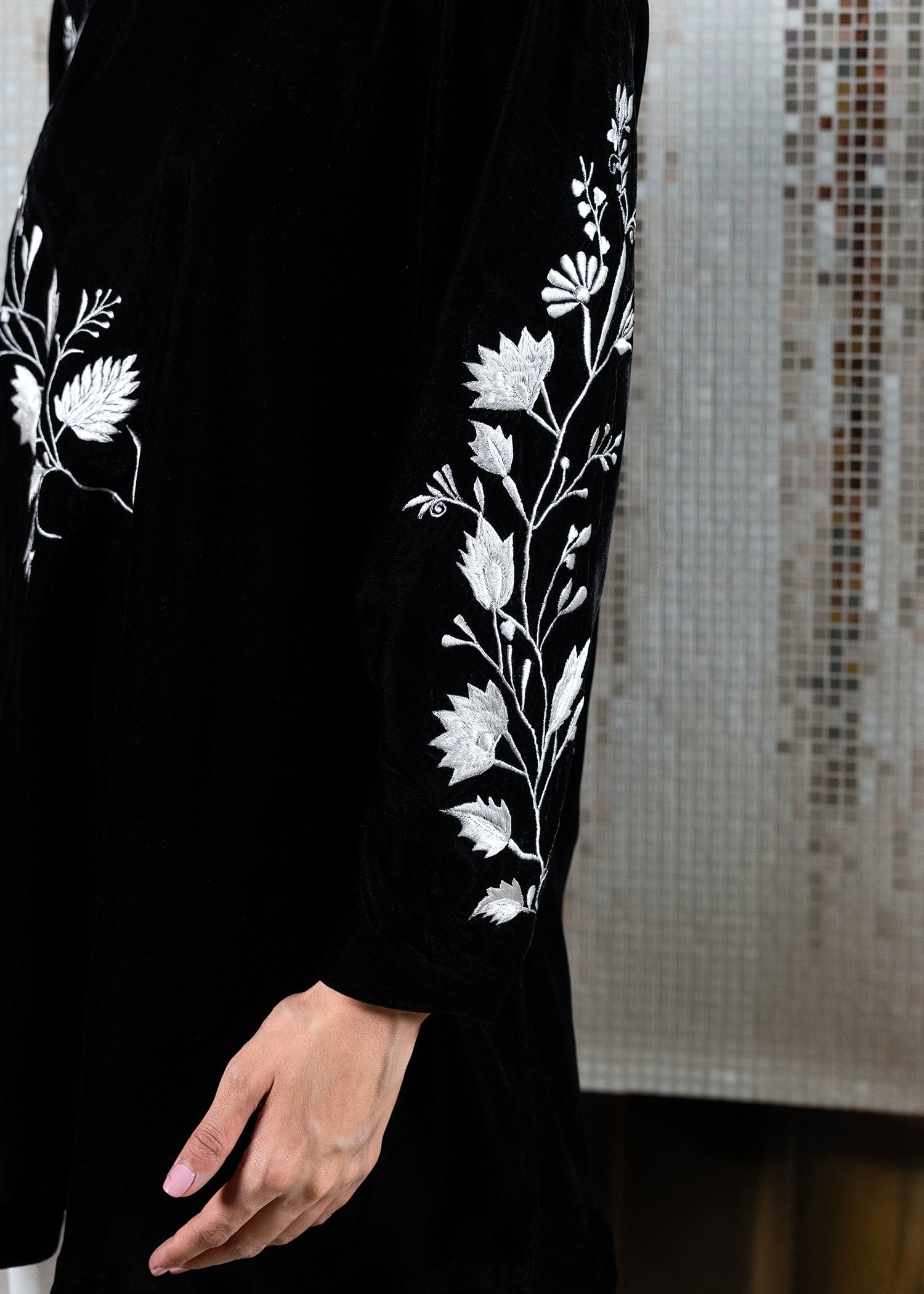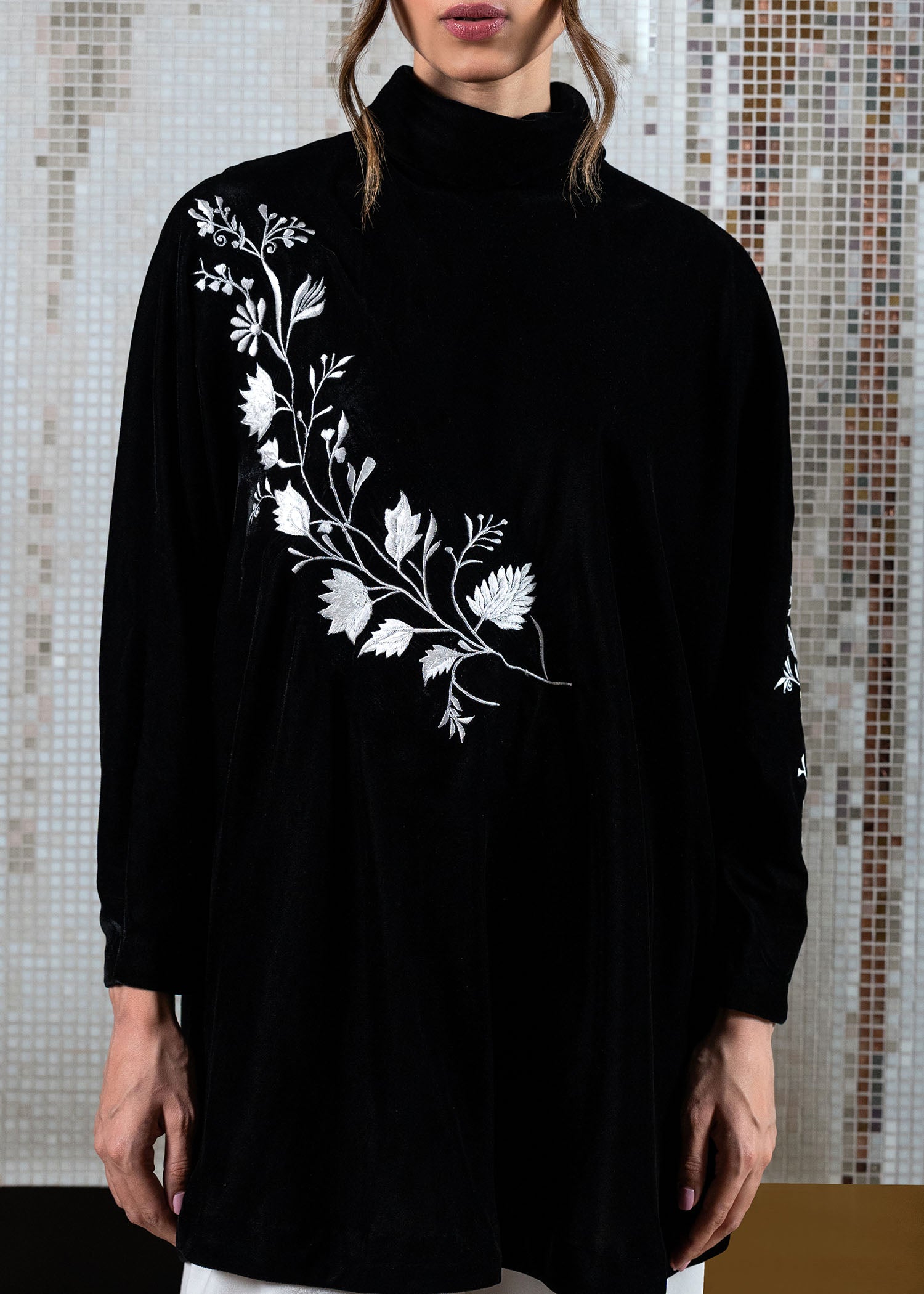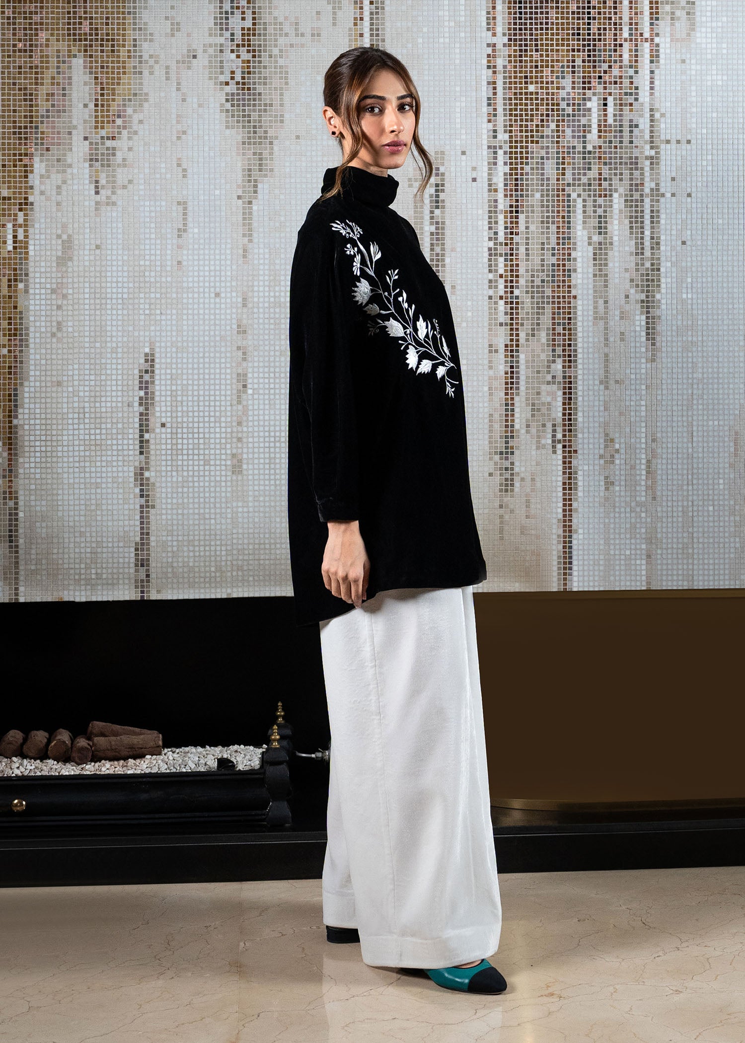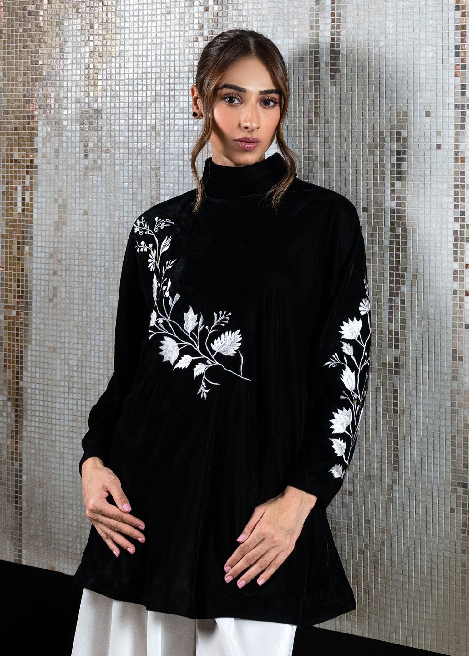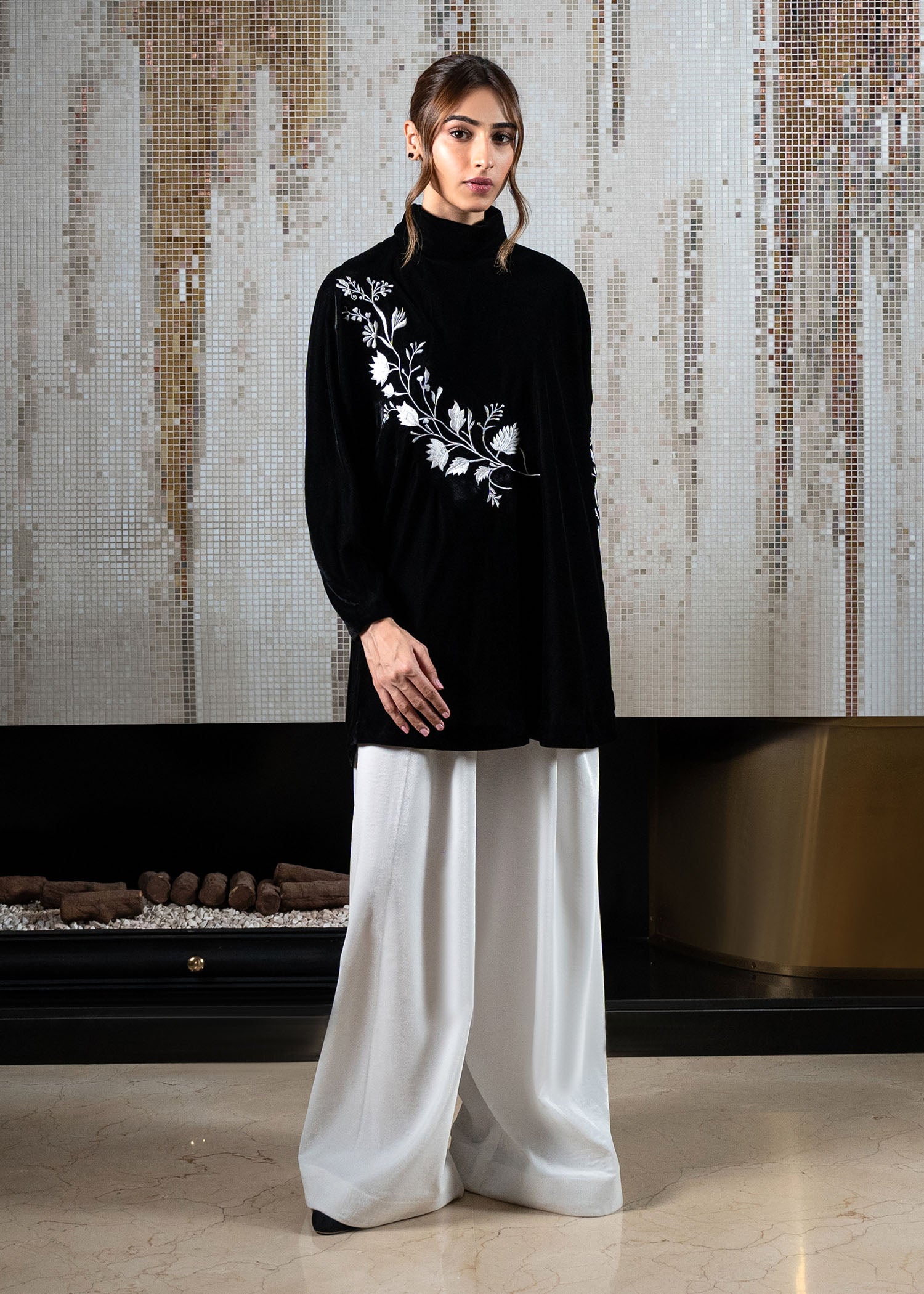 Elevate your style with our eternally trendy velvet top in black, adorned with contrasting ivory embroidery on relaxed sleeves and front. Paired with wide-legged pleated pants in white velvet, this silhouette exudes sophistication.