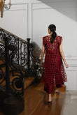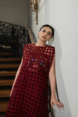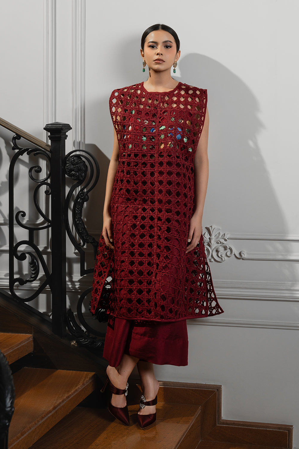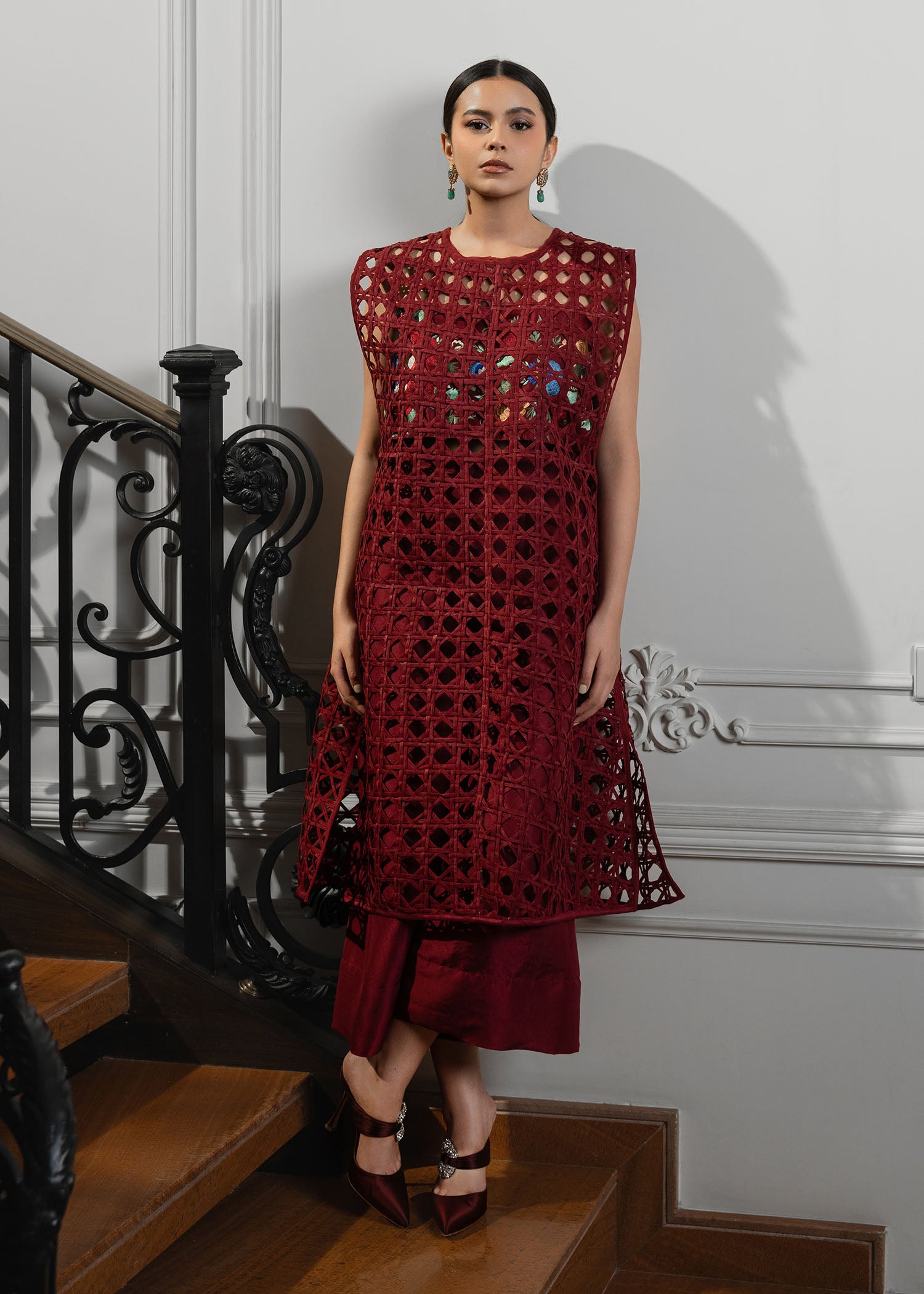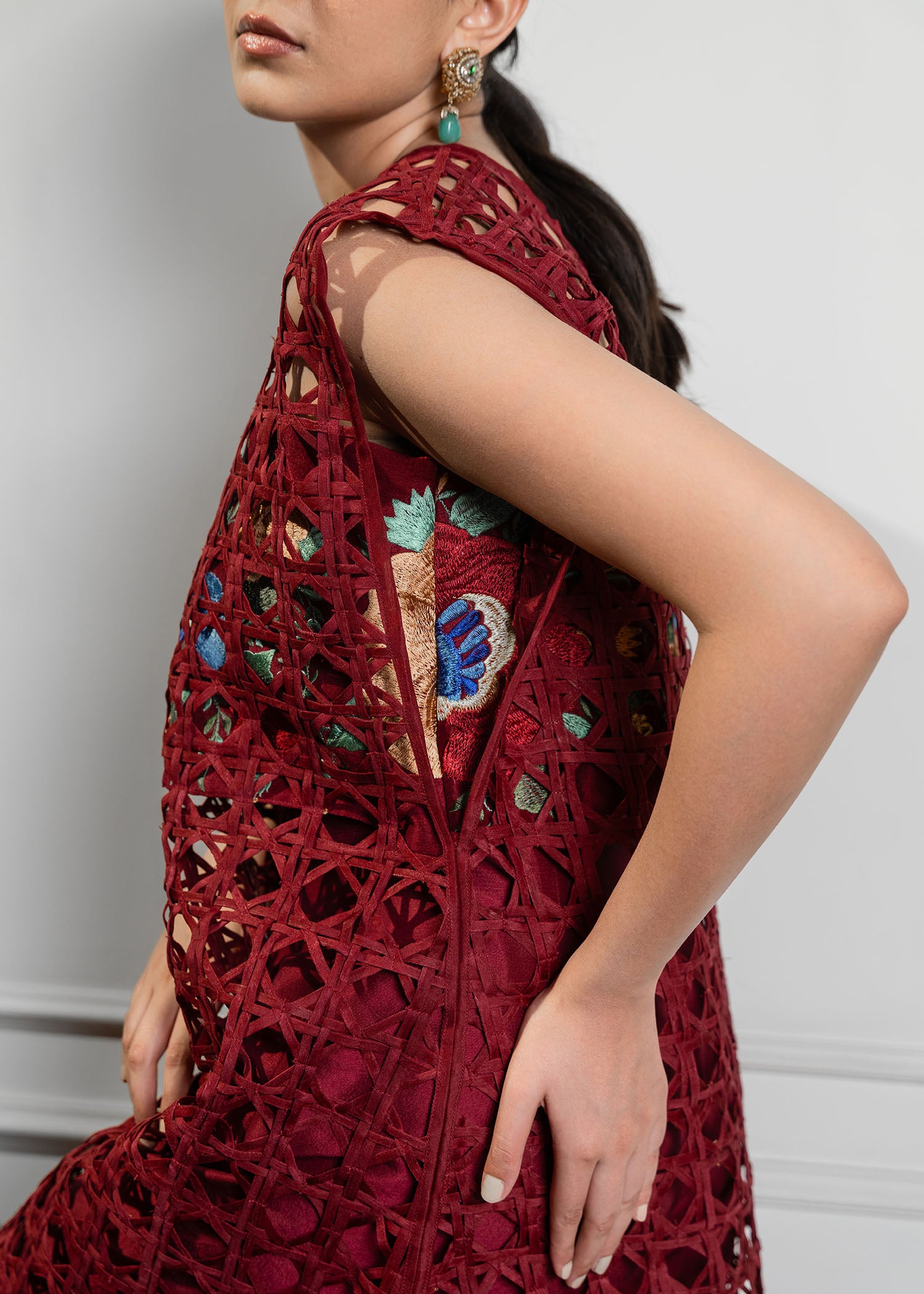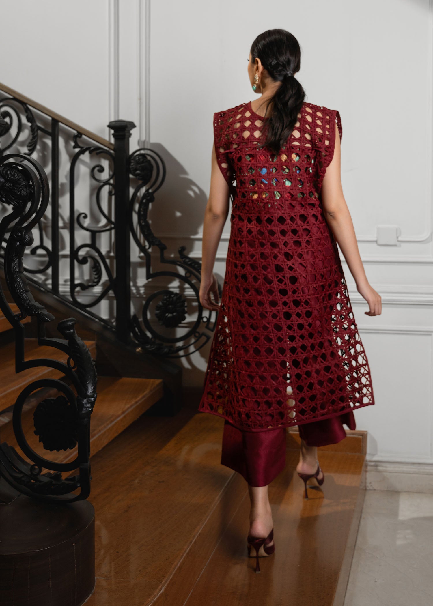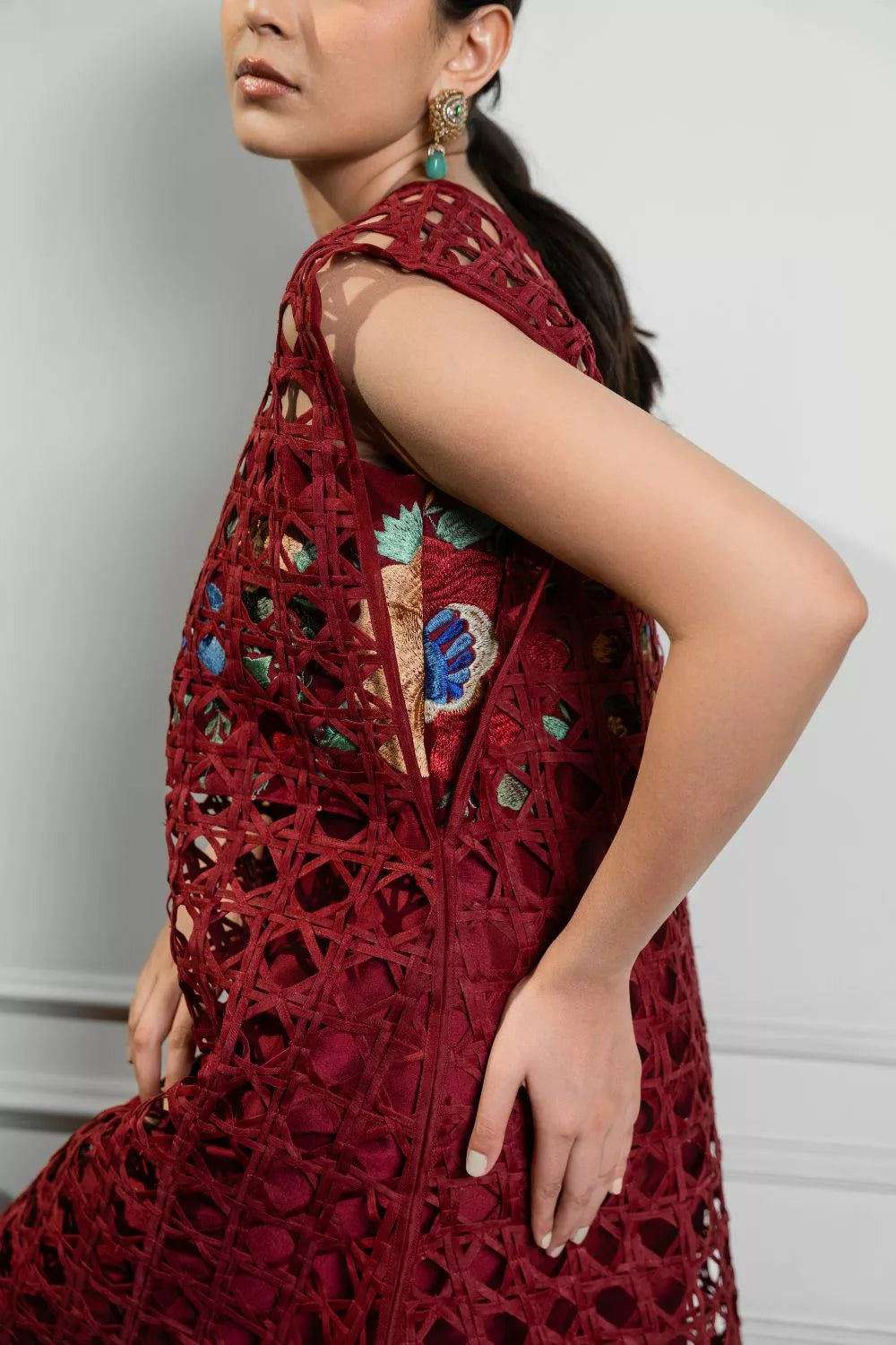 Tara in maroon features a handwoven lattice strip weave and a beautifully embroidered parsi gara bandeau in pure rawsilk, perfectly paired with luxe raw silk culottes. It’s all about making a statement!