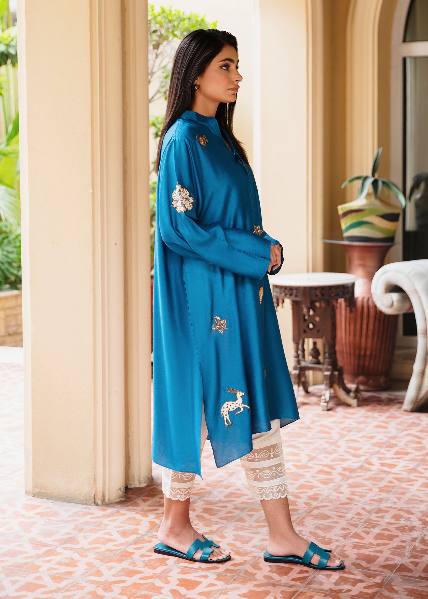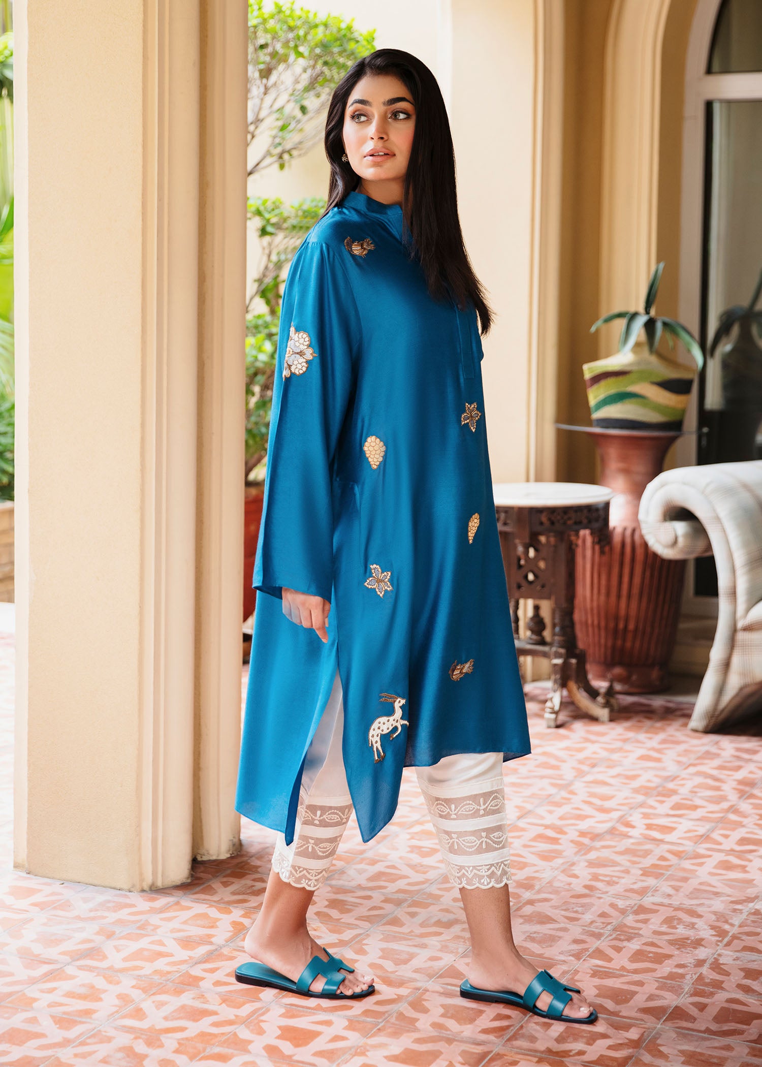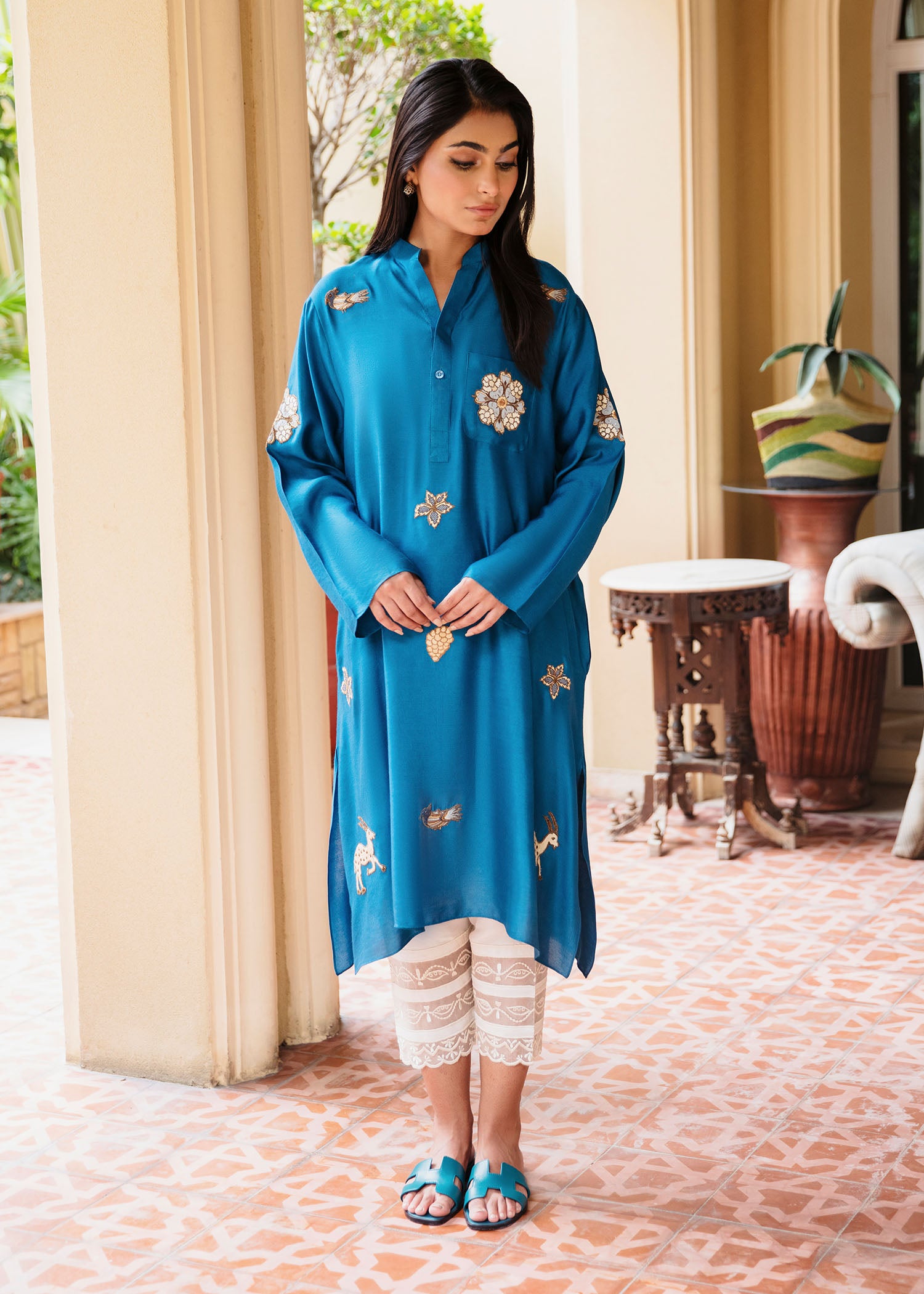 This elegant kurta features intricate shikargah embroidery that adds a touch of charm and sophistication. Crafted from luxurious khaddi silk, it offers a soft, lightweight feel, perfect for all-day wear. The vibrant blue hue paired with the unique embroidery detailing makes this piece a standout for casual or semi- formal occasions. Pair it with our skinny shalwar as seen here.
