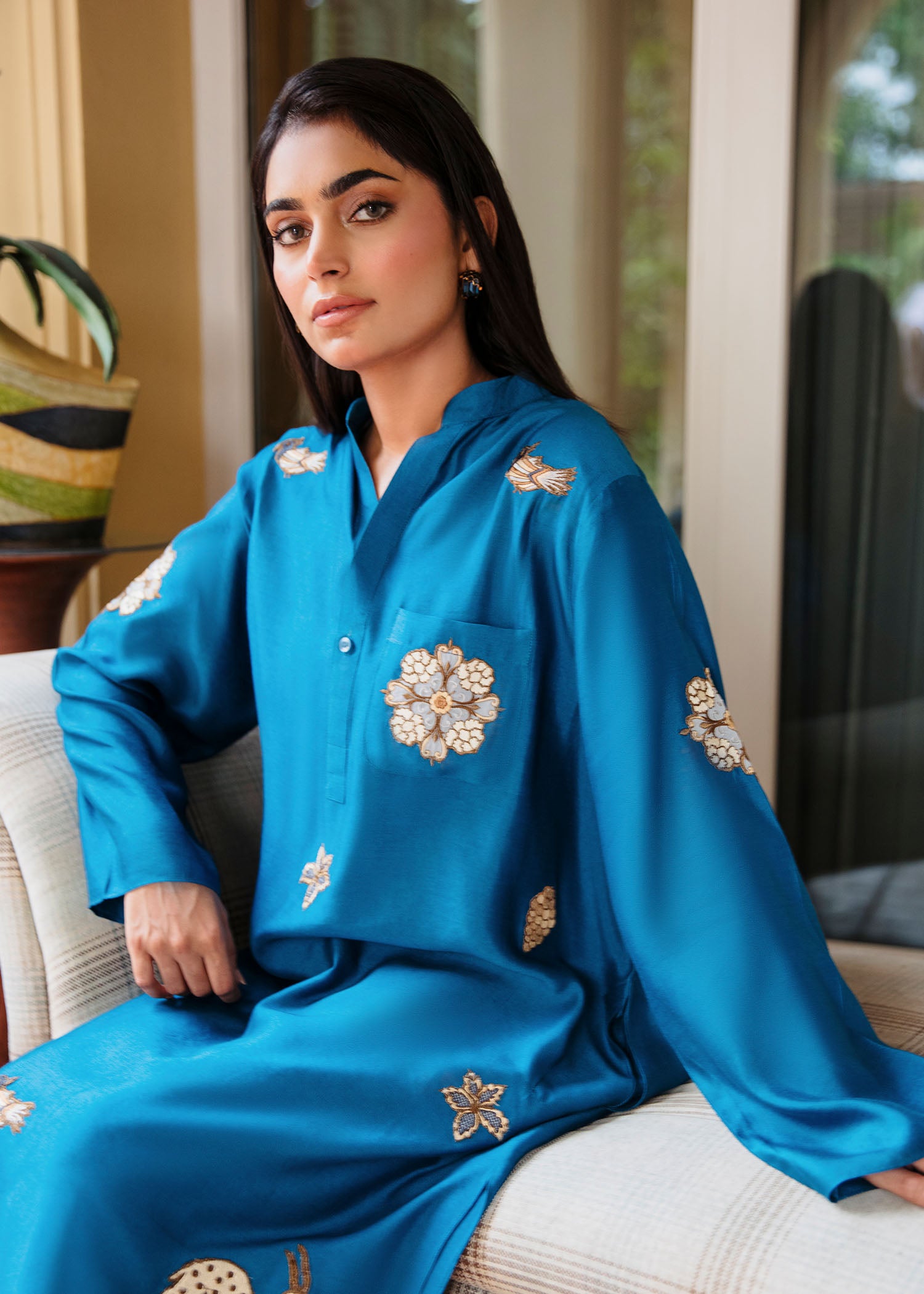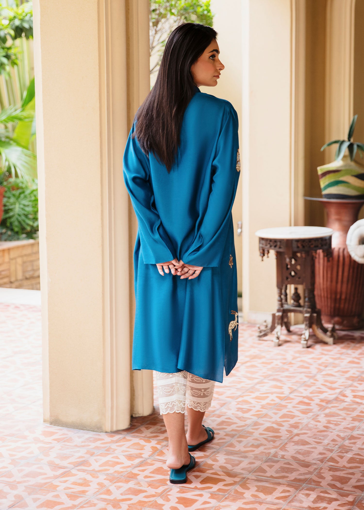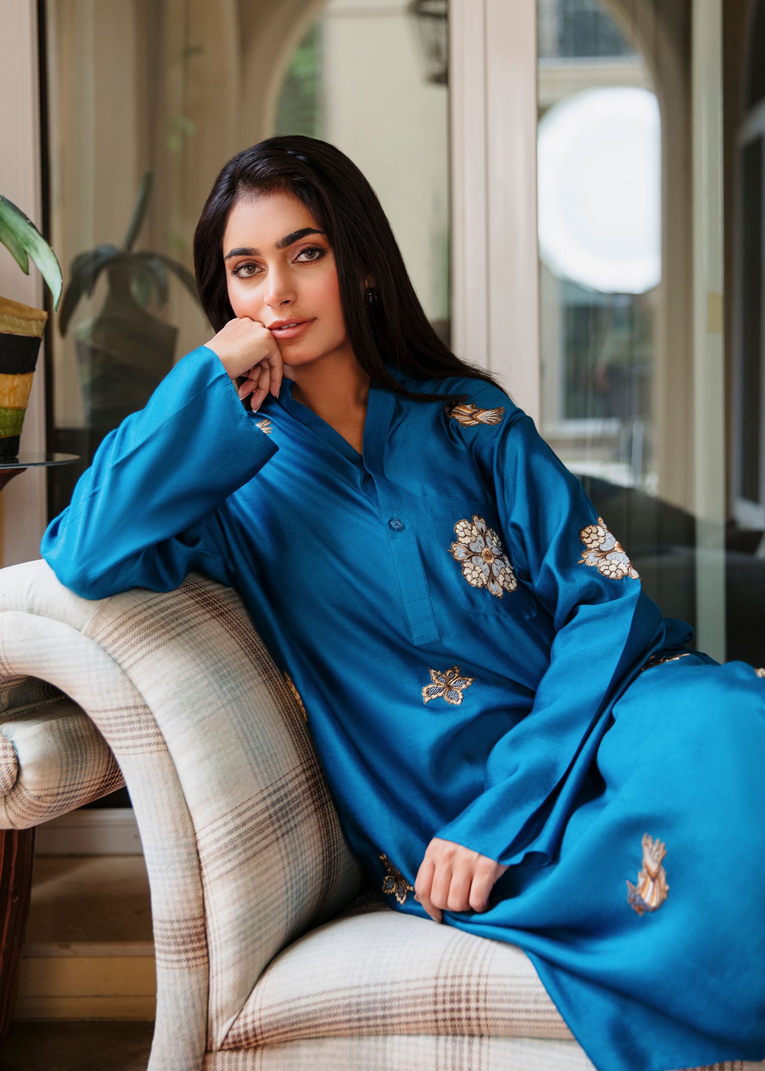 This elegant kurta features intricate shikargah embroidery that adds a touch of charm and sophistication. Crafted from luxurious khaddi silk, it offers a soft, lightweight feel, perfect for all-day wear. The vibrant blue hue paired with the unique embroidery detailing makes this piece a standout for casual or semi- formal occasions. Pair it with our skinny shalwar as seen here.