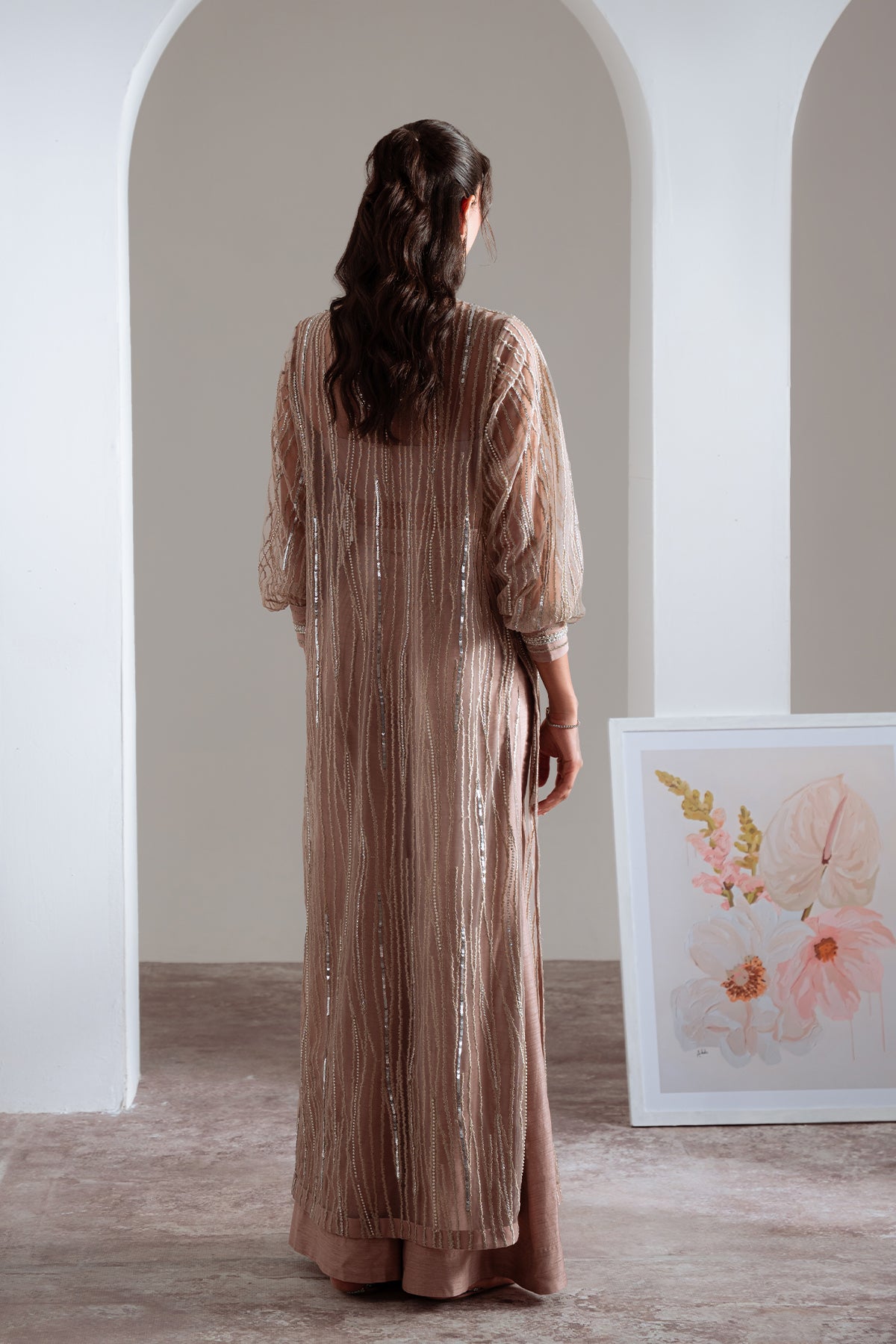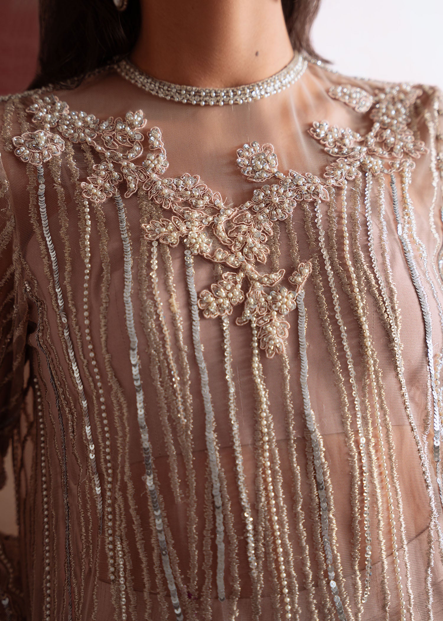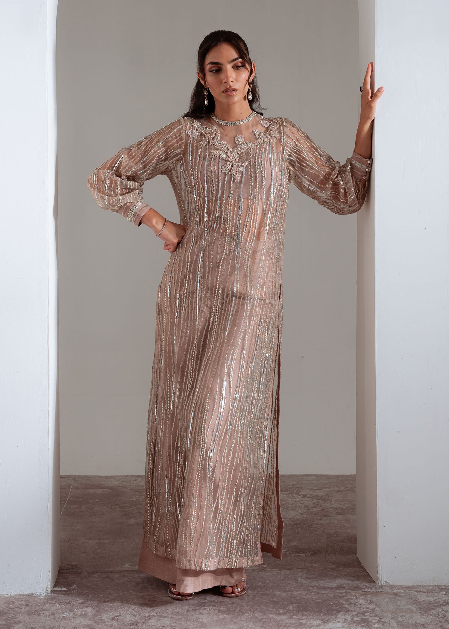 A radiant dusty rose–toned ensemble that embodies understated glamour. Crafted in sheer net, the straight silhouette is richly adorned with cascading lines of sequins and pearls, creating a fluid, light-catching effect. The neckline is delicately hand-embroidered with pearl and crystal floral motifs, adding a touch of timeless refinement. Paired with tonal trousers for a graceful finish, this look is the perfect choice for evening soirées, wedding festivities, and celebratory occasions.