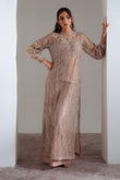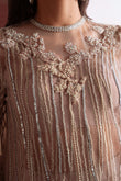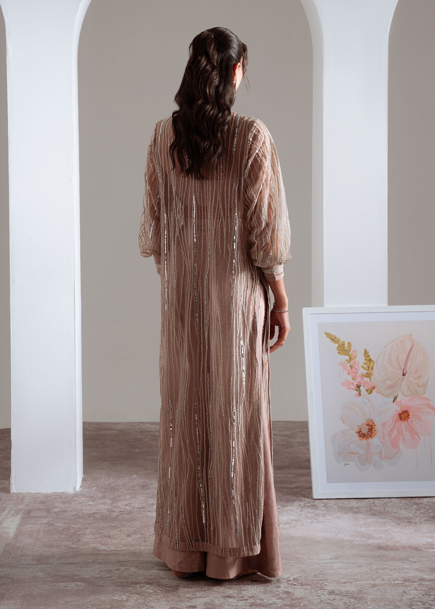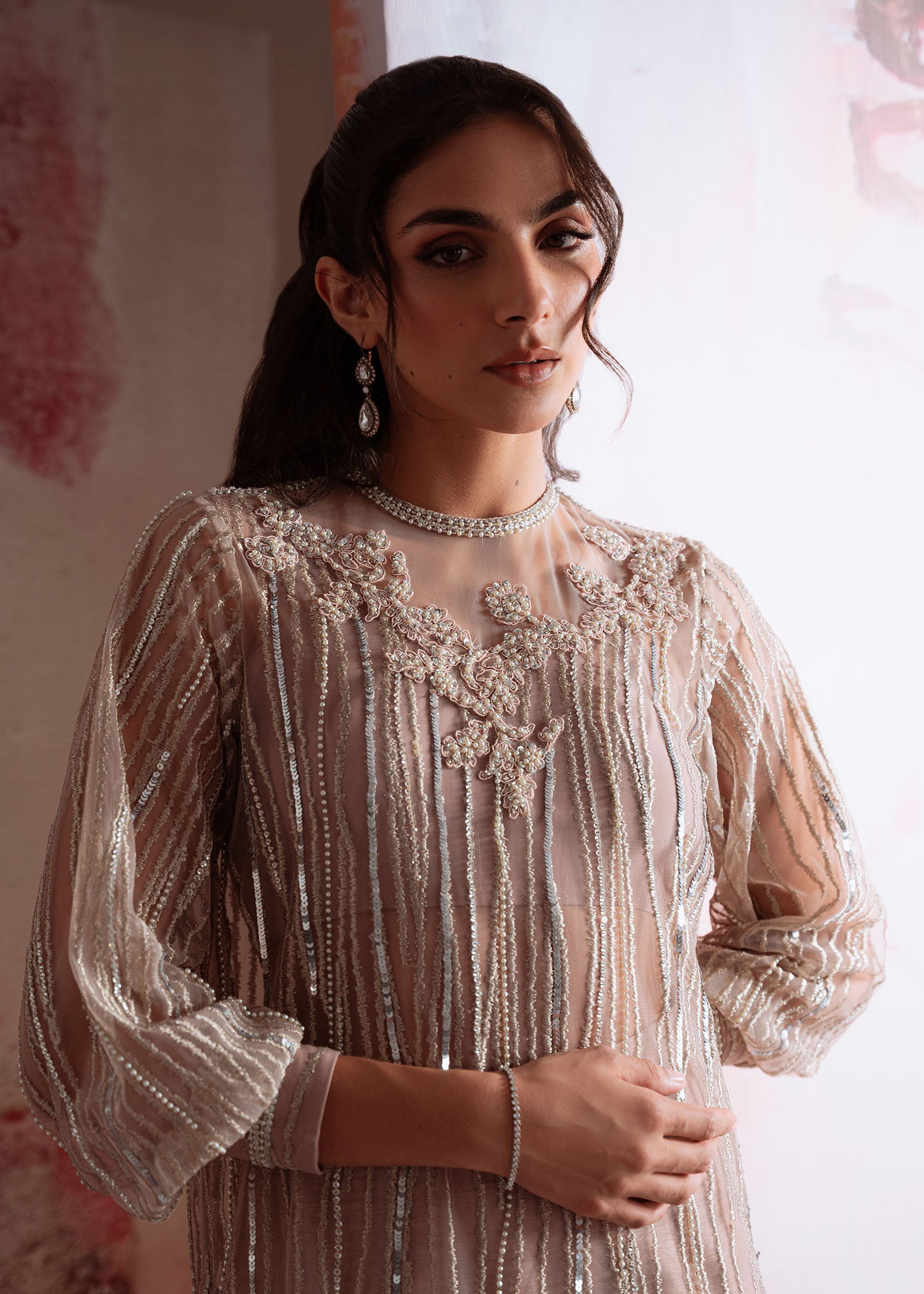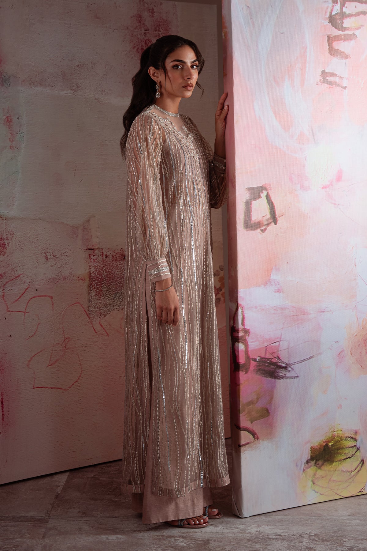 A radiant dusty rose–toned ensemble that embodies understated glamour. Crafted in sheer net, the straight silhouette is richly adorned with cascading lines of sequins and pearls, creating a fluid, light-catching effect. The neckline is delicately hand-embroidered with pearl and crystal floral motifs, adding a touch of timeless refinement. Paired with tonal trousers for a graceful finish, this look is the perfect choice for evening soirées, wedding festivities, and celebratory occasions.